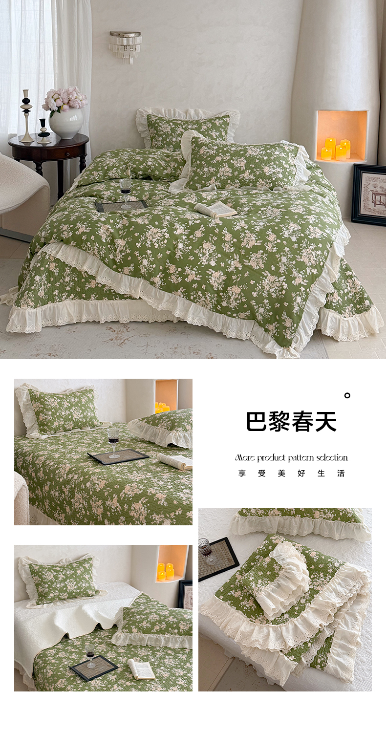 2022新款40S纯棉水洗棉全棉荷叶边夹棉床盖三件套青草绿,青草绿