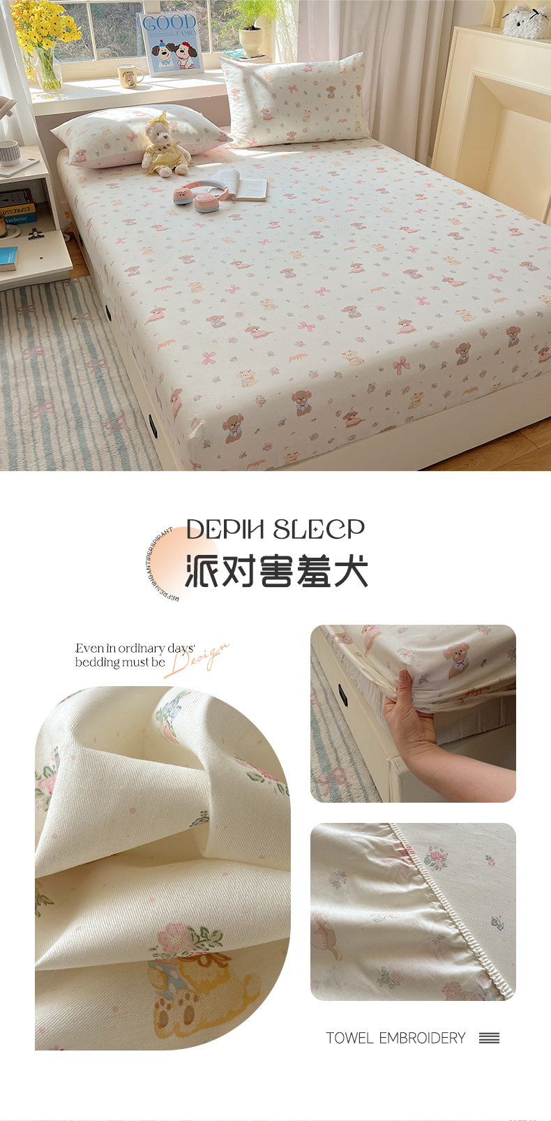 六巷胡同 2026新款40支全棉13070卡通单品床笠 草莓甜心犬