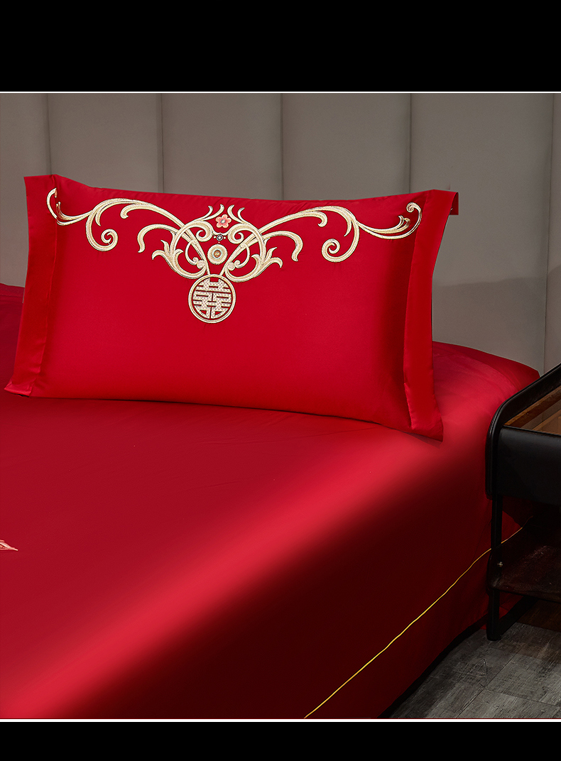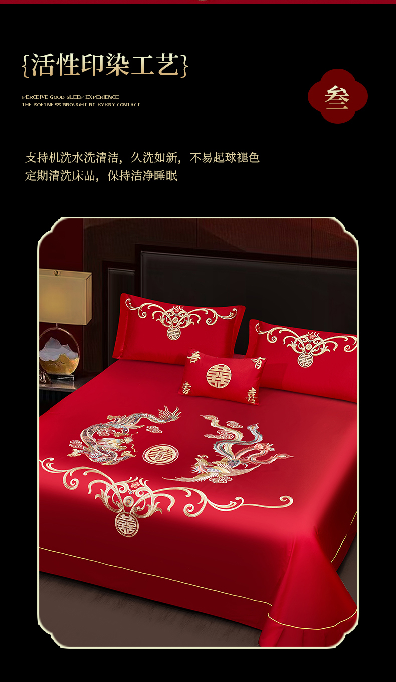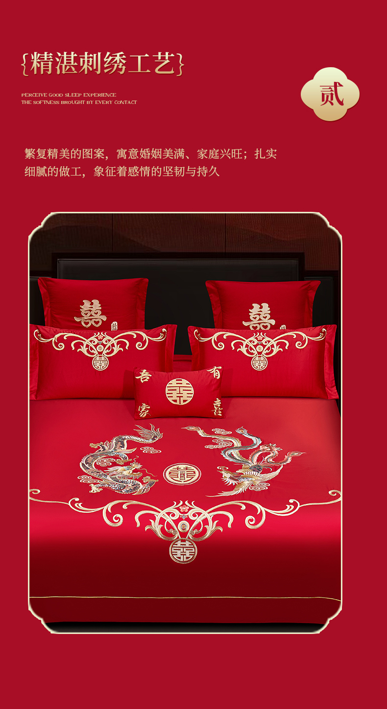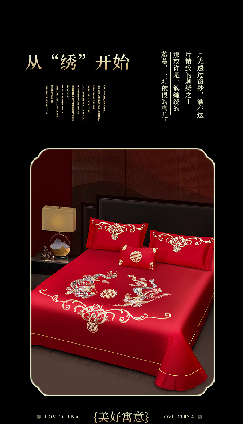 商品名称:浩情国际婚庆供货中心 2026新款长绒棉100%纯棉全棉结婚刺绣婚庆床单单件绣花纯色三件套单品婚庆枕套长期供货 提供买家秀 龙姿凤彩-绣花款