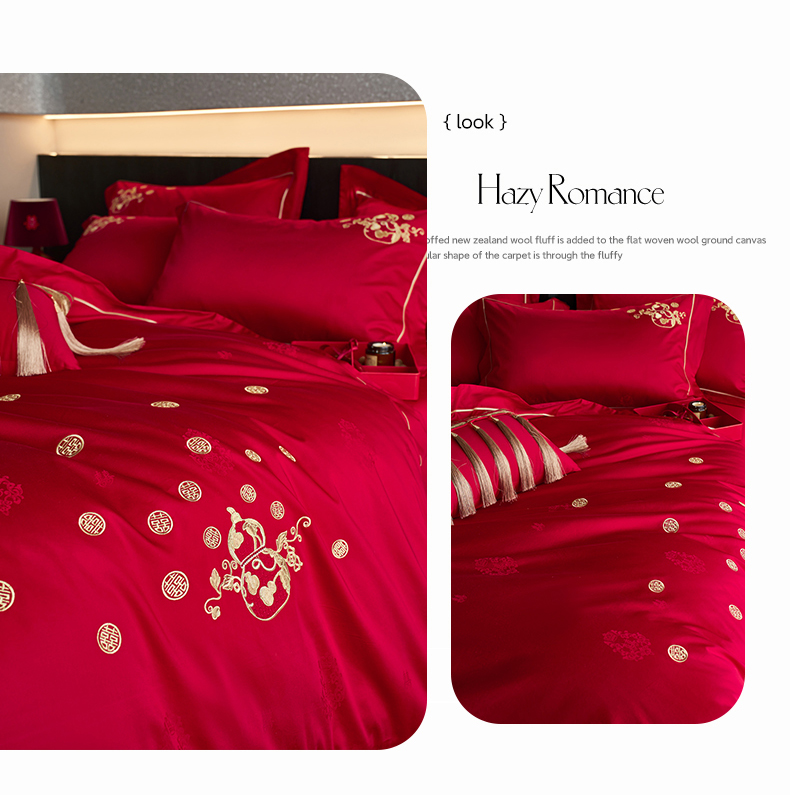 商品名称:宏羽纺家纺 2025新款小红书热卖款仿丝棉提花时尚婚庆系列四件套多件套 金凤玉露