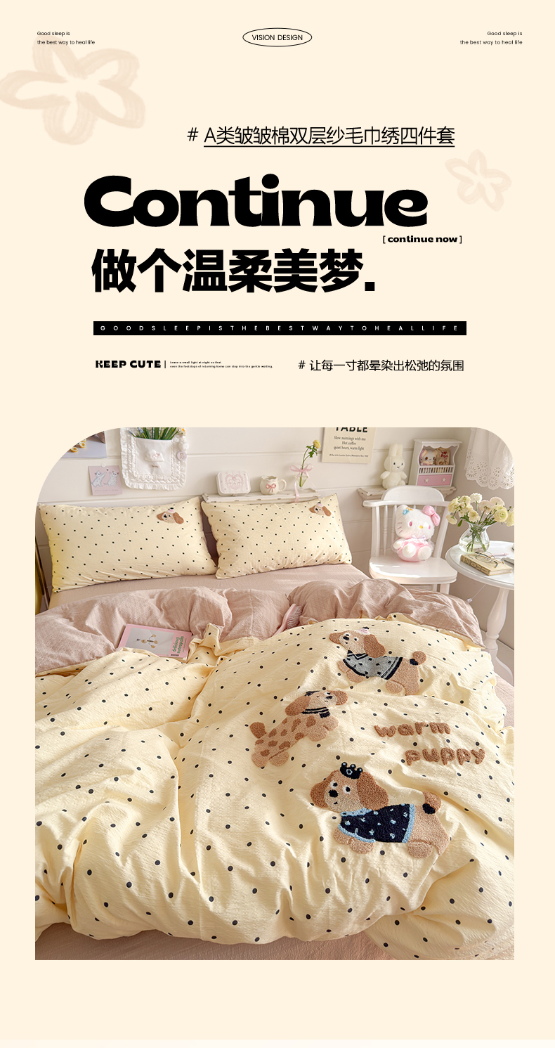 (总)卡斯诺 2025新款芦荟棉四件套7月新花型,萌萌狗,布丁狗,丛林猫,蝶恋花,粉色小熊,开心树,绿野仙踪,美好时光,萌兔宝贝,迷恋,喵星人,墨迹,甜心汪汪,旺旺小狗,幸运女孩,熊猫日记,着迷