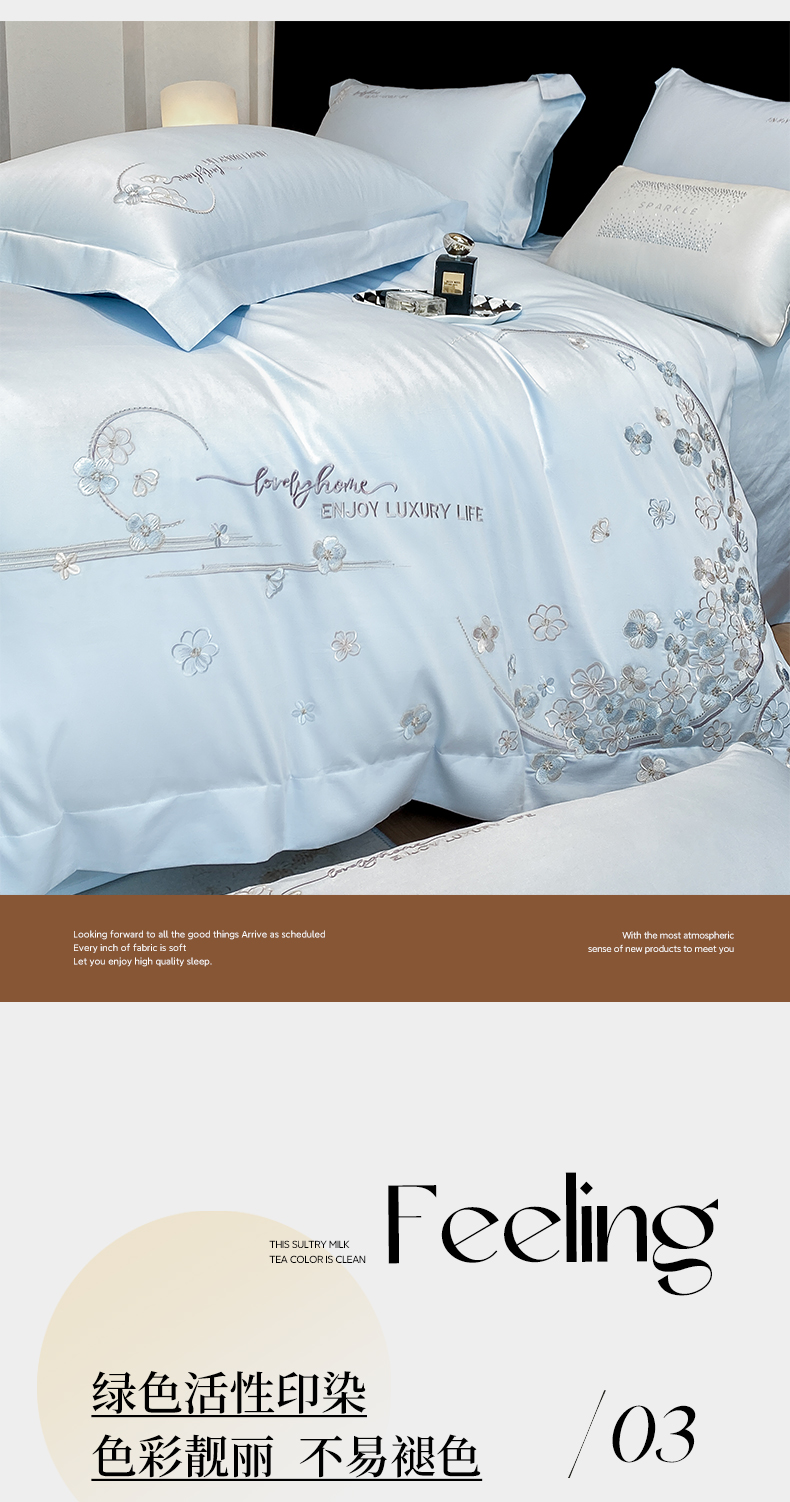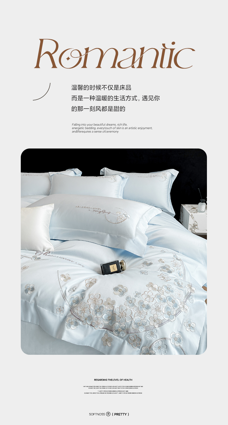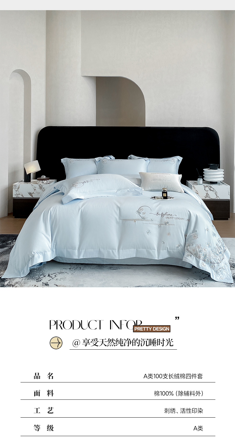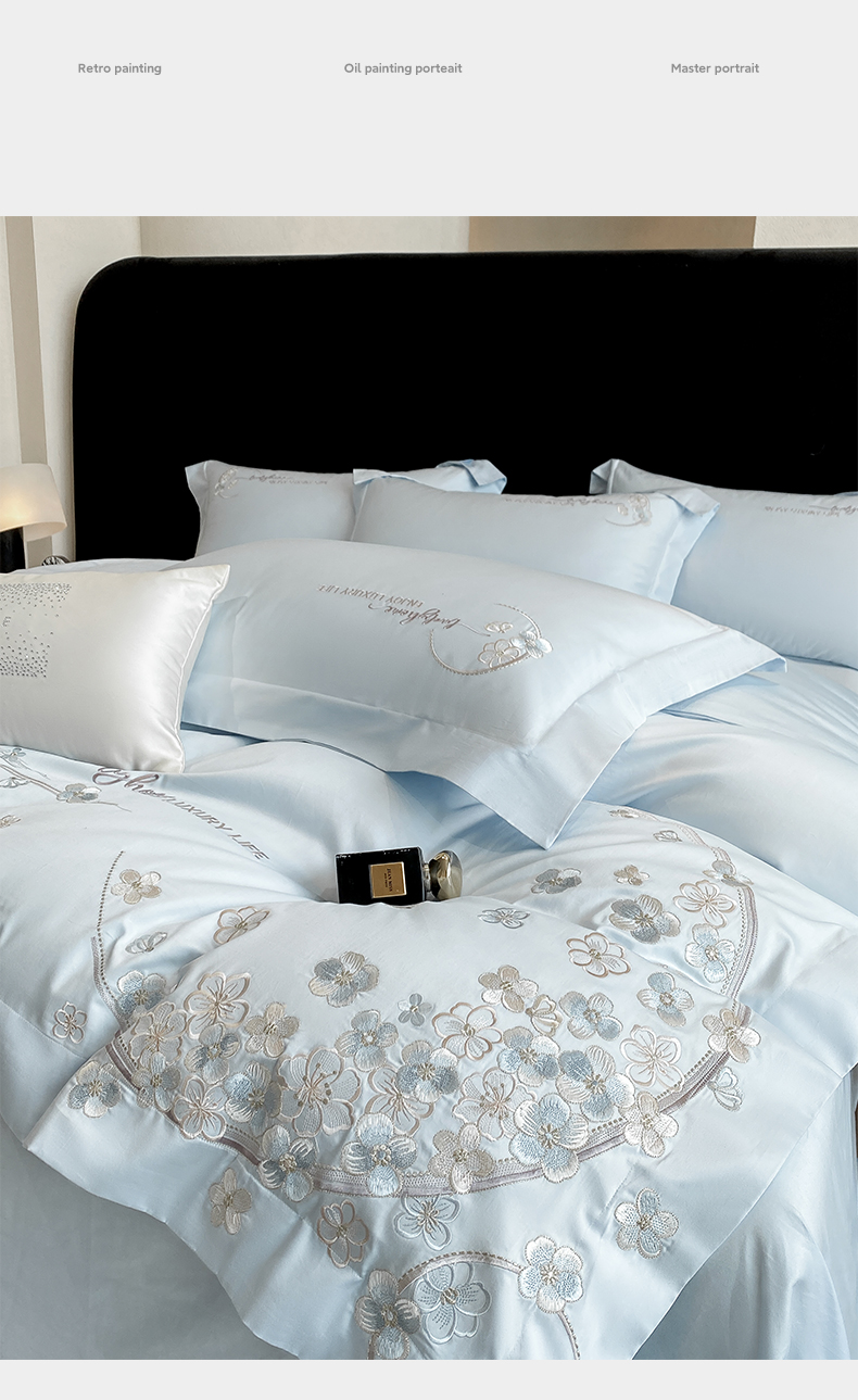 欣宜家纺 2026春夏新款60支A类新疆长绒棉刺绣轻奢风四件套 樱花-天天蓝