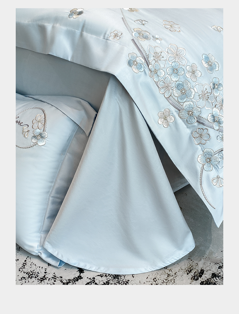 商品名称:欣宜家纺 2026春夏新款60支A类新疆长绒棉刺绣轻奢风四件套 樱花-天天蓝