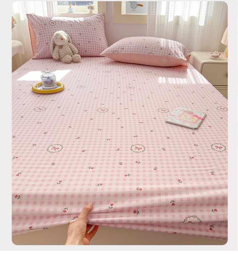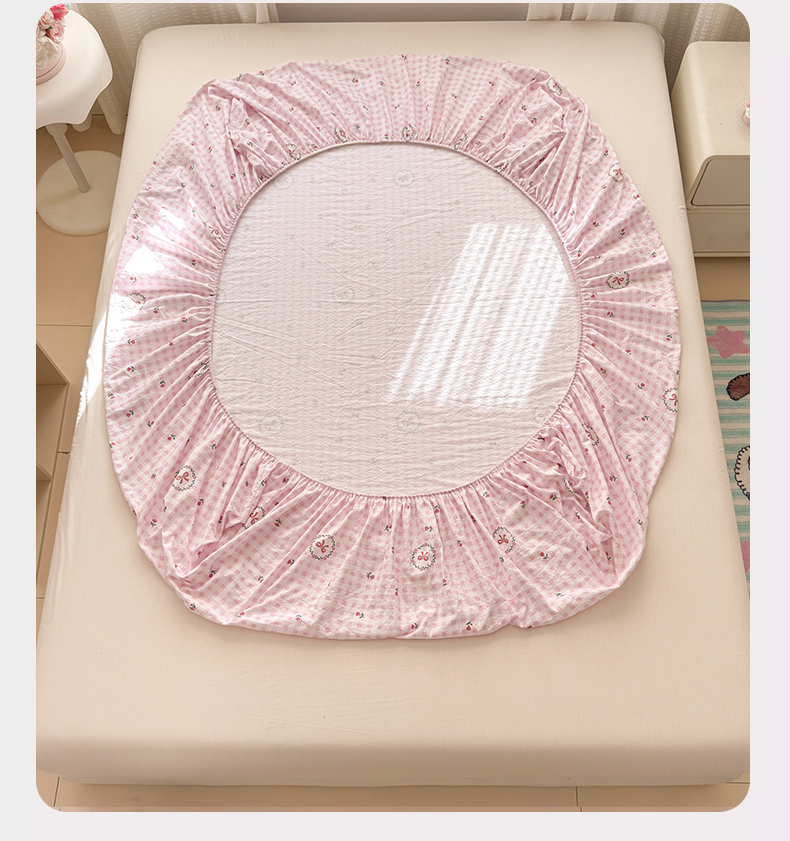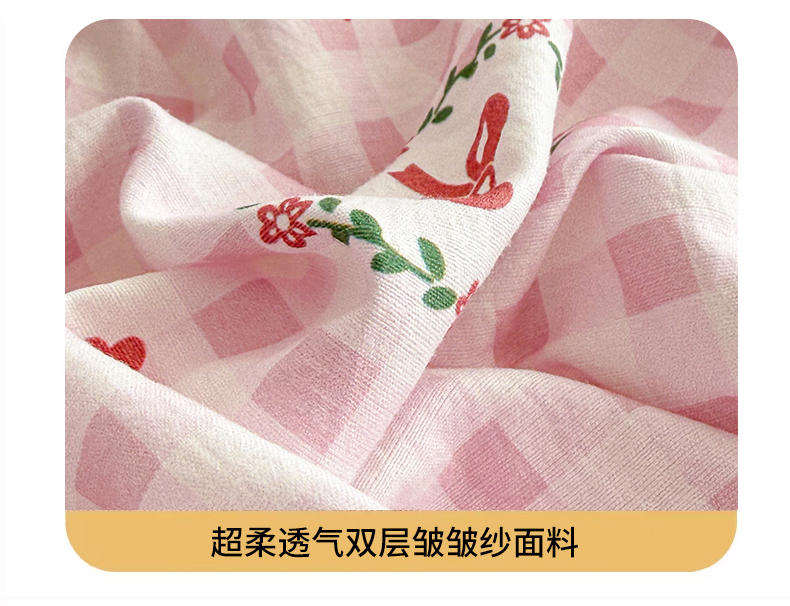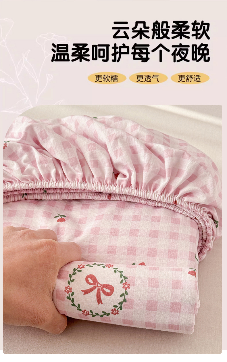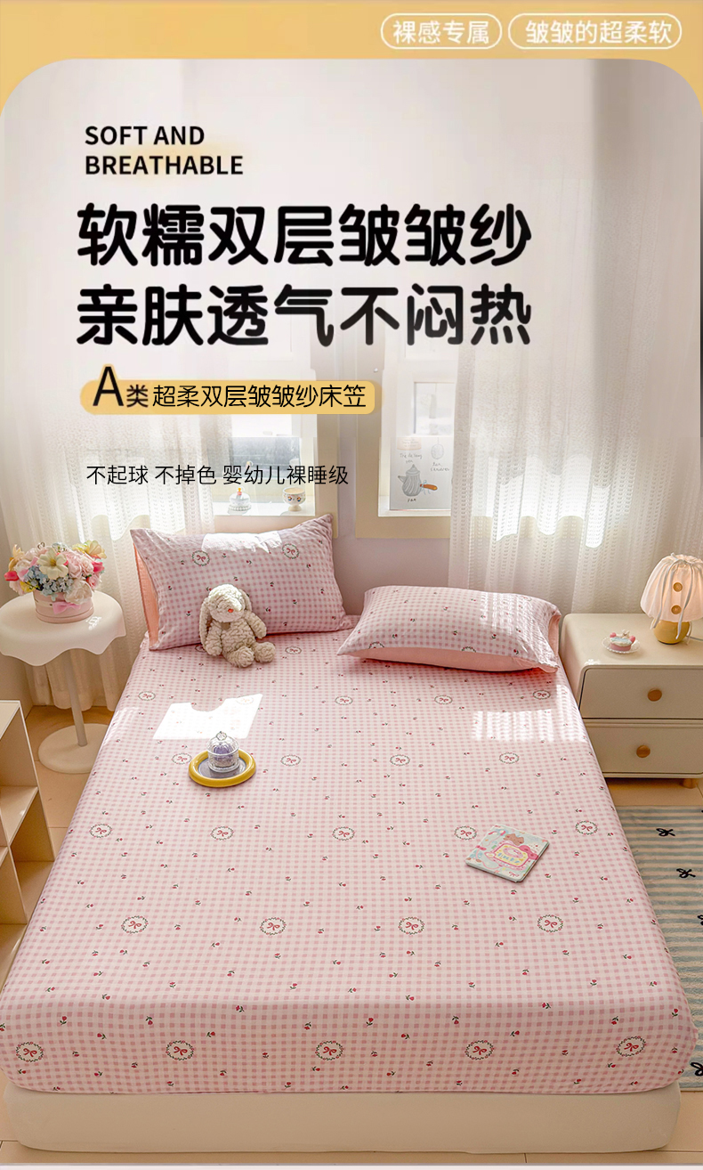 • 91家纺网 家纺一手货源 找家纺 丽美人家纺 2026新款A类柔软双层皱皱纱印花单床笠床笠单件 格子蝴蝶结