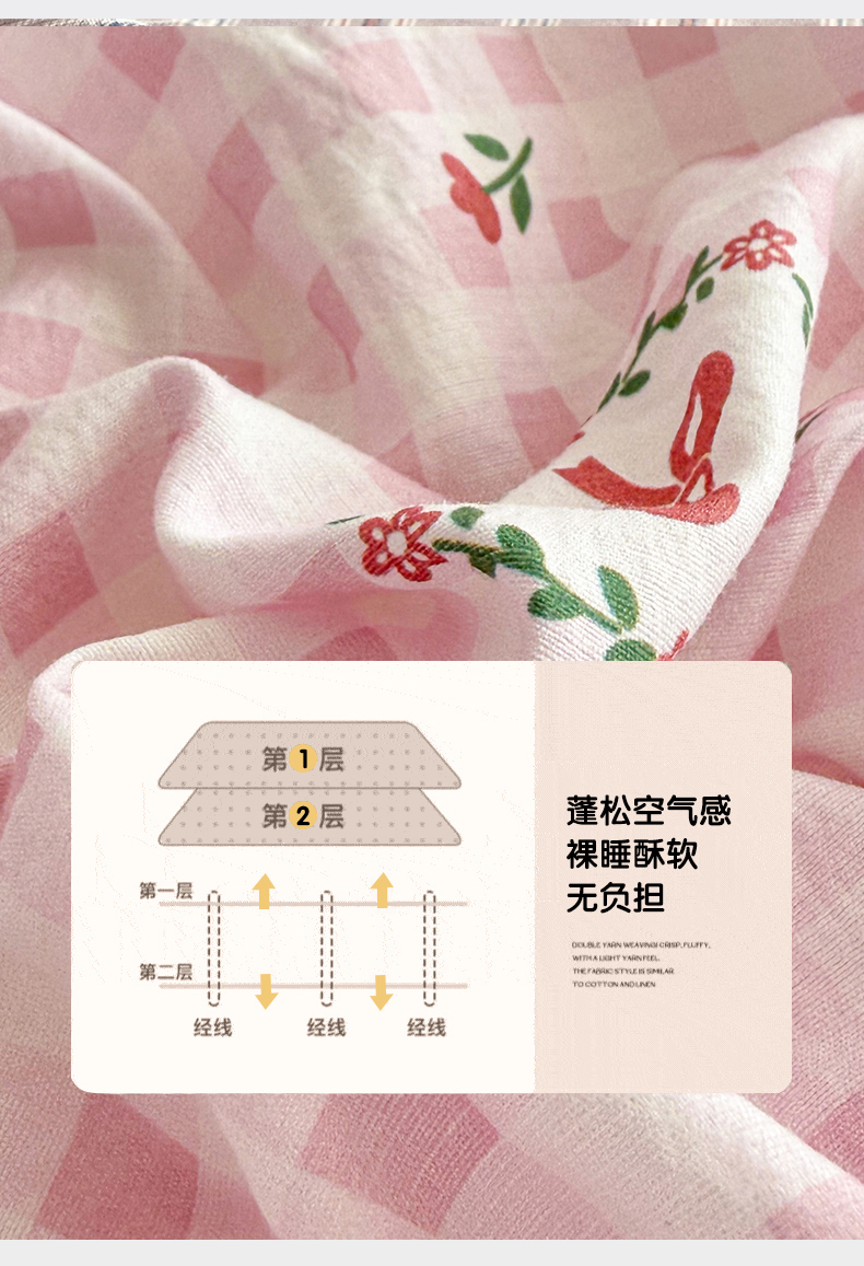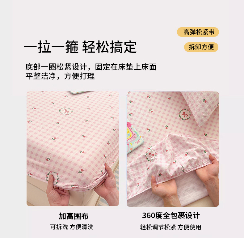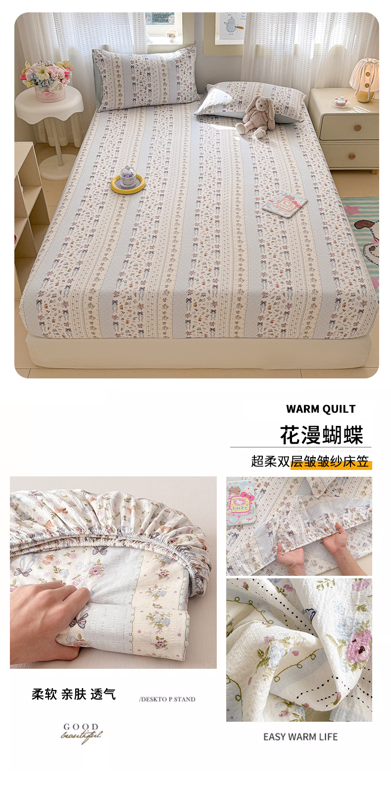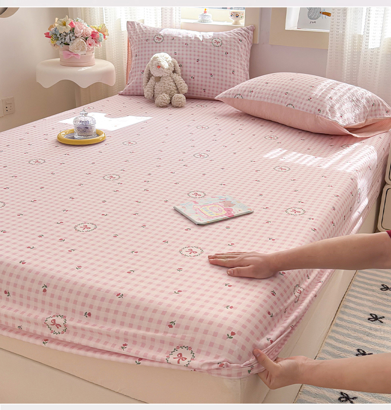 • 91家纺网 家纺一手货源 找家纺 丽美人家纺 2026新款A类柔软双层皱皱纱印花单床笠床笠单件 格子蝴蝶结