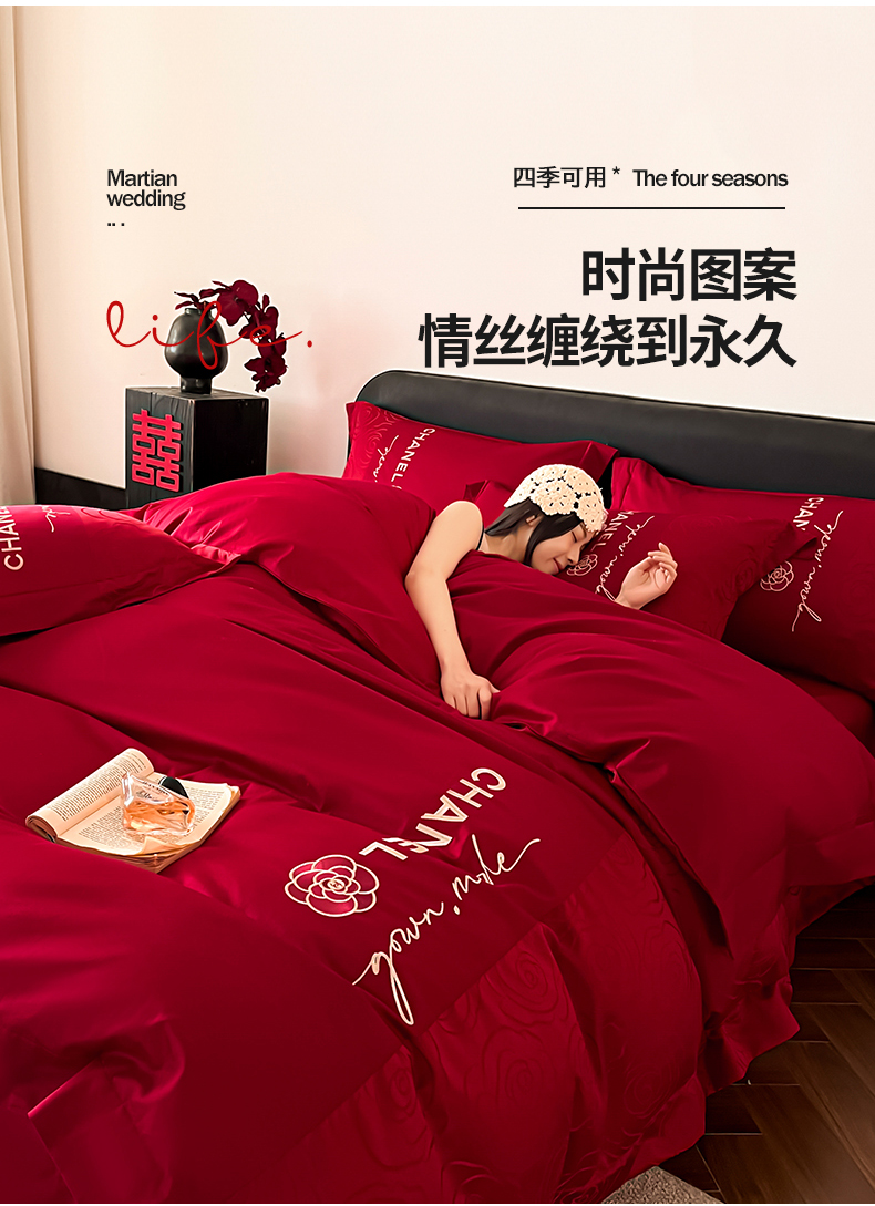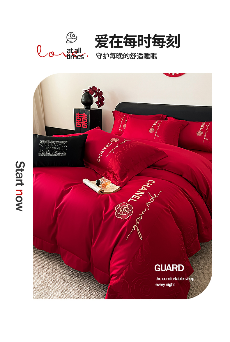 置顶家纺 2026新款喜至亲肤提花刺绣婚庆系列四件套 初遇-酒红