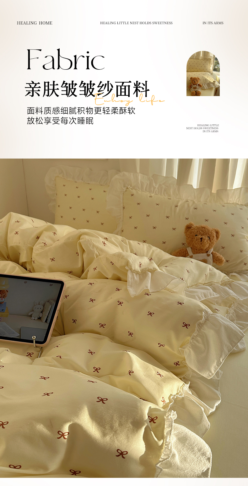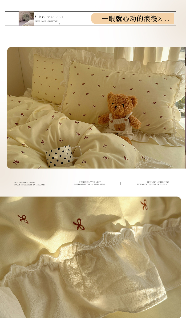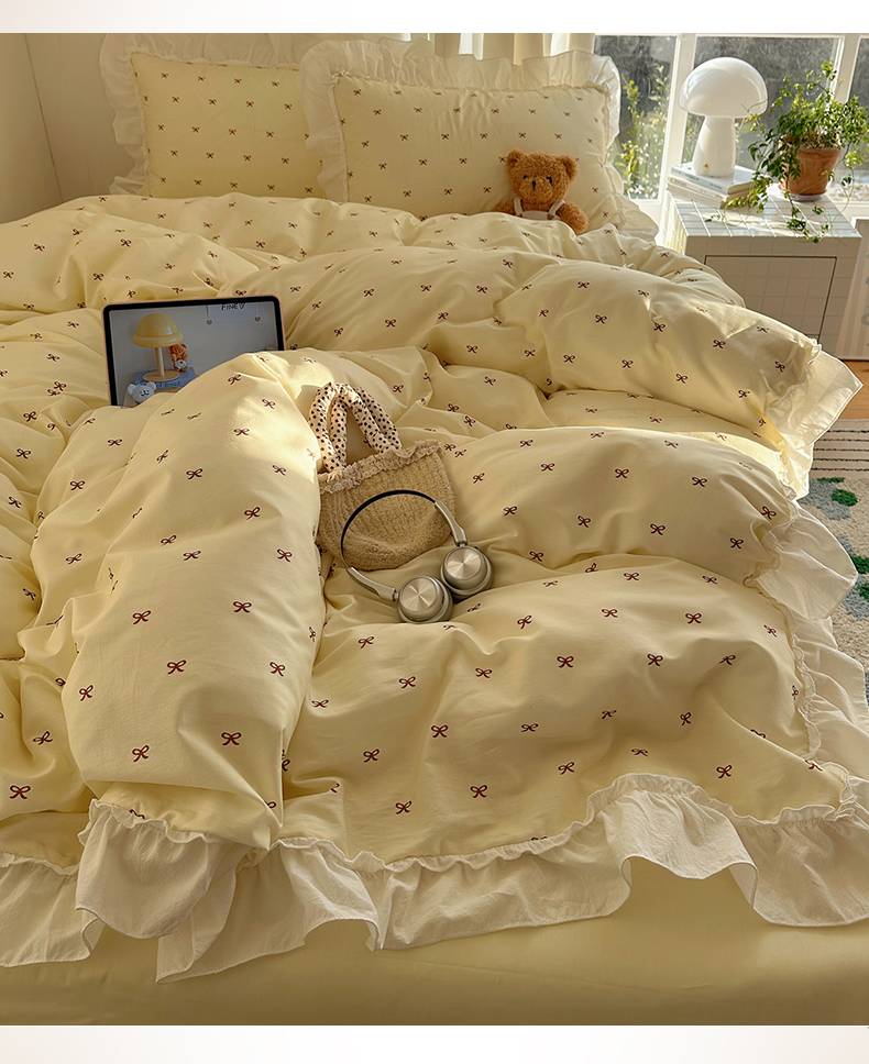 当前位置: 91家纺网 > 商品网购 > 床品套件 > 四件套 > 其它四件套 > (总)盼季家纺 2026春夏小清新日韩蝴蝶结奶油花边床上用品四件套宿舍三件套