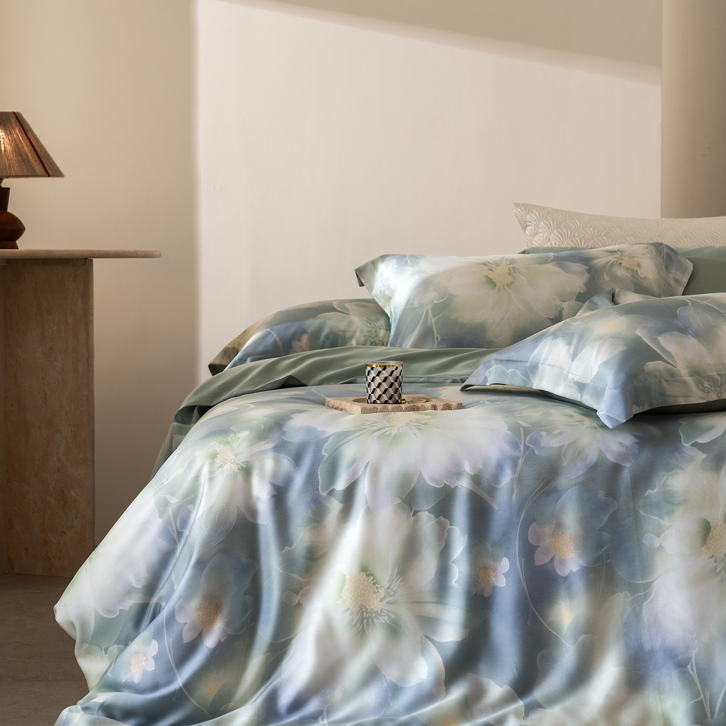 (总)佳汐蓝家纺 2025 春夏新品60支兰精天丝数码印花四件套-小苍兰花语,白,粉,蓝