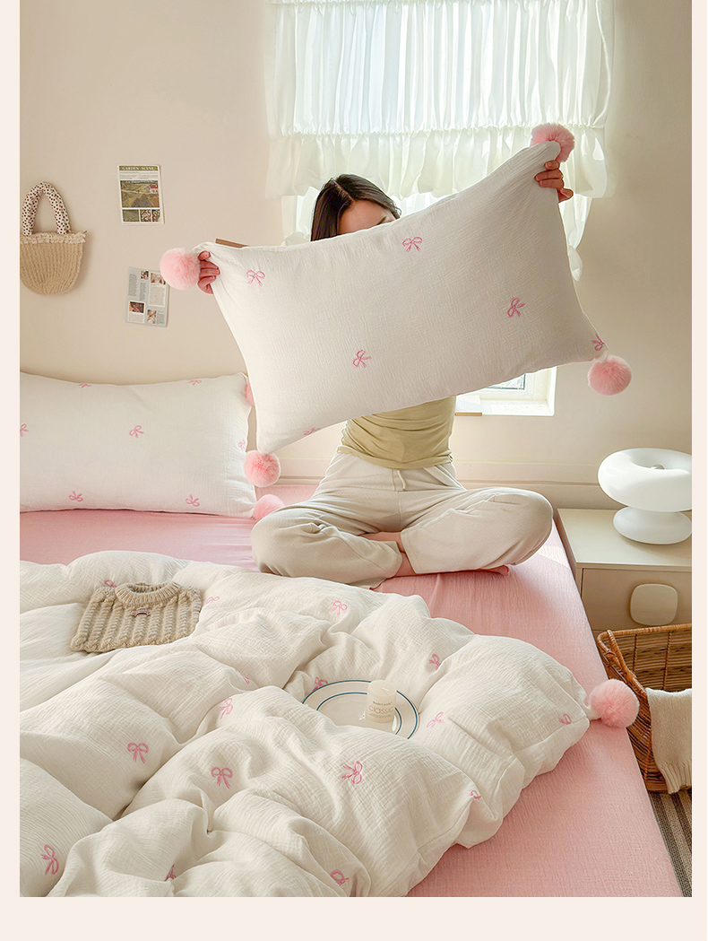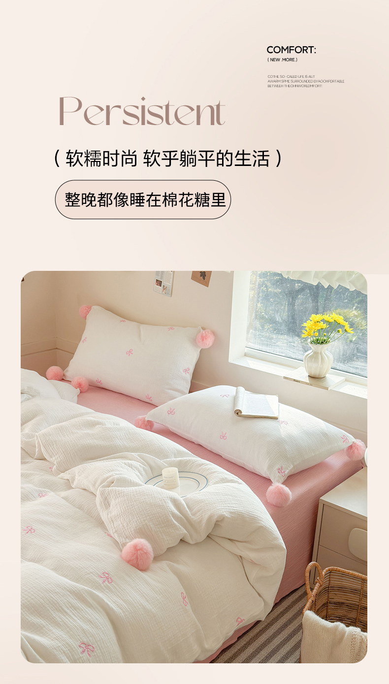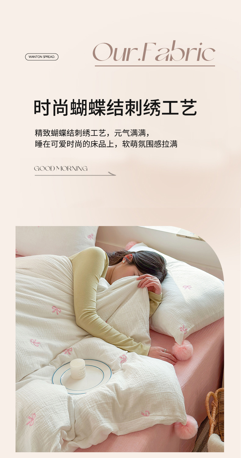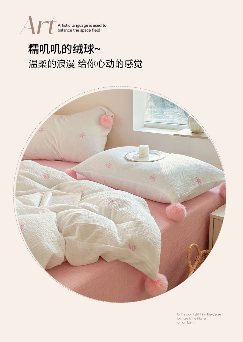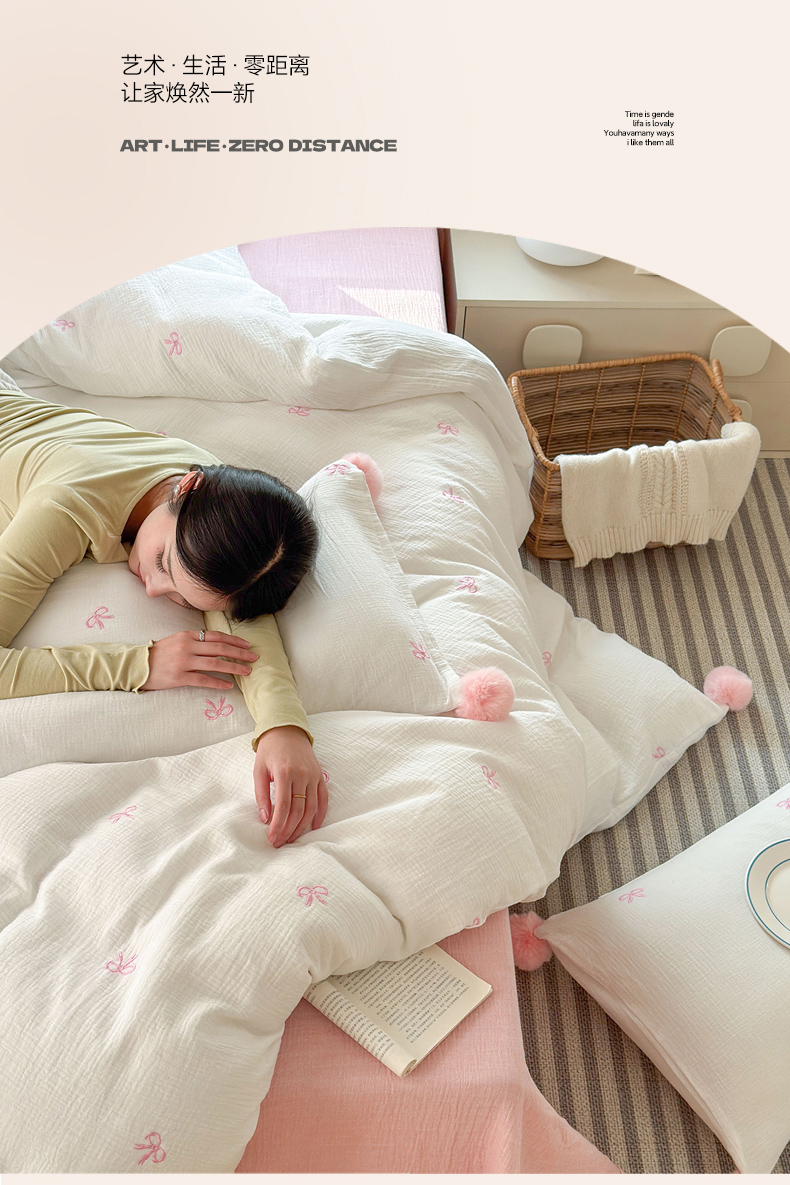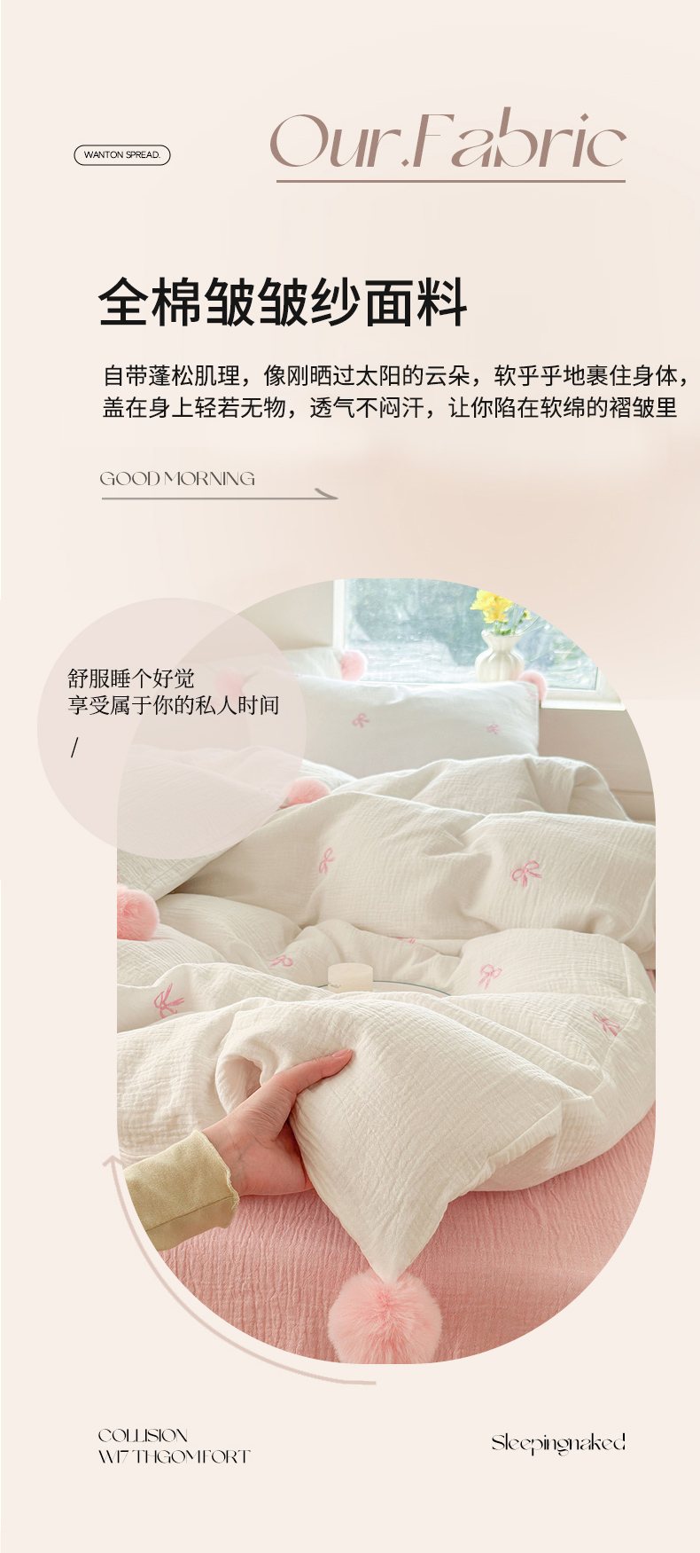 当前位置: 91家纺网 > 商品网购 > 床品套件 > 四件套 > 全棉普通四件套 > 木楌家居 2026年新款全棉纯棉皱皱纱四件套-云朵蝴蝶结系列 云朵蝴蝶结-落樱粉