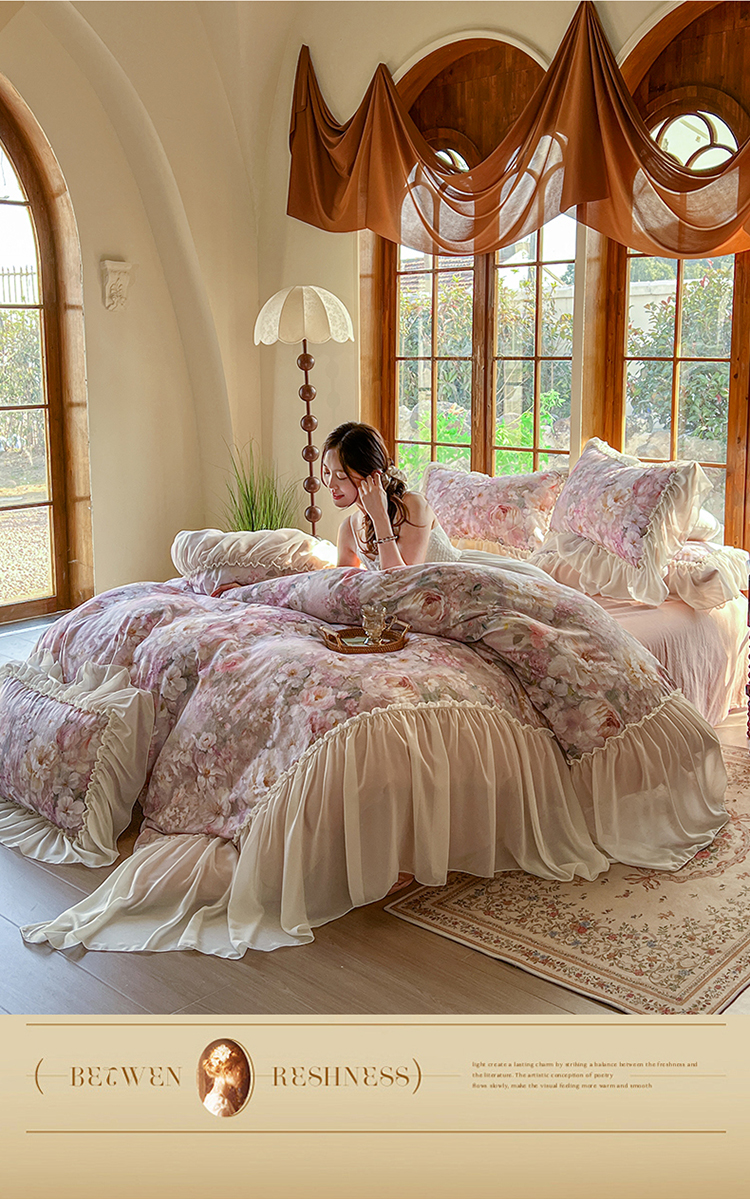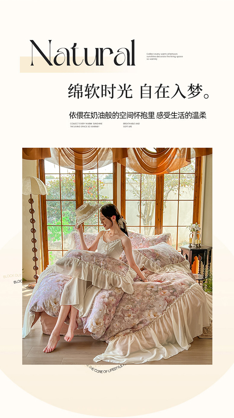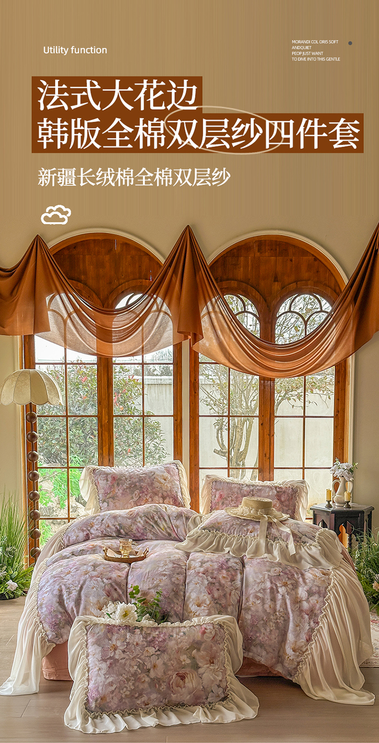商品名称:2026高端韩版法式公主复古油画风全棉纯棉双层纱四件套赫本浪漫荷叶花边仙女风全棉双层纱四件套床上用品被套床单床笠 采薇