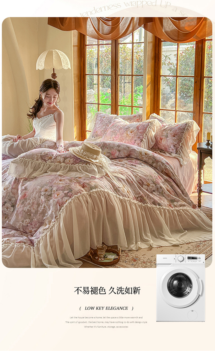 (总)【苏东来】2026韩版蕾丝花边纯棉全棉双层纱四件套印花纯棉四件套法式赫本木耳花边全棉公主双层纱四件套,紫薇花,夕颜,海盐气泡蓝,白玫瑰,晴空,香槟玫瑰,白茶,暗香,玫瑰庄园,甜心小兔粉,蜜桃玫瑰,小苍兰,小梨漫,春意浓,西海岸蓝,西海岸紫,马卡龙,春日女孩,兔软软,樱花,花漾甜心,紫苏,乌梅子酱