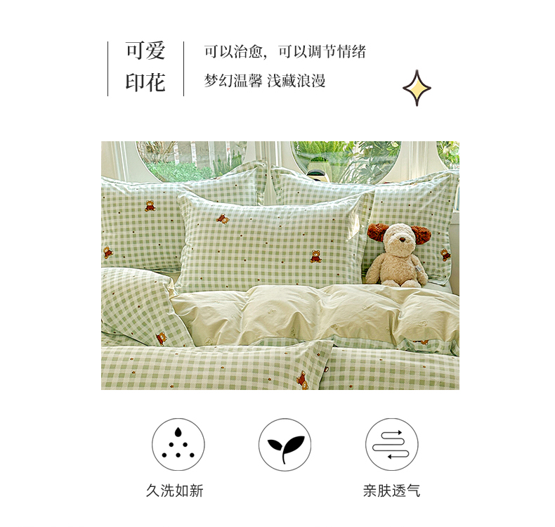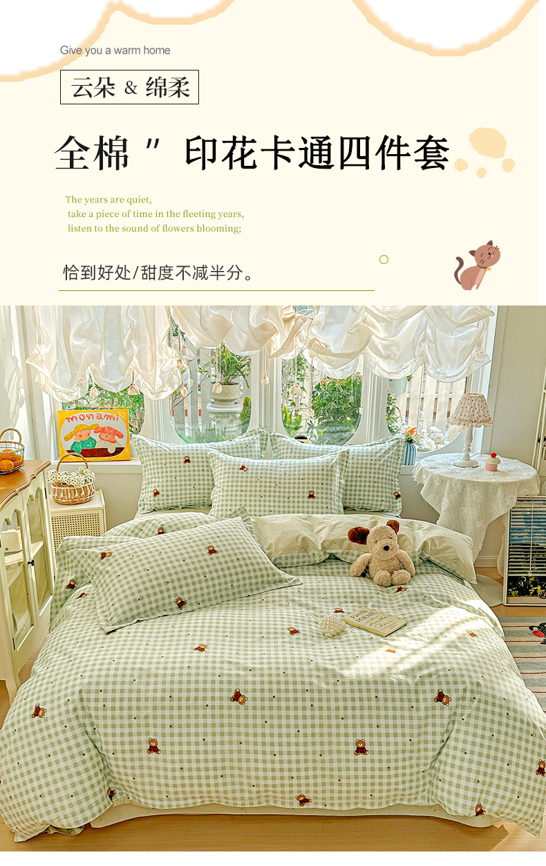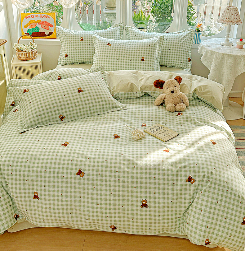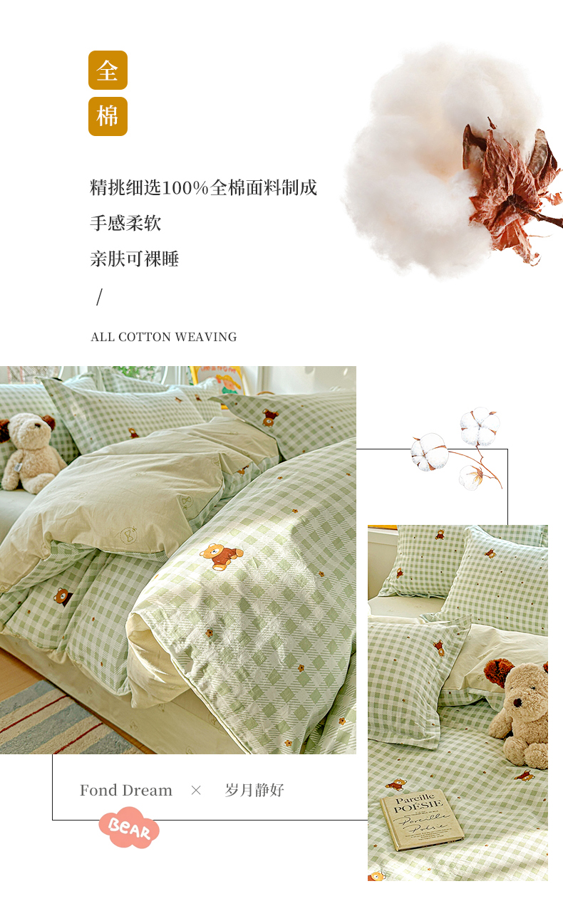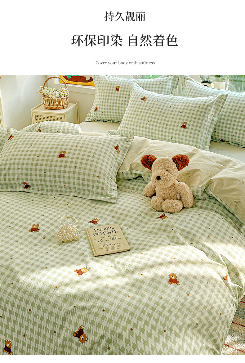 当前位置: 91家纺网 > 商品网购 > 床品套件 > 四件套 > 全棉普通四件套 > 佳汐蓝家纺 2026新款全棉纯棉加厚13376印花四件套 绿格小熊