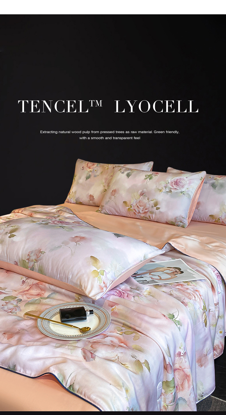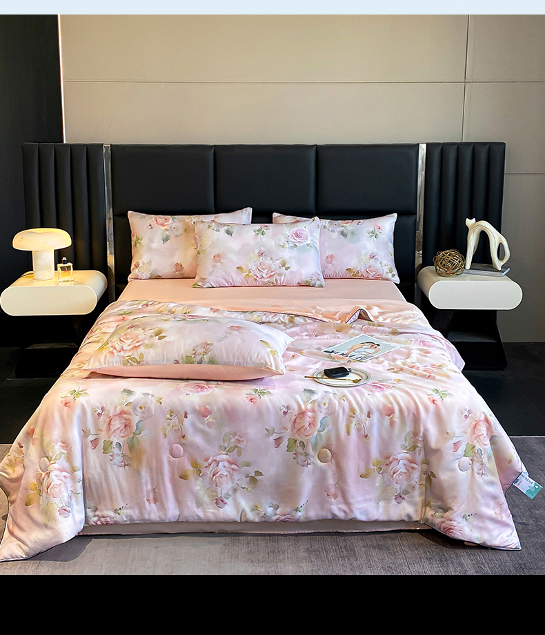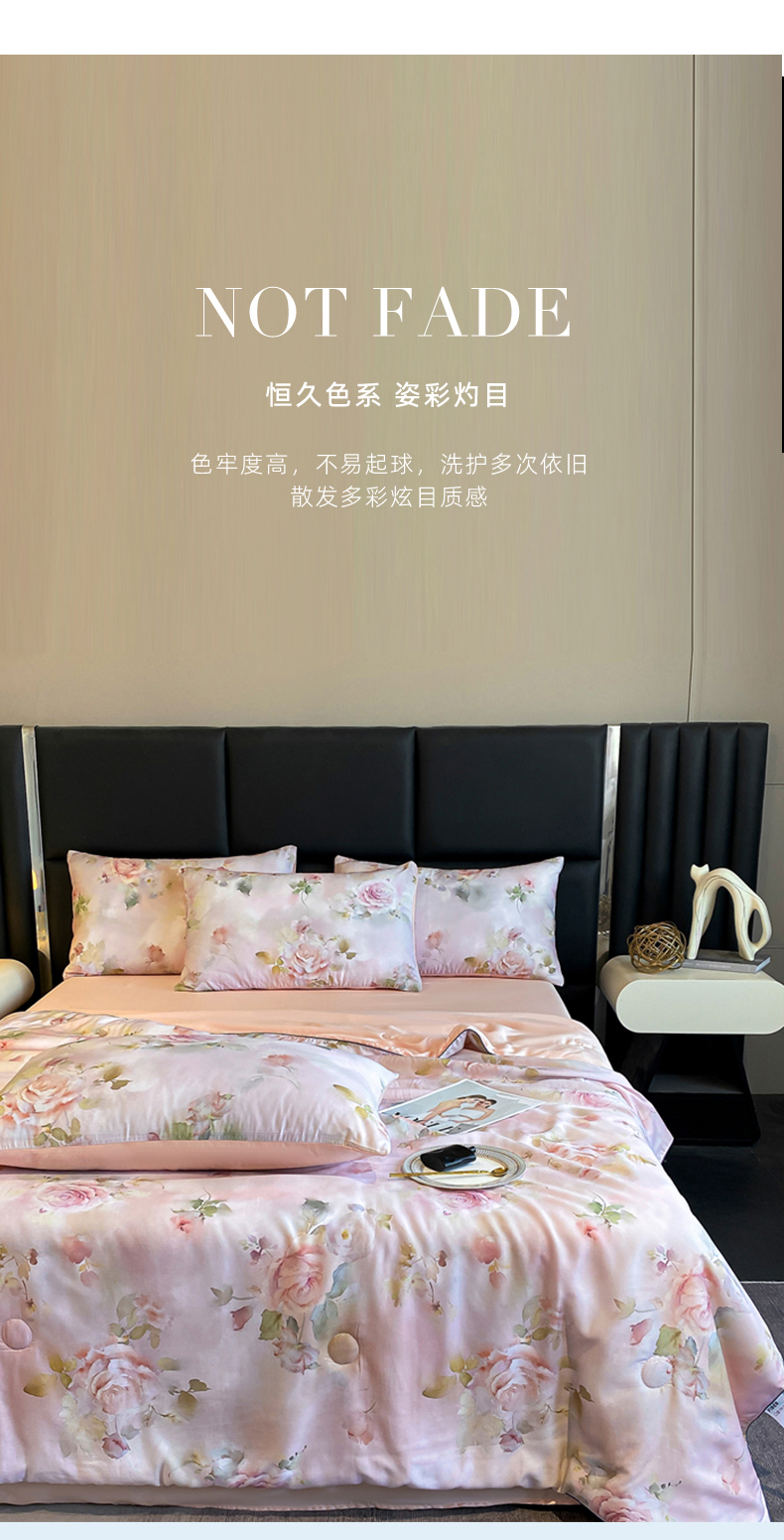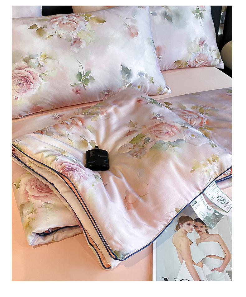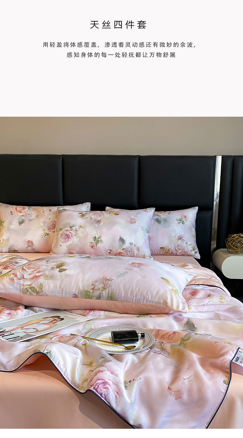 商品名称:绒棉世家 2026新款100%莱赛尔天丝面料数码印花天丝夏被四件套 陌上花开-粉