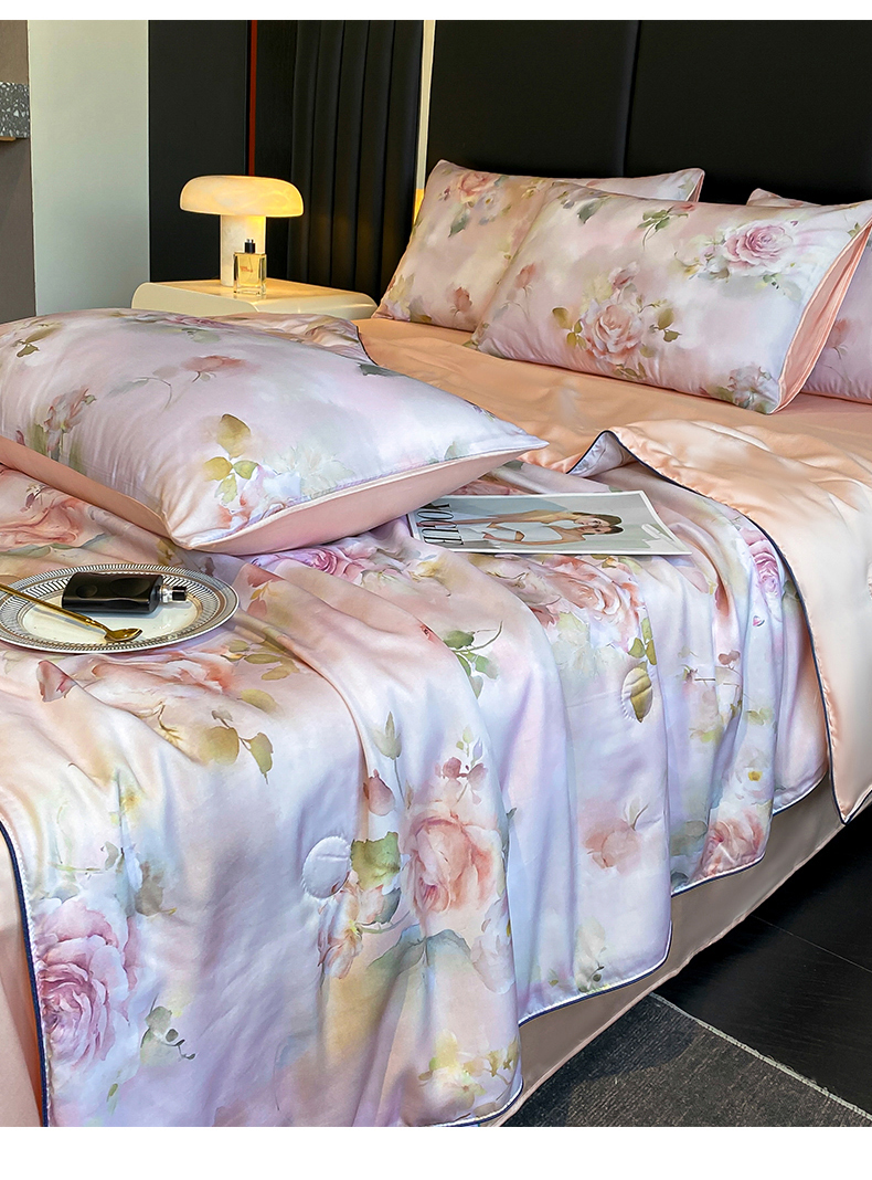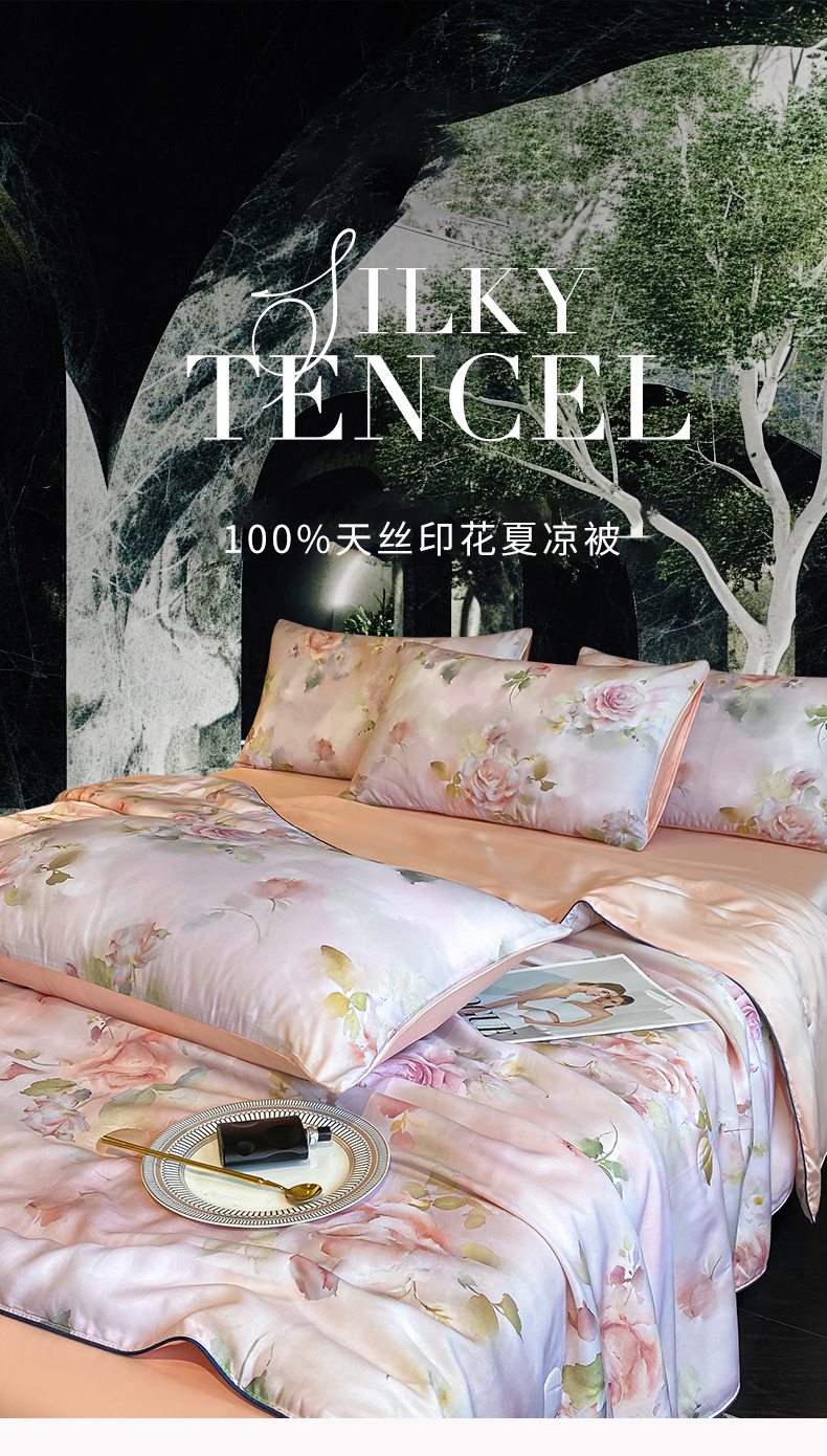 绒棉世家 2026新款100%莱赛尔天丝面料数码印花天丝夏被四件套 陌上花开-粉
