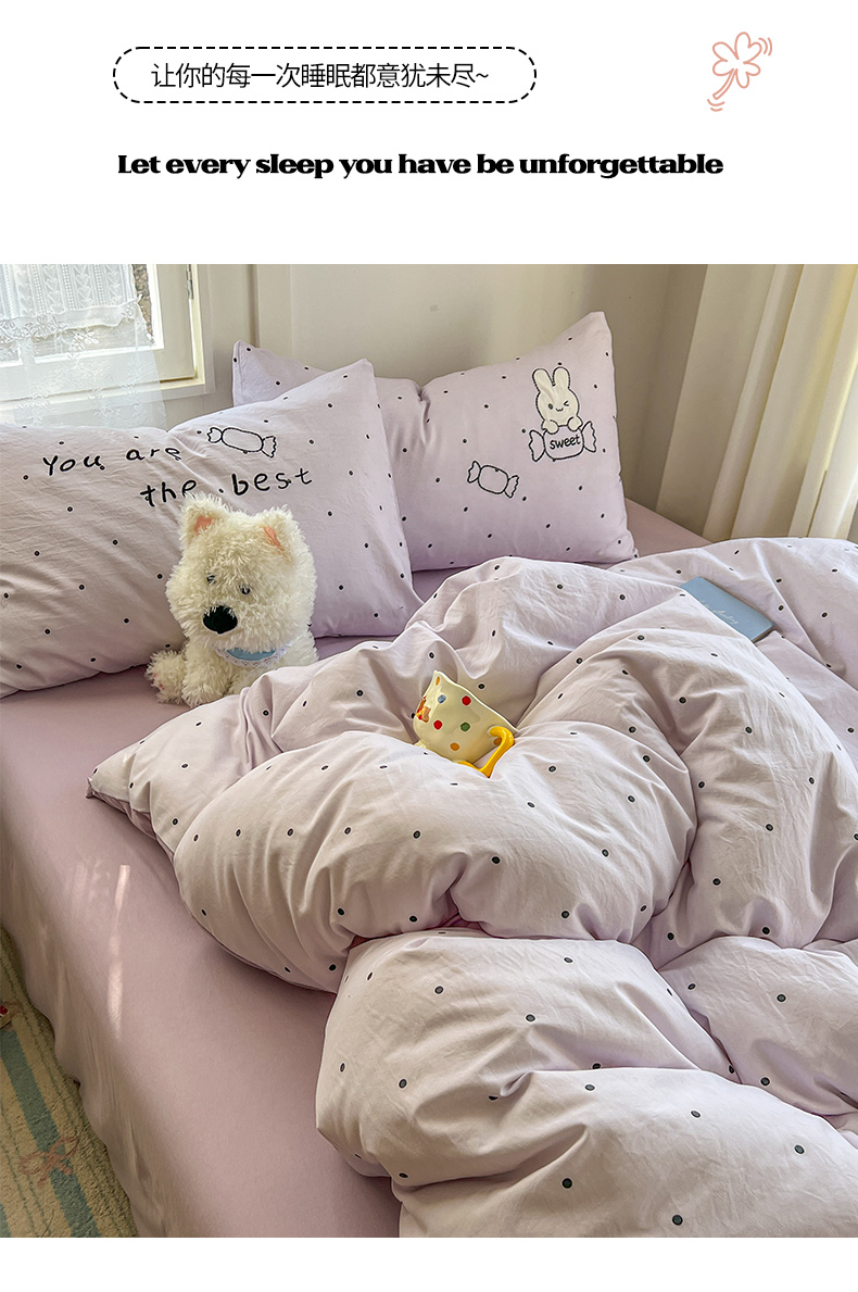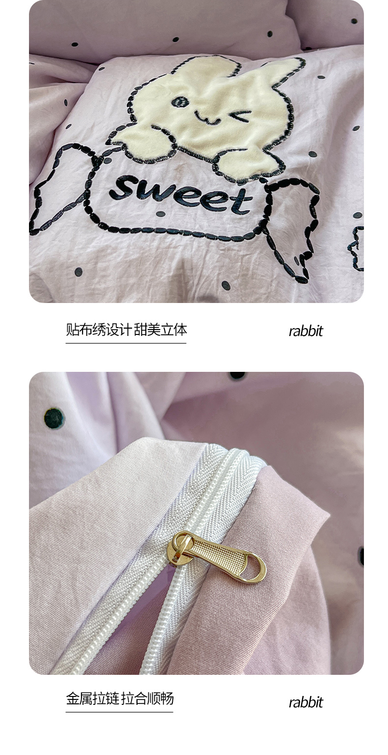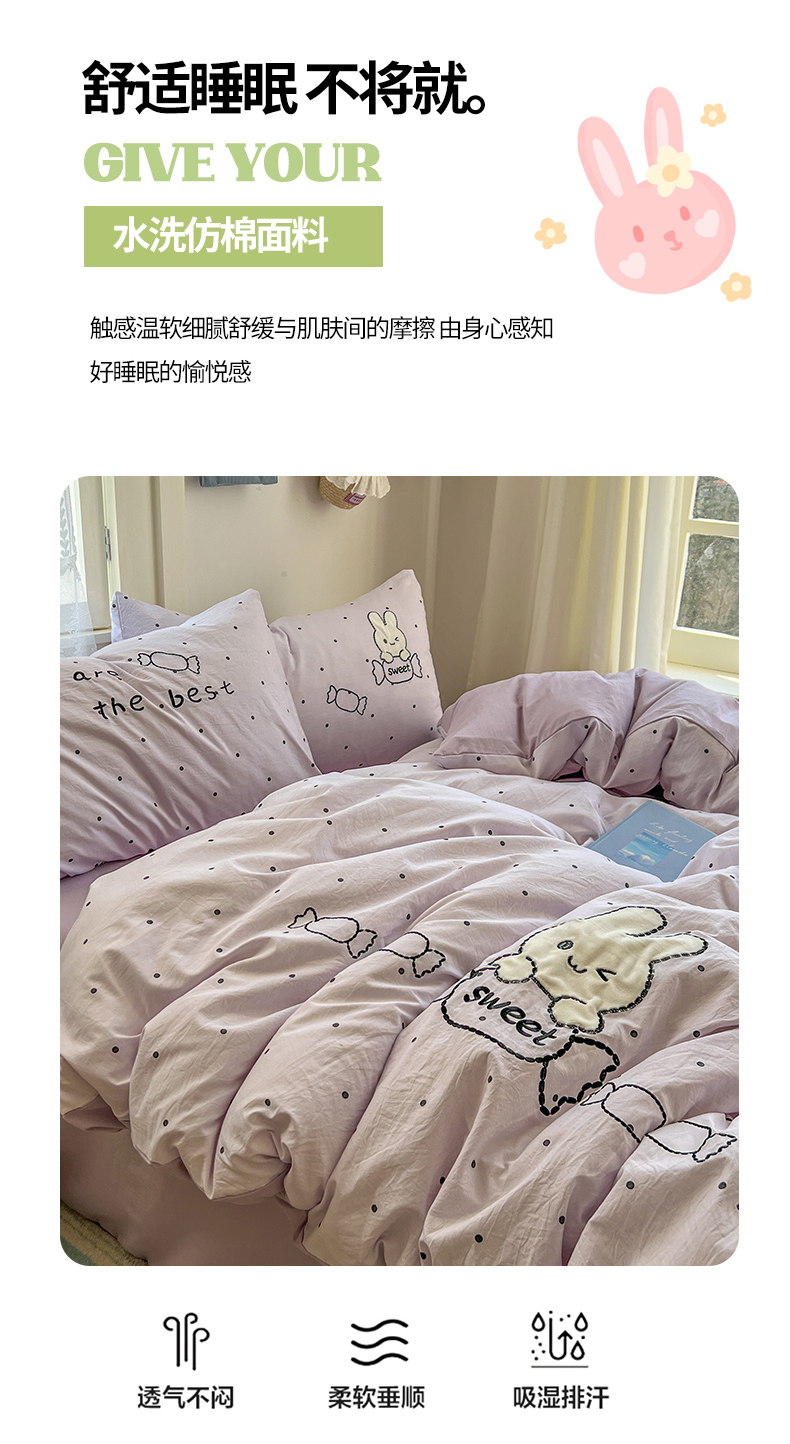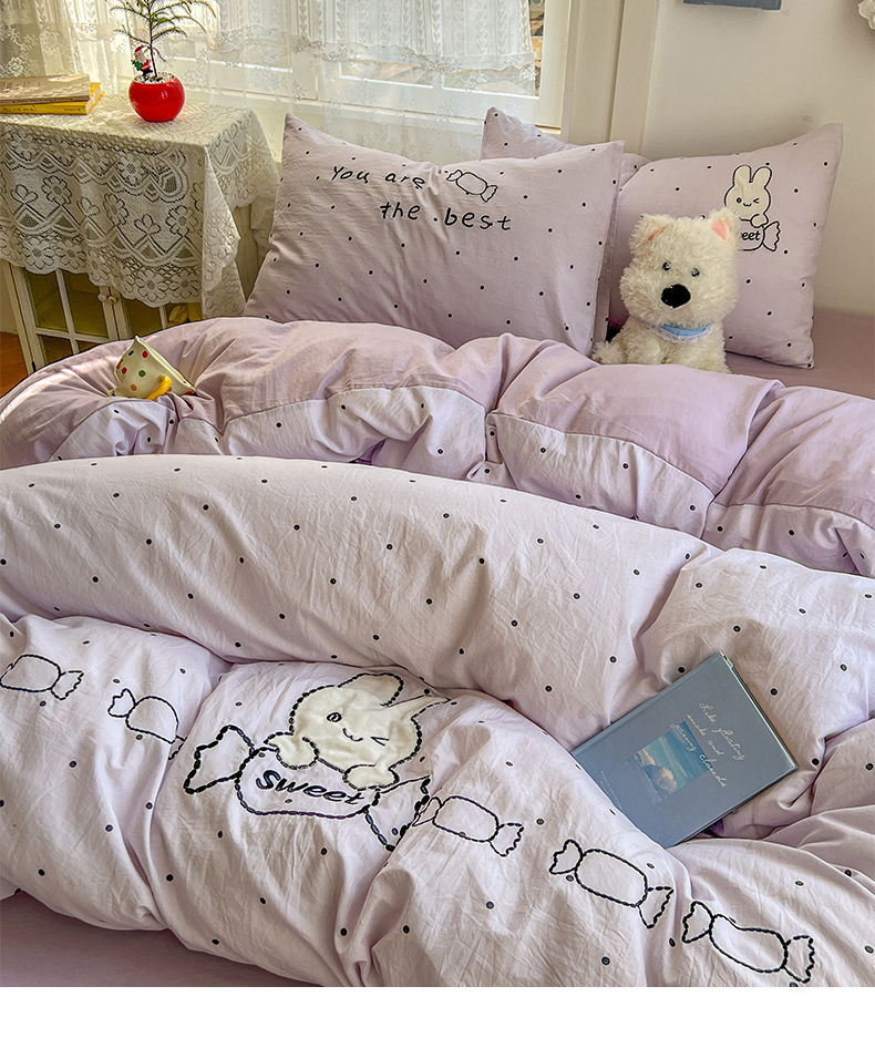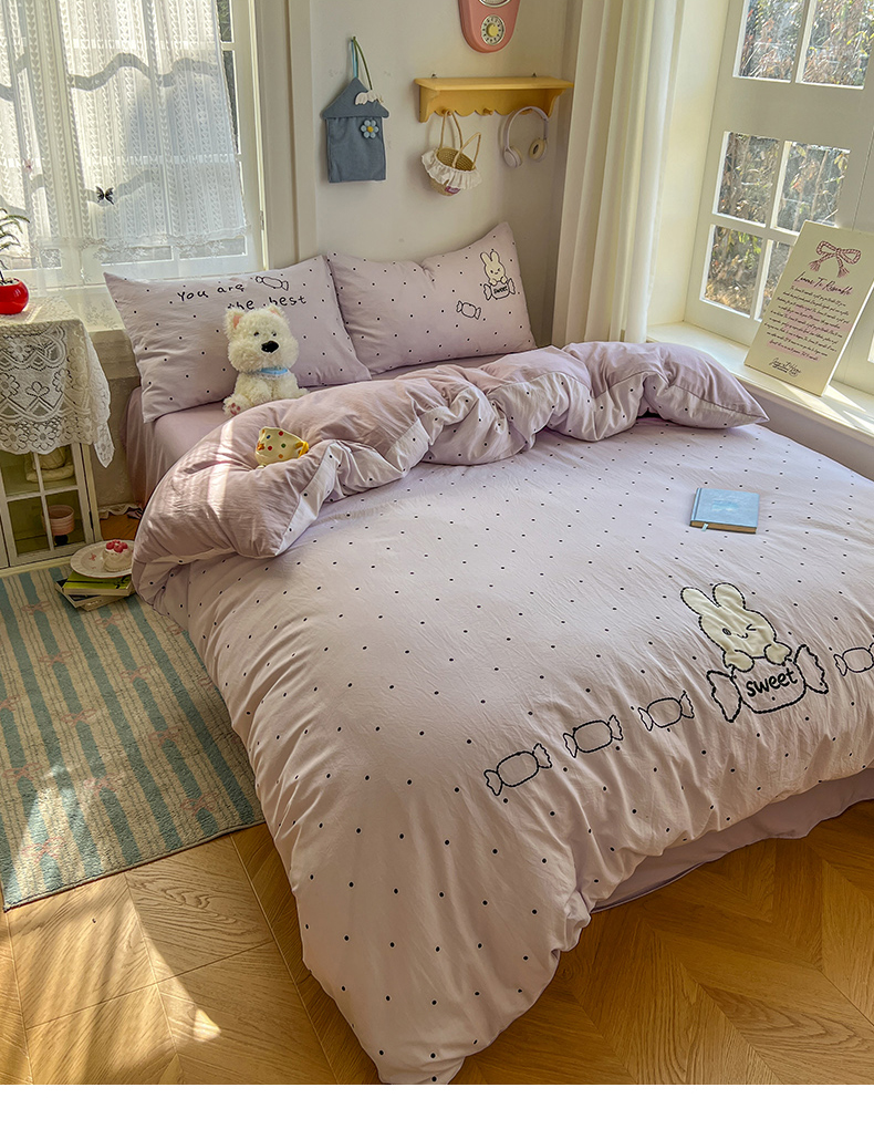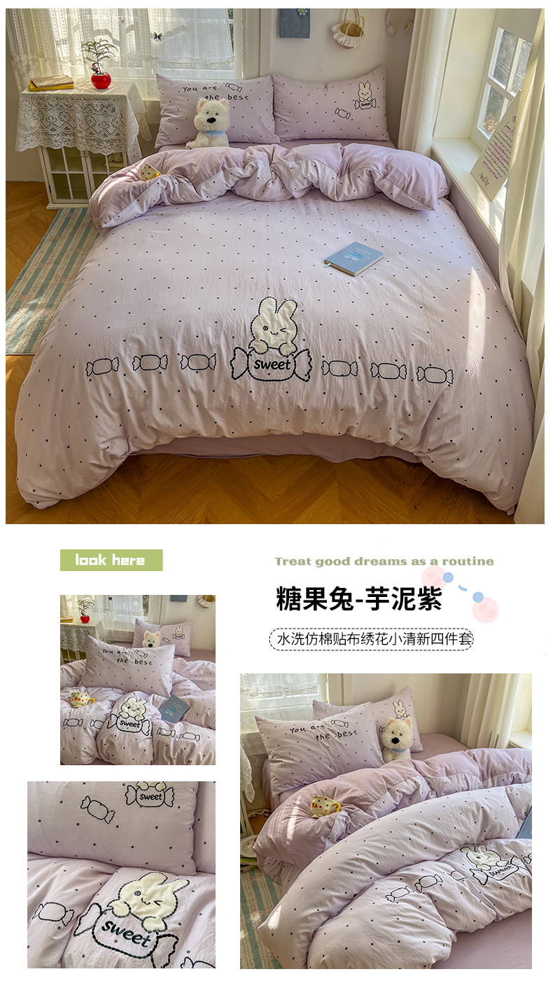 当前位置: 91家纺网 > 商品网购 > 床品套件 > 四件套 > 水洗棉四件套 > 贝凯瑞 2026新款仿棉木棉水洗棉绣花ins小清新床裙床单款四件套-糖果兔系列 糖果兔-芋泥紫