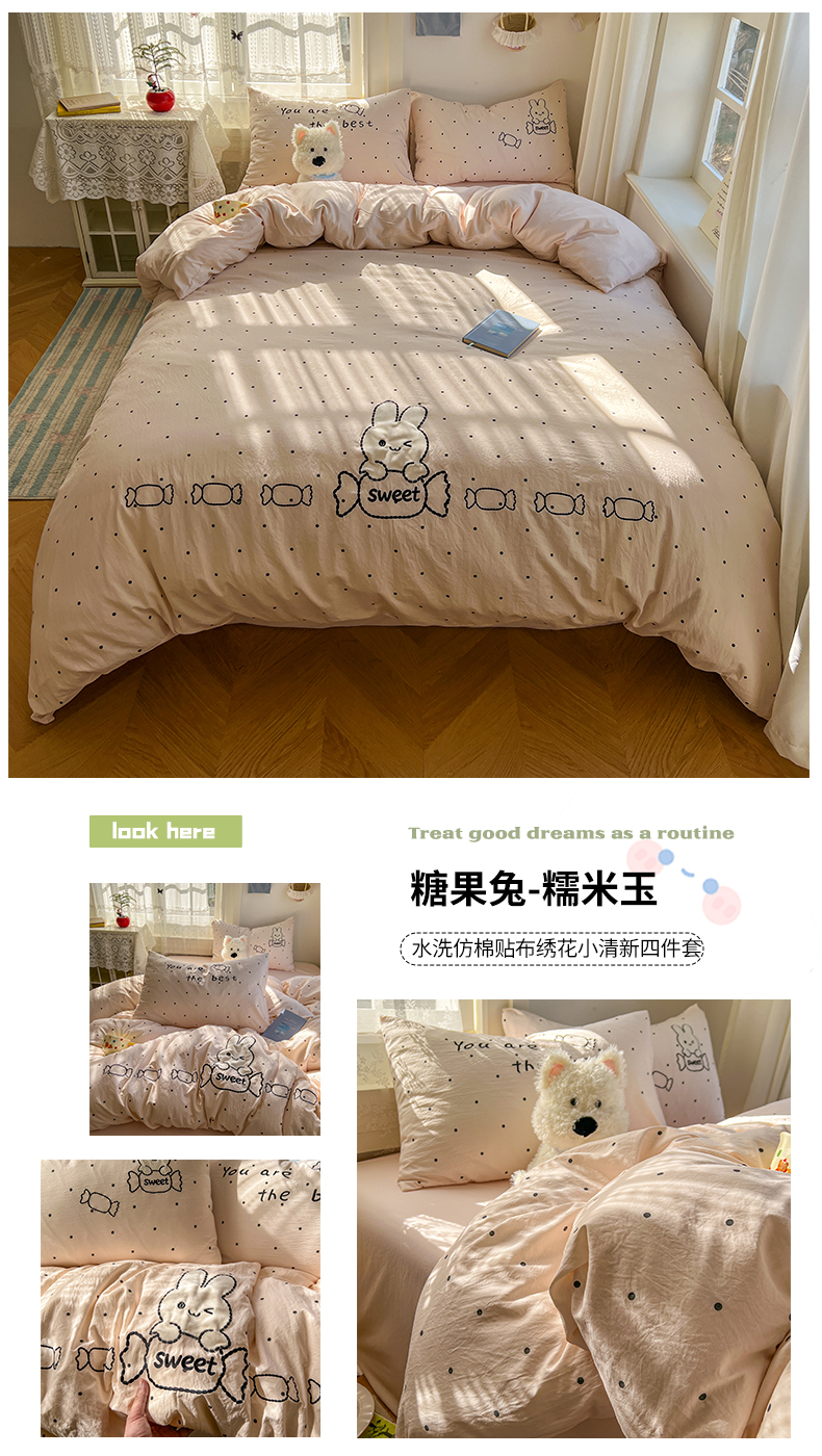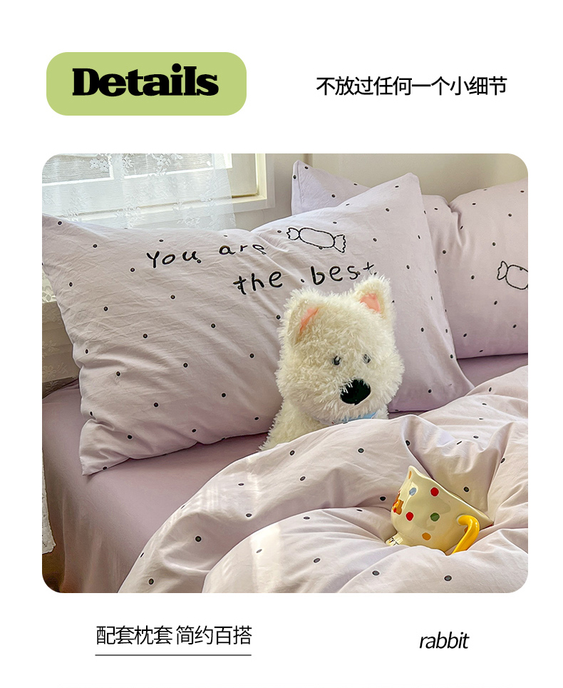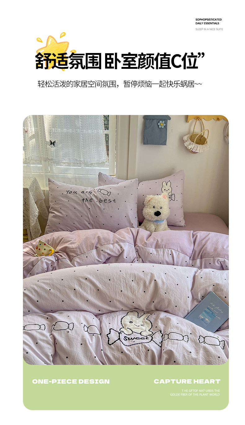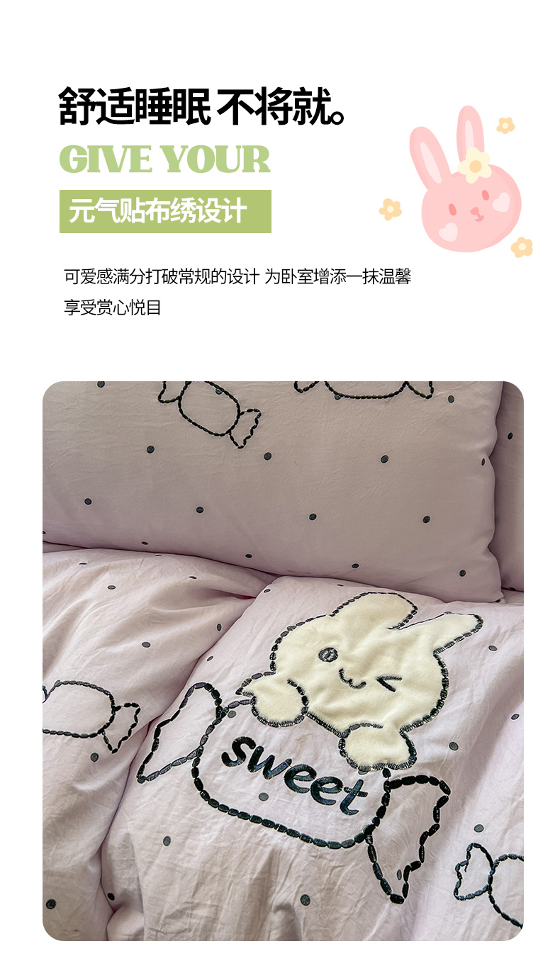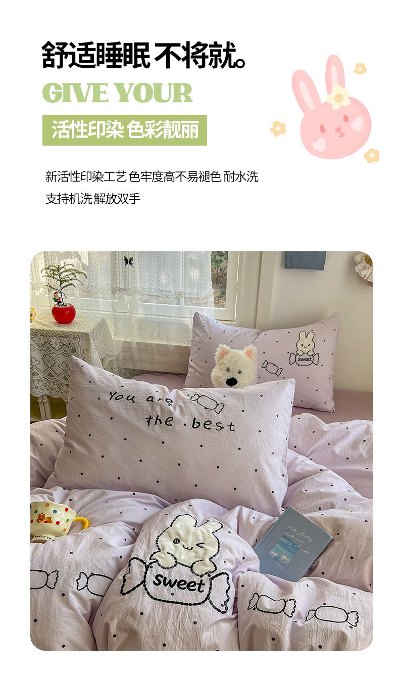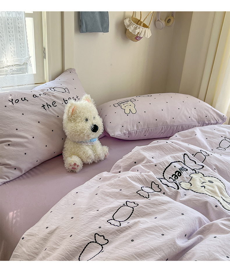 当前位置: 91家纺网 > 商品网购 > 床品套件 > 四件套 > 水洗棉四件套 > 贝凯瑞 2026新款仿棉木棉水洗棉绣花ins小清新床裙床单款四件套-糖果兔系列 糖果兔-芋泥紫
