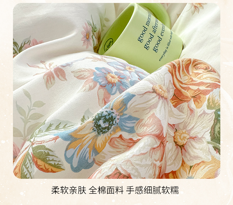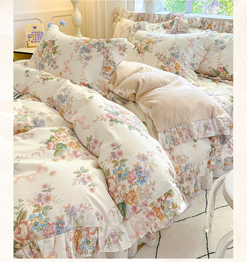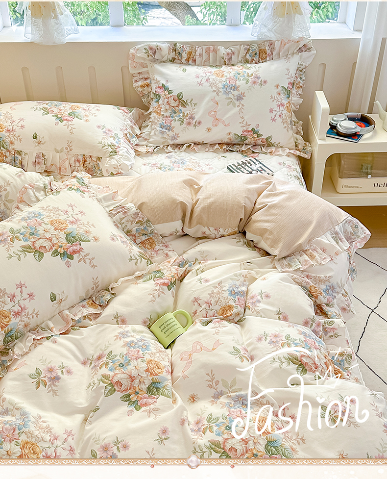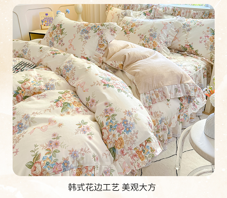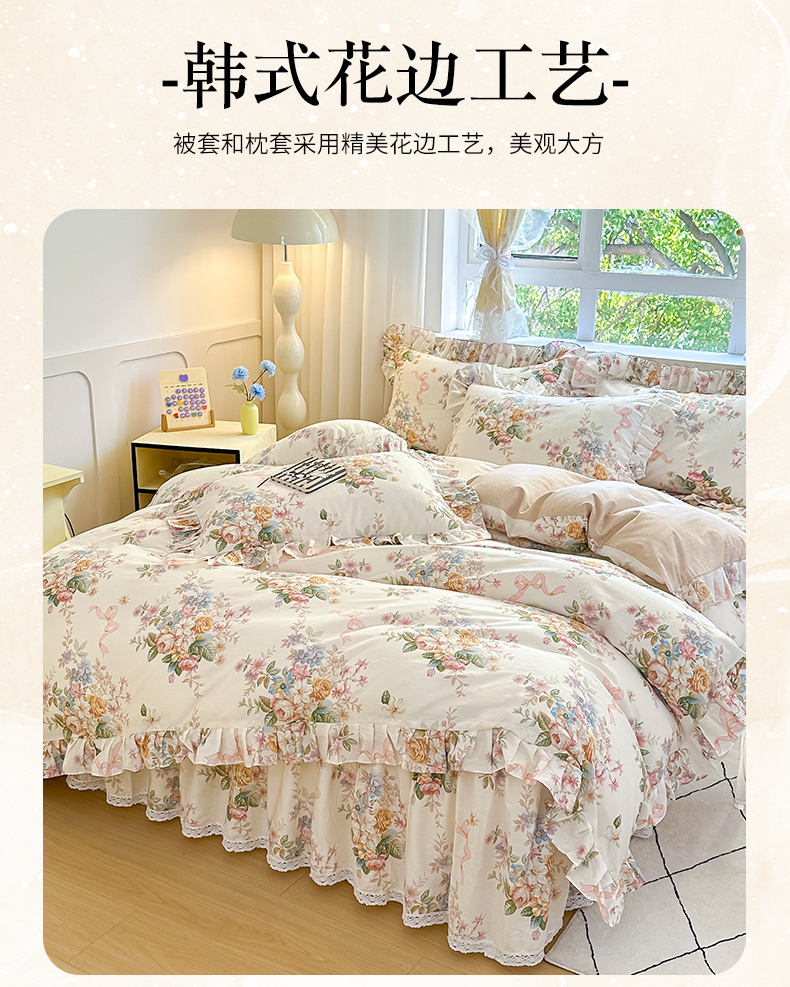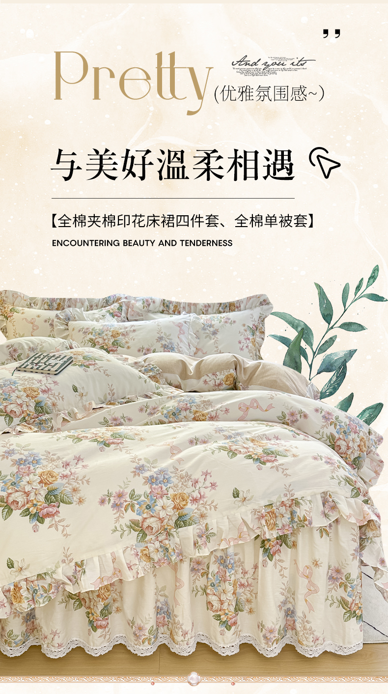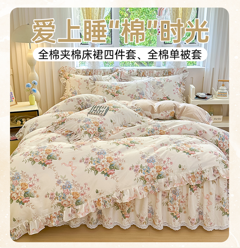 当前位置: 91家纺网 > 商品网购 > 床品套件 > 四件套 > 全棉普通四件套 > 忘忧草 2026新款全棉夹棉印花床裙四件套单被套 花颜悦色