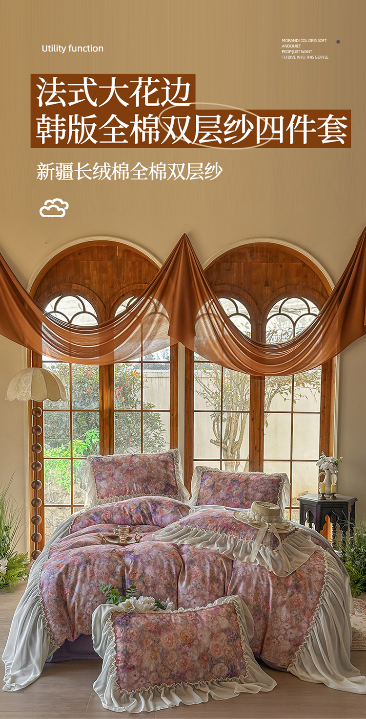 商品名称:(总)2026高端韩版法式公主复古油画风全棉纯棉双层纱四件套赫本浪漫荷叶花边仙女纯棉全棉双层纱四件套床上用品被套