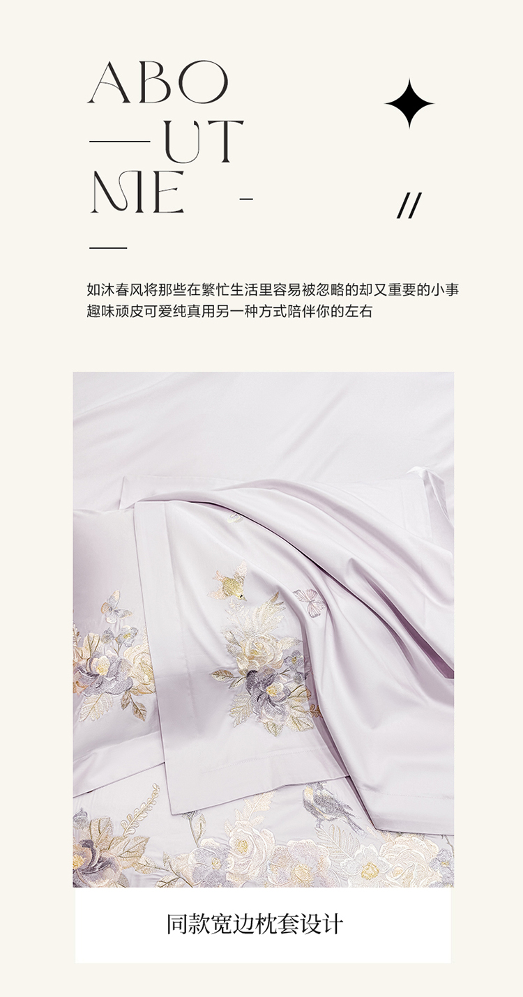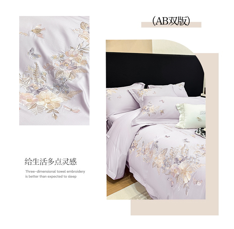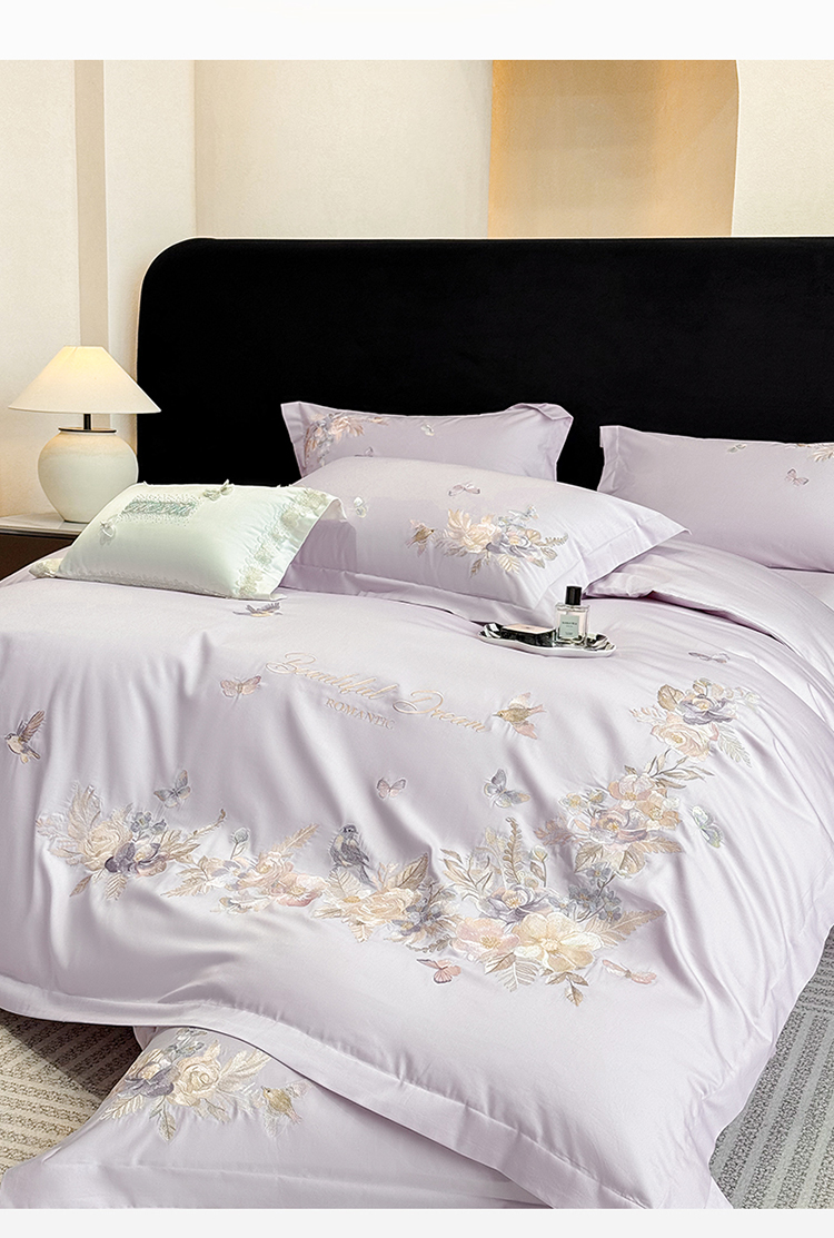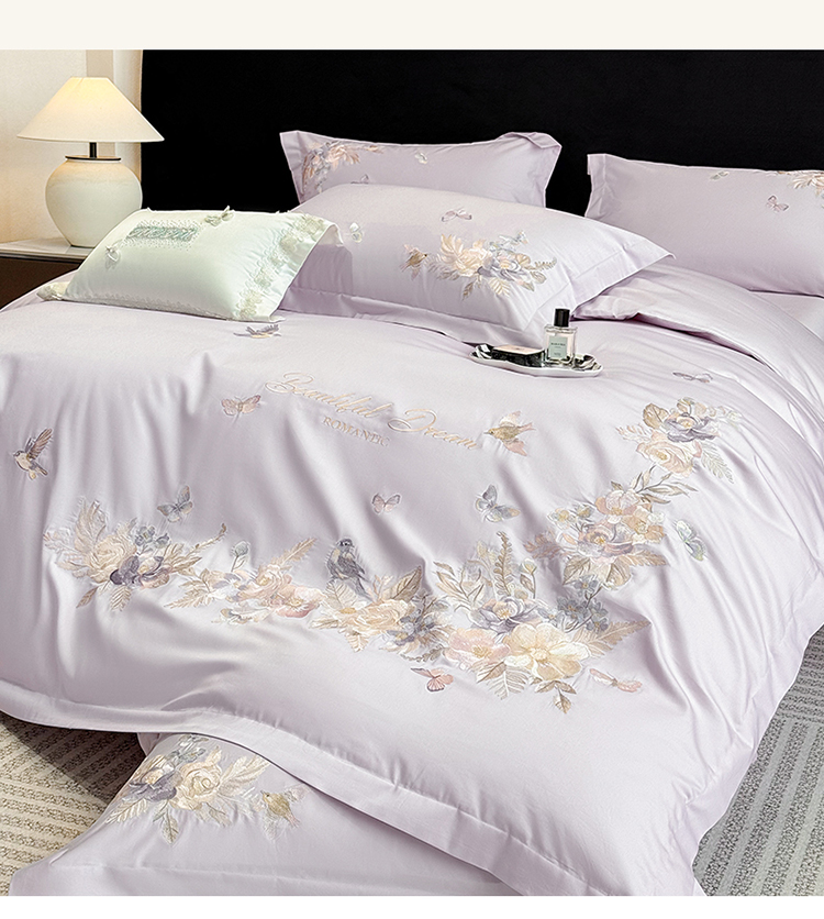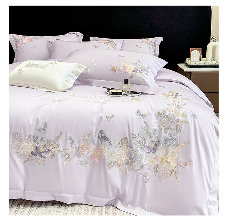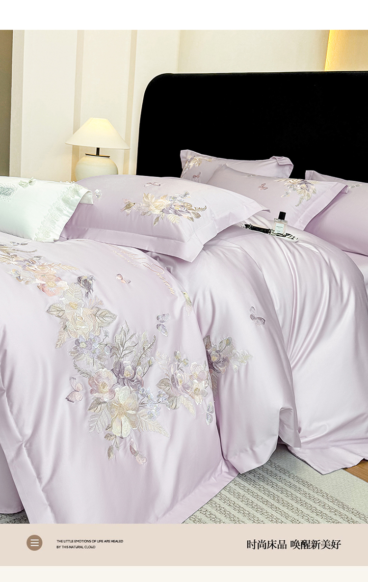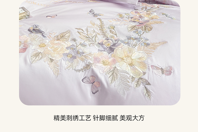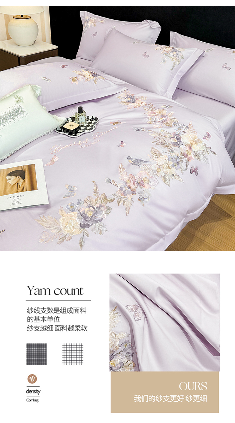 当前位置: 91家纺网 > 商品网购 > 床品套件 > 四件套 > 贡缎全棉四件套 > 春夏新品高档礼盒装50*50S贡缎长绒棉刺绣花四件套100%纯棉全棉床单床笠款量大价优 梦境紫-花莳-A类长绒棉高级床品