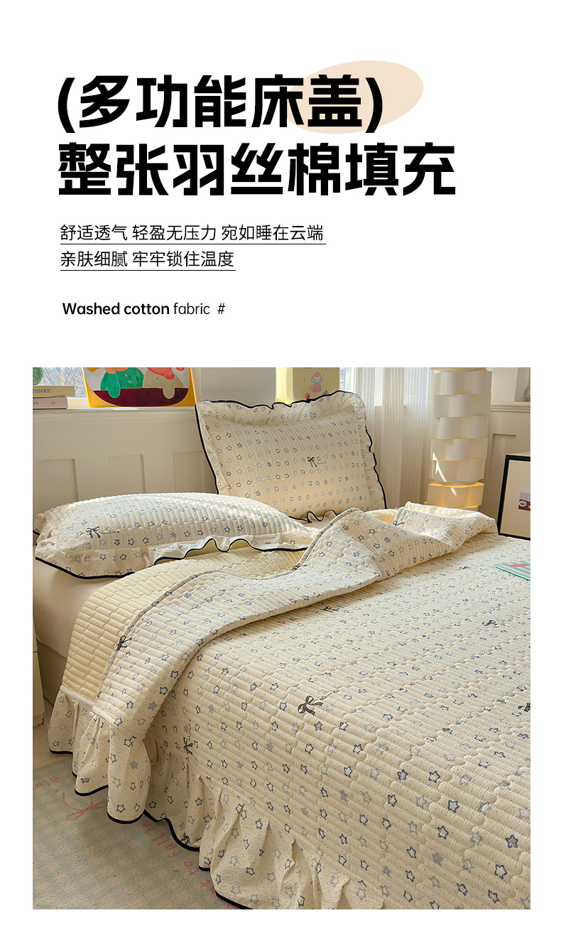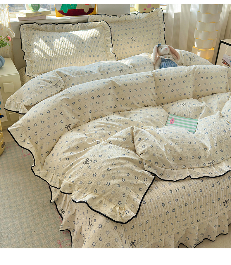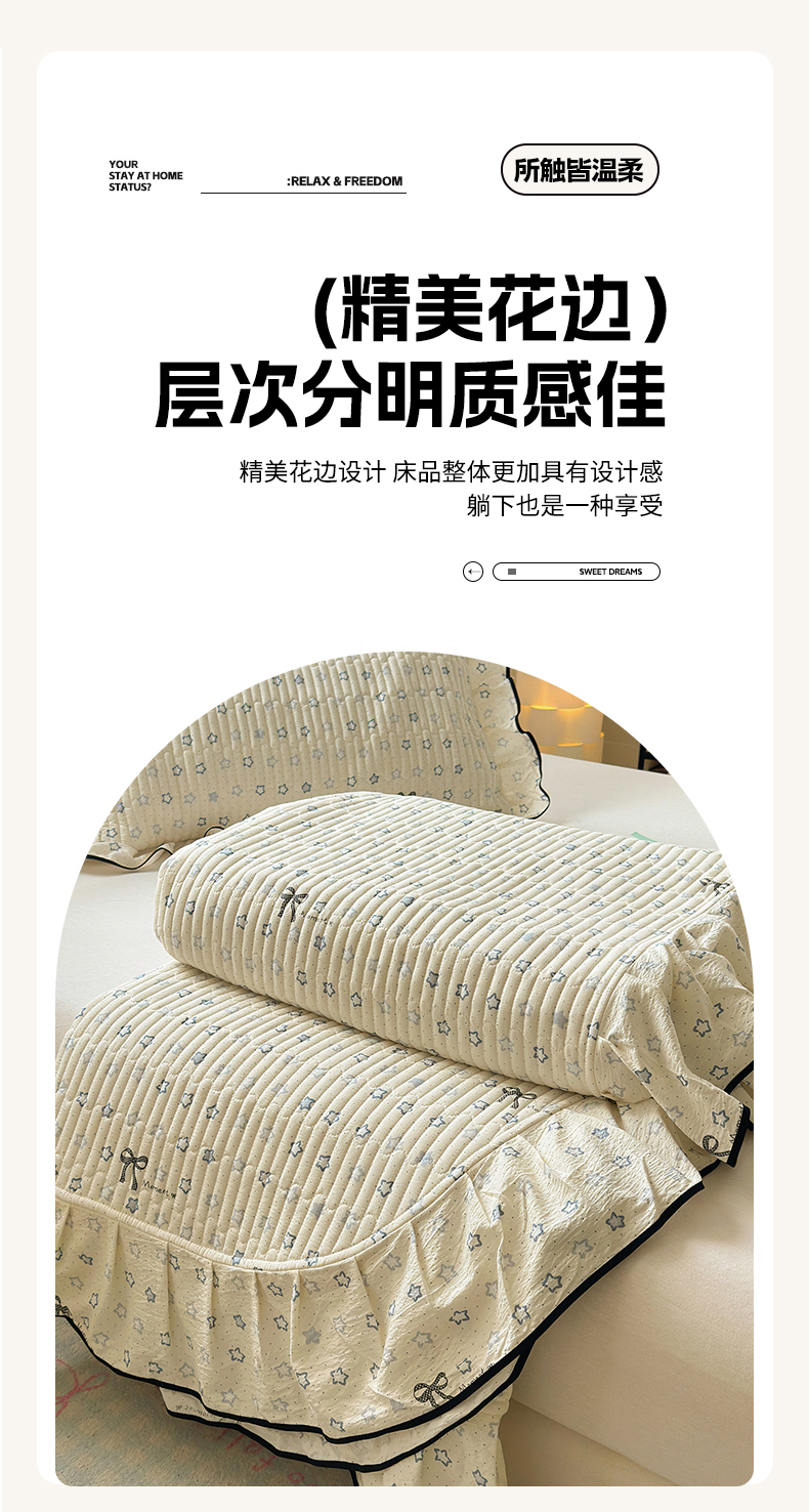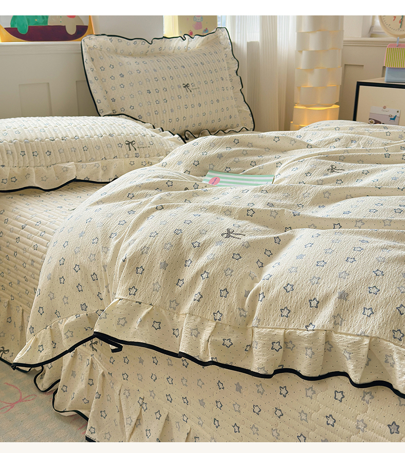 当前位置: 91家纺网 > 商品网购 > 床品套件 > 四件套 > 其它四件套 > 壹和 2026新款A类云感花边款双层纱床盖款和床单款四件套单床盖单被套 满天星