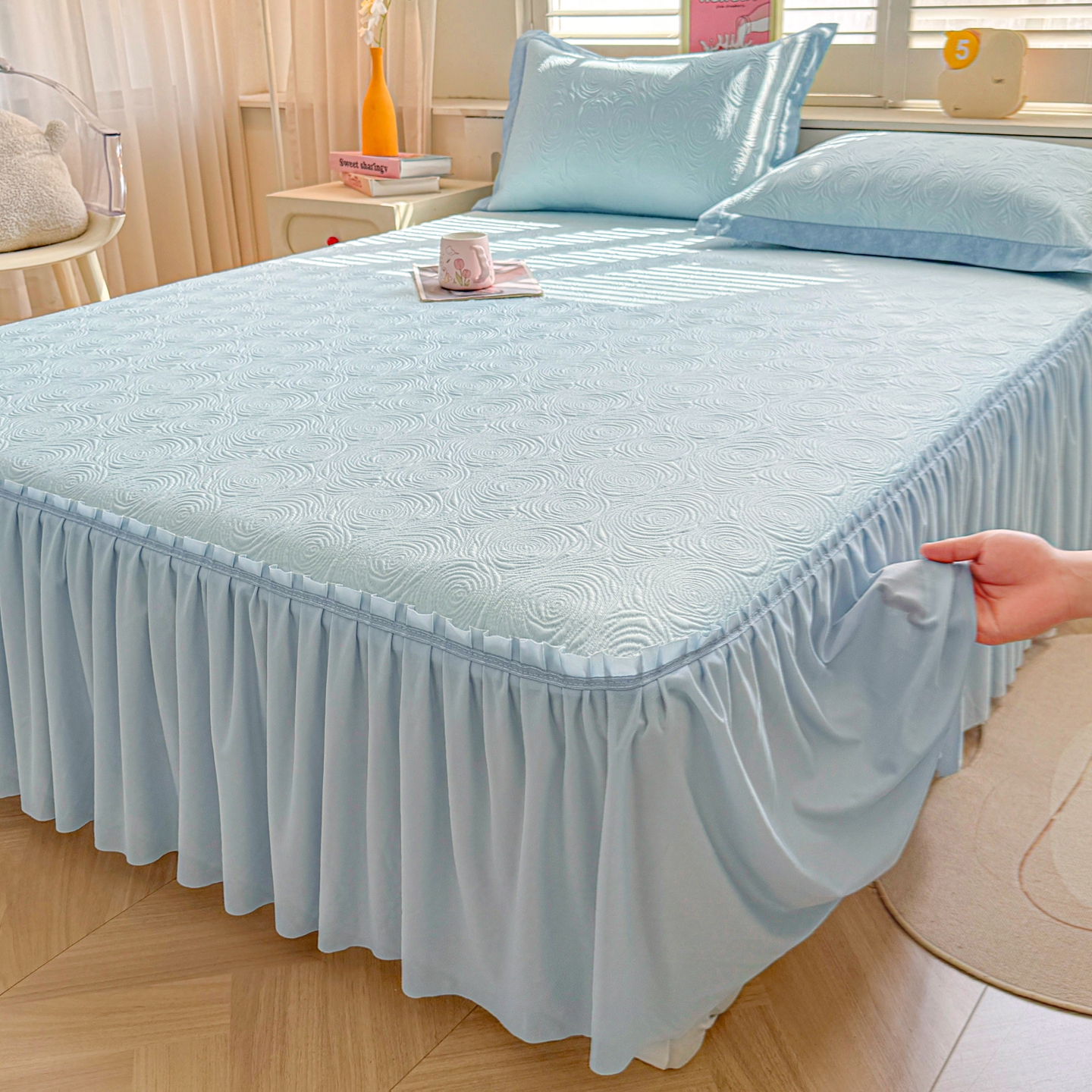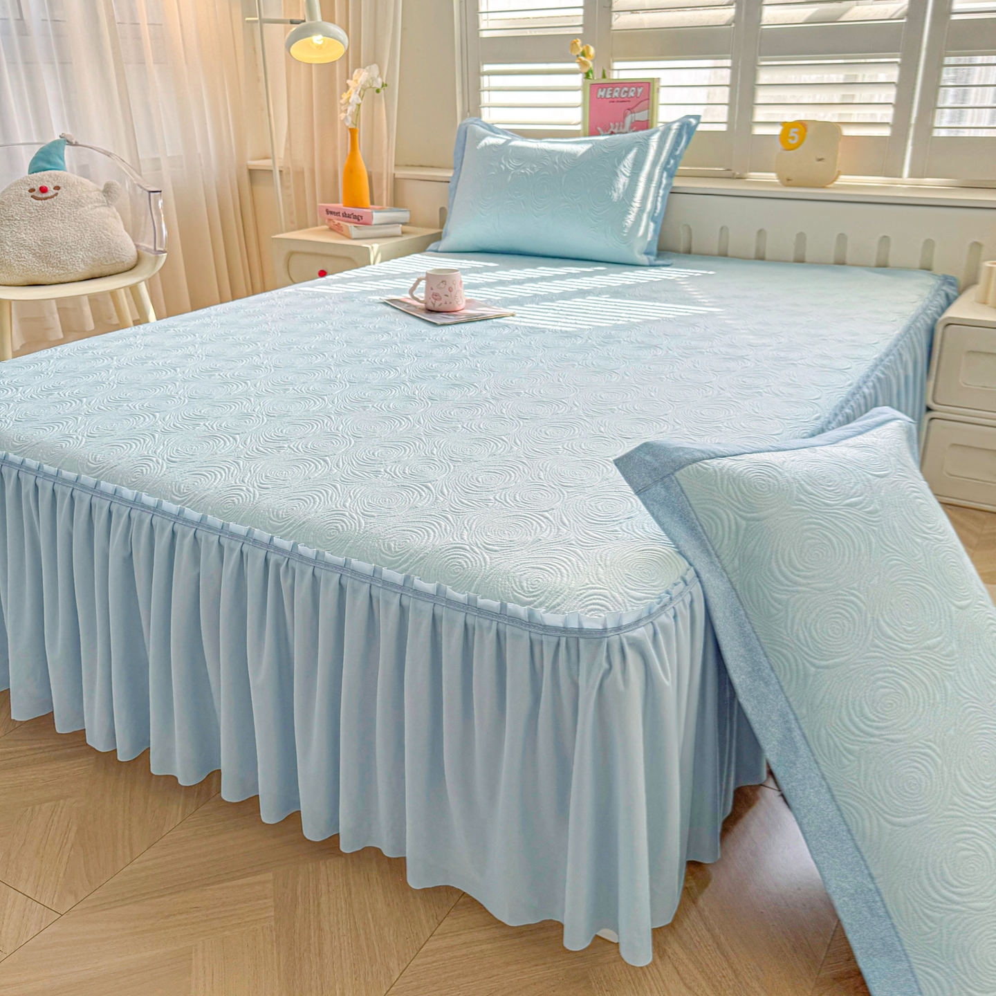 • 91家纺网 家纺一手货源 找家纺 (总)席都凉席工厂店 2026年轻奢高克重豆豆凉席夏季凉感冰丝提花床裙款三件套-奢序,奢序-雾蓝,奢序-烟粉,奢序-烟灰,奢序-浅绿