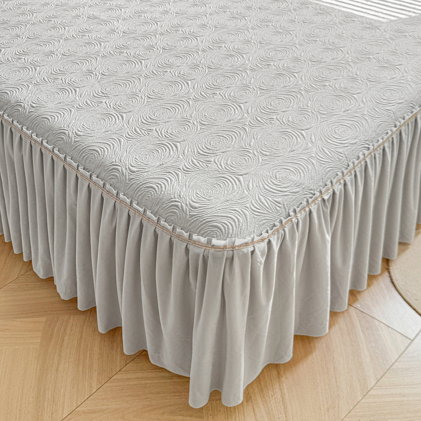 • 91家纺网 家纺一手货源 找家纺 席都凉席工厂店 2026年款玫瑰提花凉感豆豆席云感亲肤可水洗夏凉软席床裙款-云柔玫瑰 云柔玫瑰-云烟灰床裙款