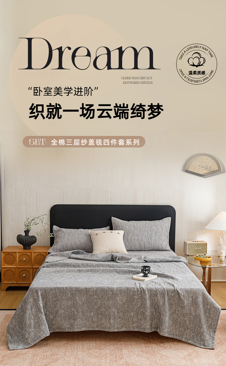 当前位置: 91家纺网 > 商品网购 > 床品套件 > 四件套 > 夏被四件套 > 悦然毛巾被 2026新款全棉三层纱加厚夏被四件套毛巾床笠盖毯毛毯枕套夏凉被空调被 雾花织梦