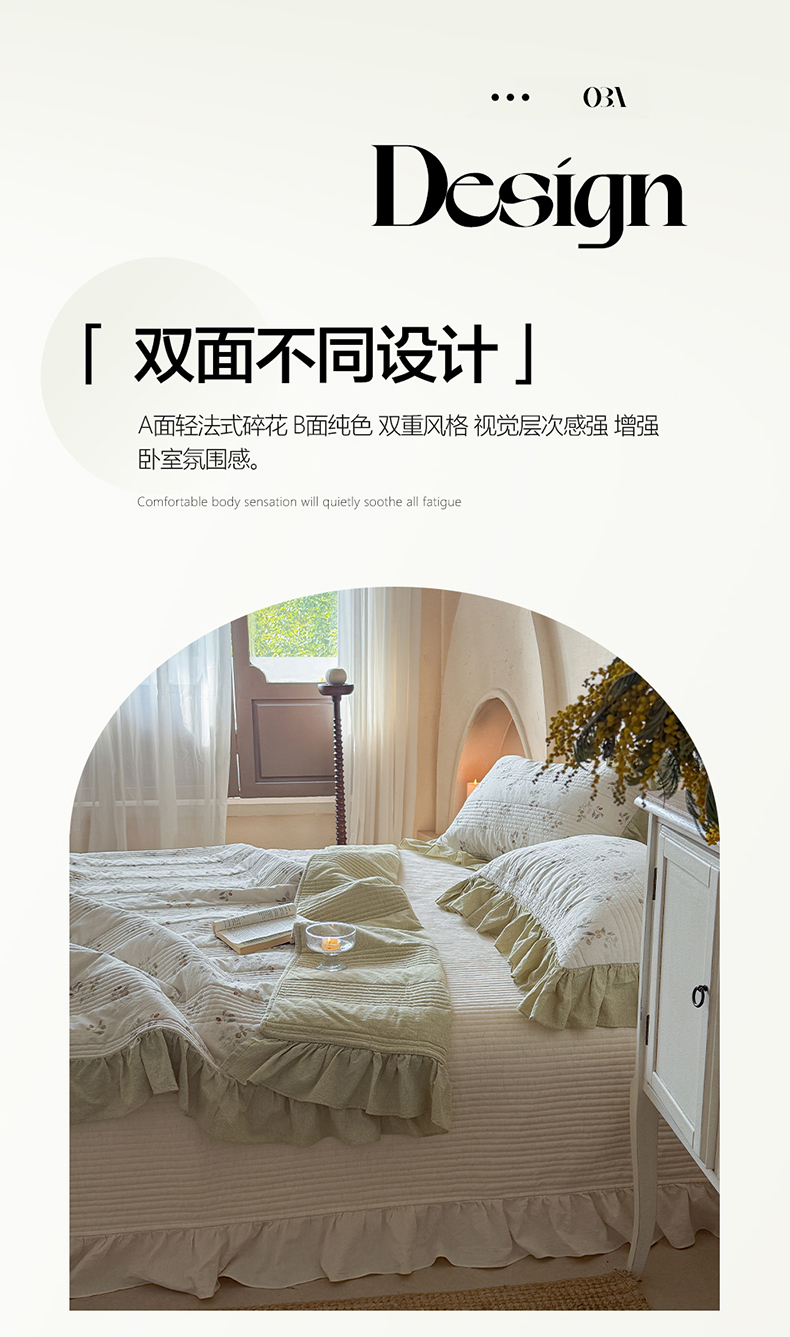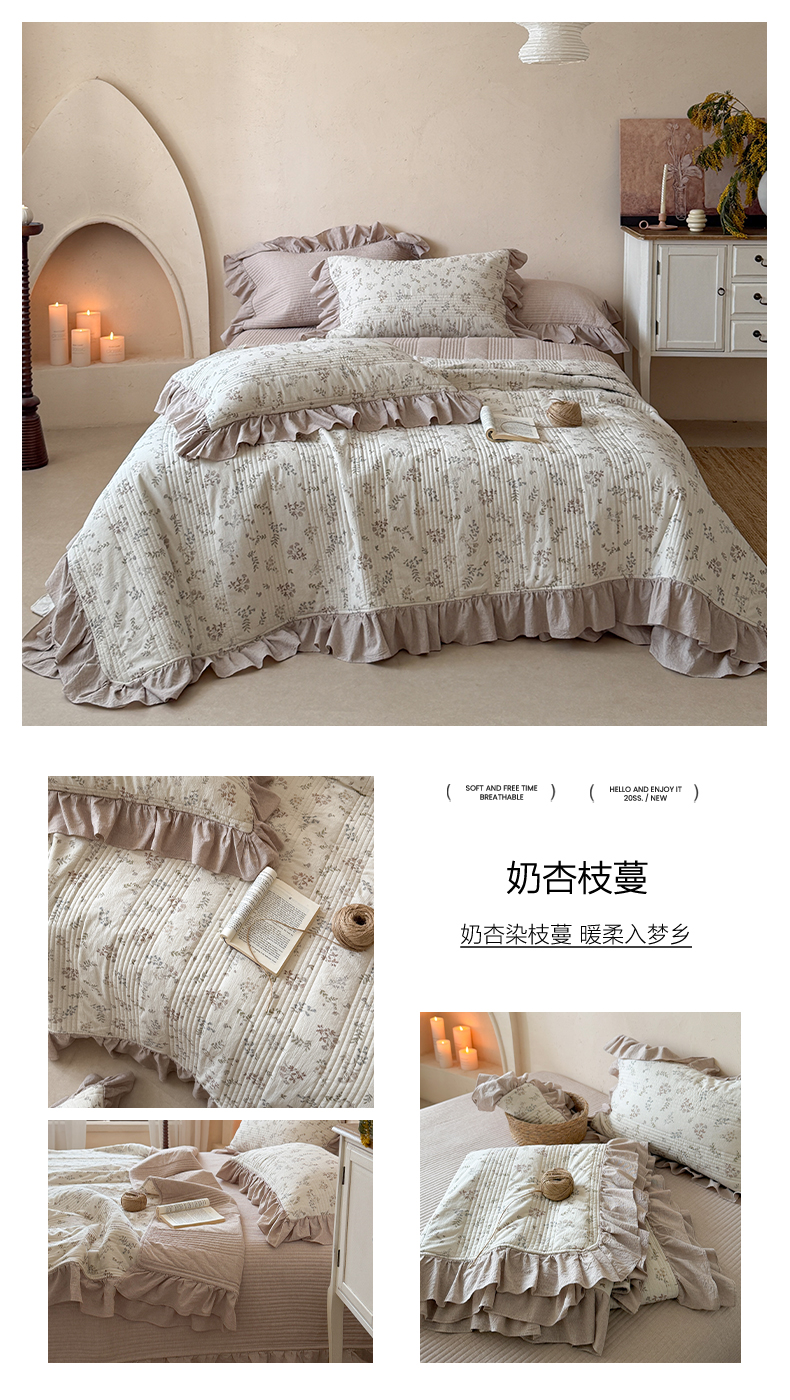 (总)漫调家纺 2026春夏新品双面棉麻法式荷叶边高温水洗夏被可配夏被四件套床单床盖四件套(夏被四件套咨询微信),粉雾花甸,蓝雾花影,奶杏枝蔓,青枝野果,组合