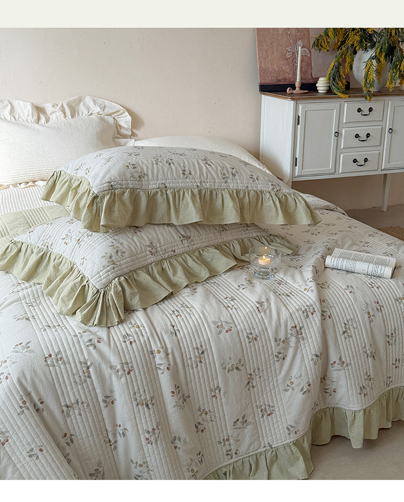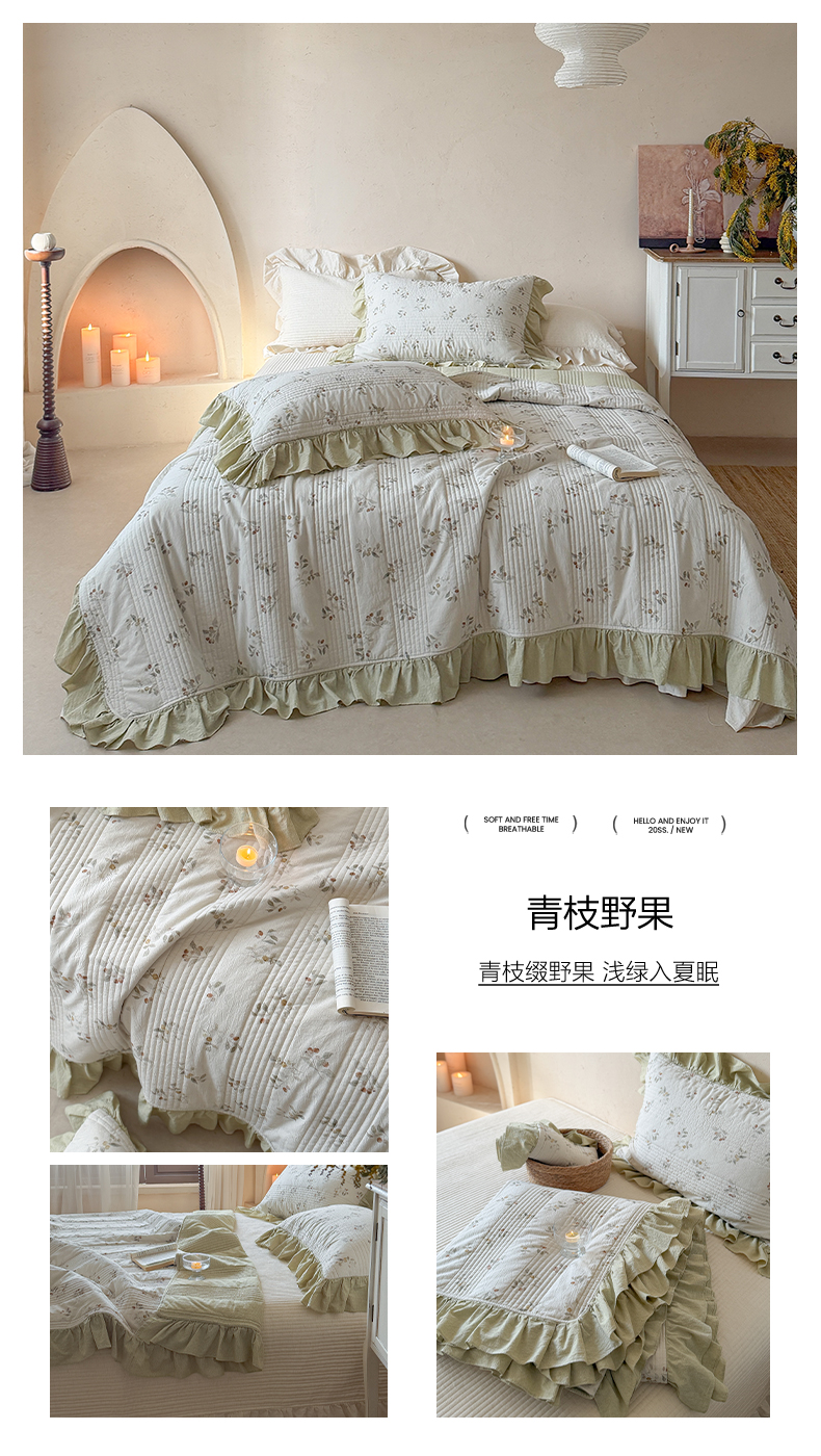 商品名称:漫调家纺 2026春夏新品双面棉麻法式荷叶边高温水洗夏被可配夏被四件套床单床盖四件套 青枝野果
