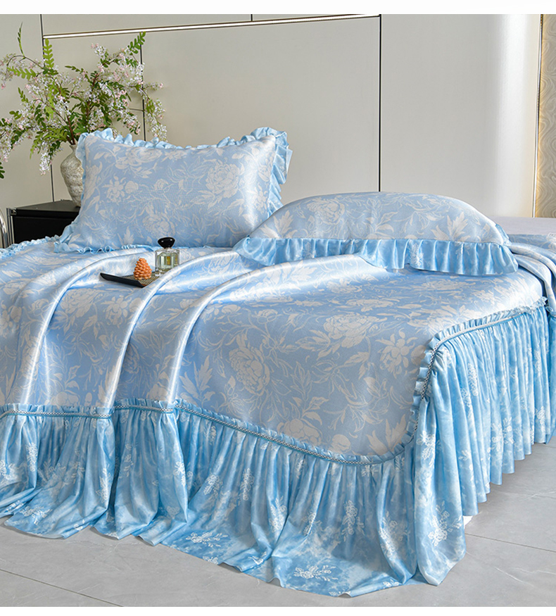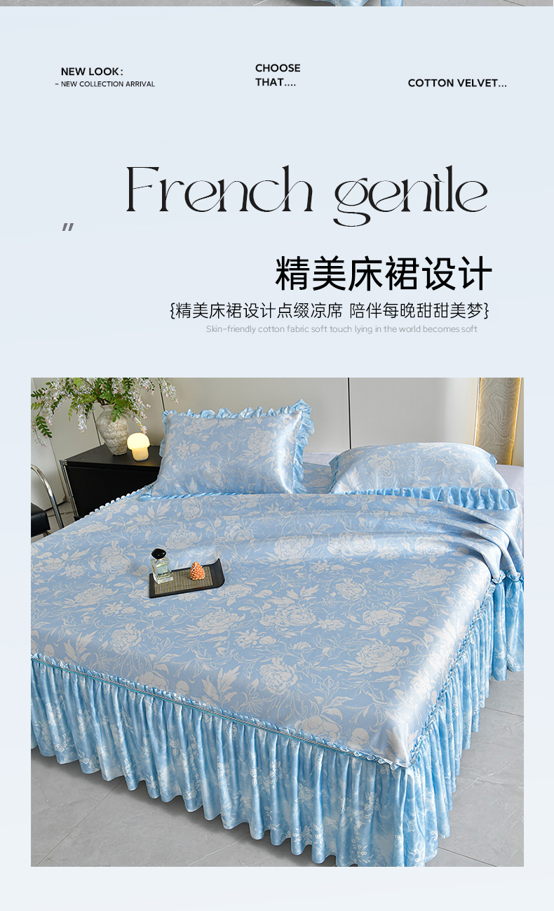 (总)畅畅家纺 2026春夏新款豆豆冰丝印花复合床裙款席子凉席三件套,花颜-蓝,花语-绿,柔梦-绿,柔梦-紫,炫彩-粉,栀子-蓝