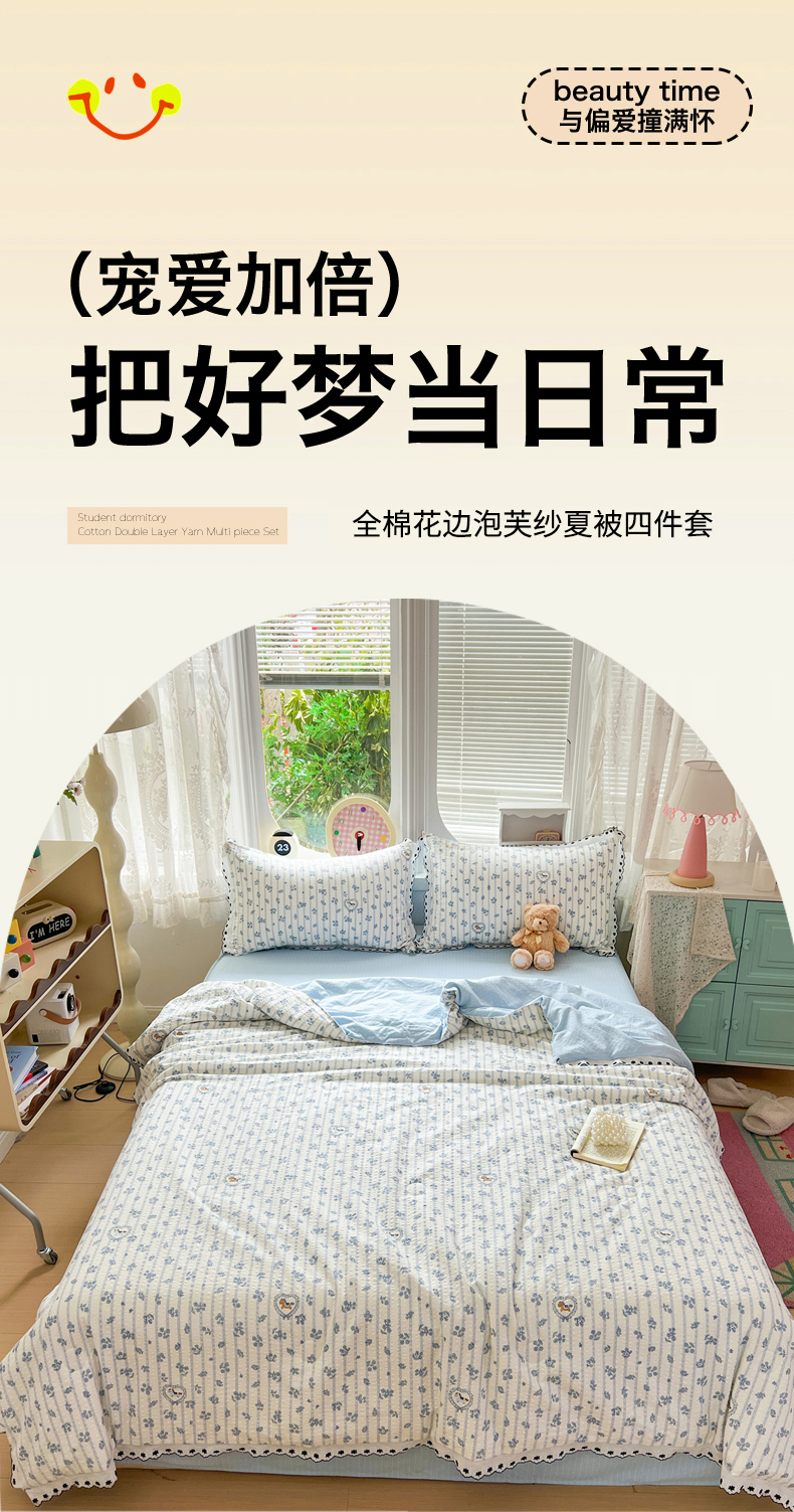 (总)恒尚居 2026新款A类泡芙纱床盖四套件泡芙棉双层纱小花边床垫床褥,波点奶芙小花边,彩虹木马小花边,费尔岛小狗小花边,粉糖泡泡猫小花边,兰格奶狗小花边,奶黄星星人小花边,细格木马小花边,阳光条纹小花边,字母喵喵小花边