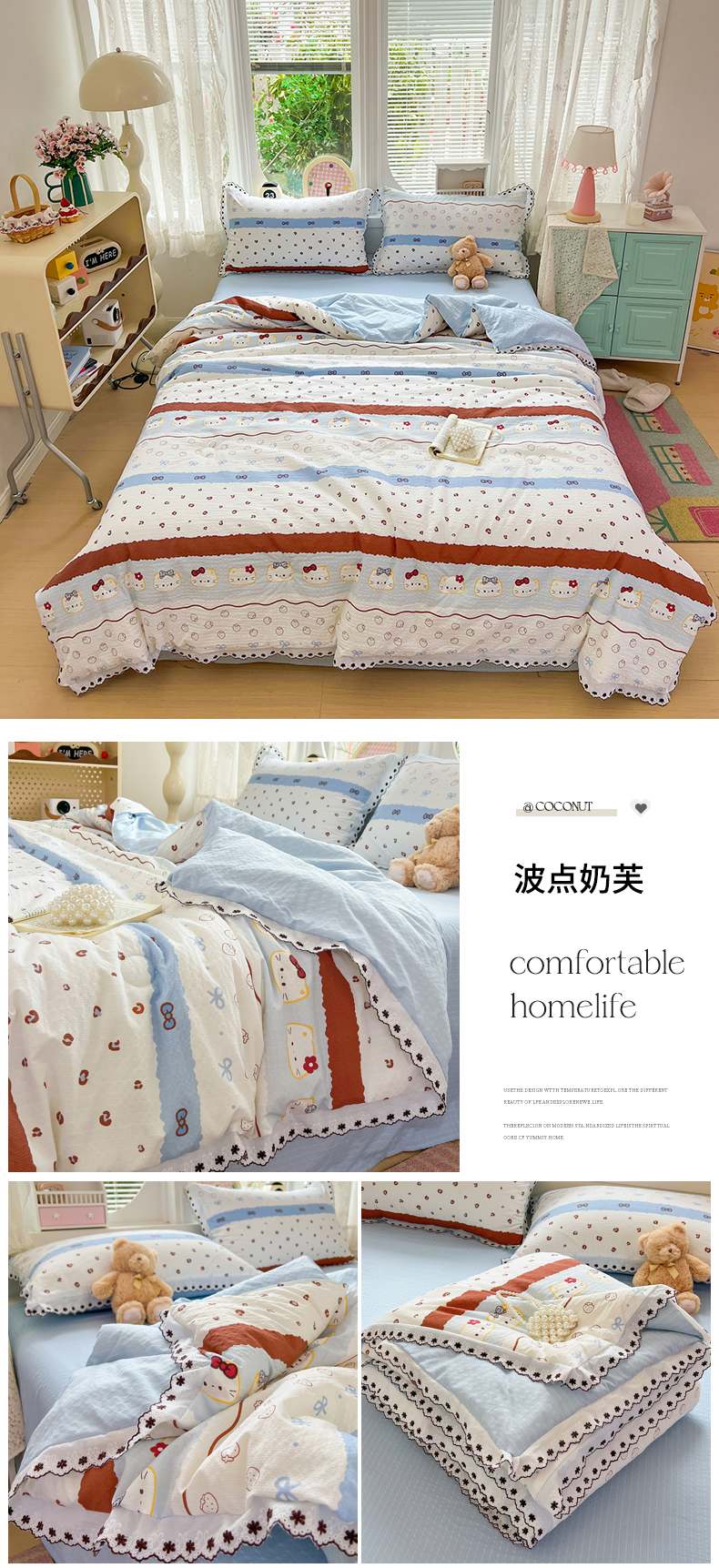 (总)恒尚居 2026新款A类泡芙纱床盖四套件泡芙棉双层纱小花边床垫床褥,波点奶芙小花边,彩虹木马小花边,费尔岛小狗小花边,粉糖泡泡猫小花边,兰格奶狗小花边,奶黄星星人小花边,细格木马小花边,阳光条纹小花边,字母喵喵小花边