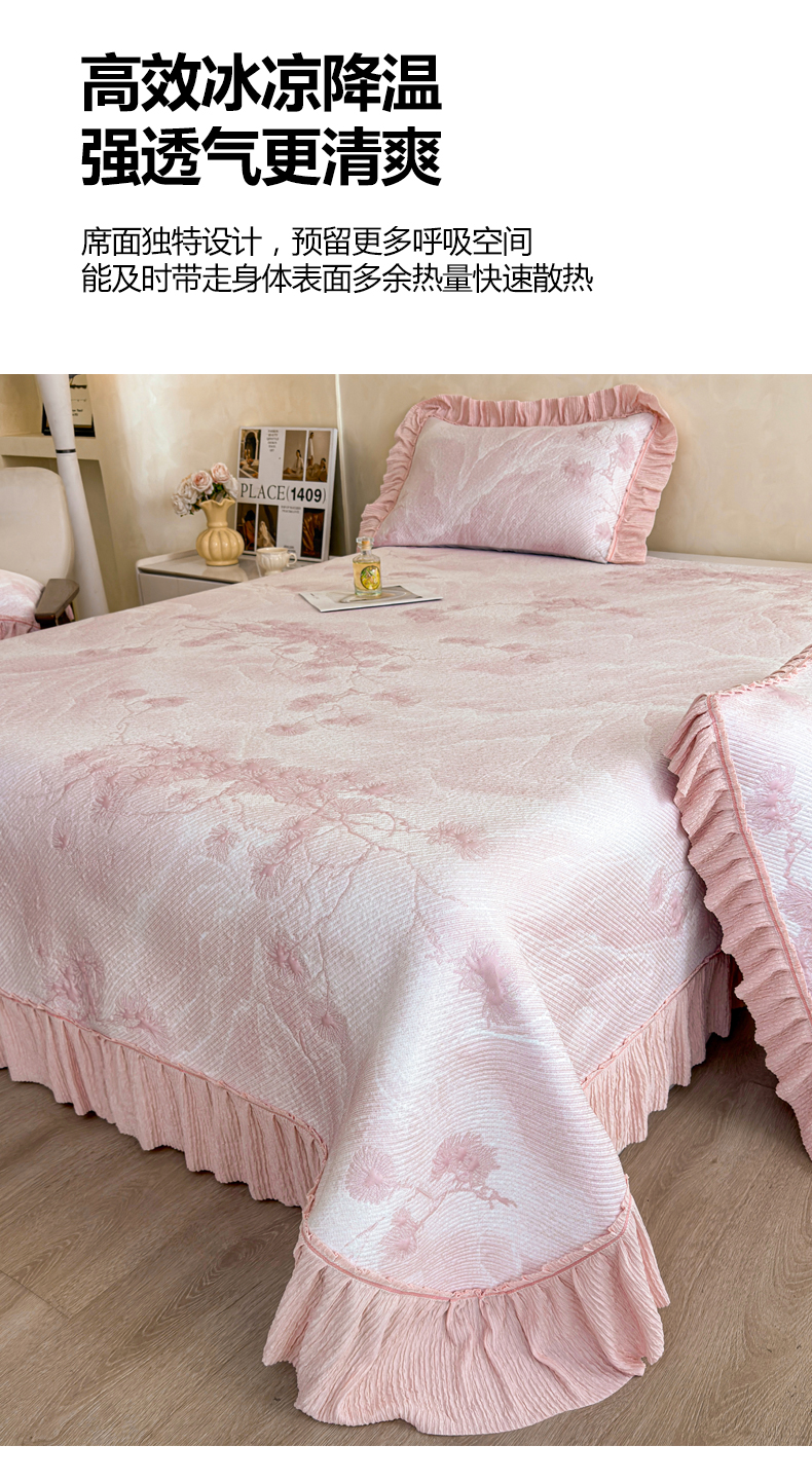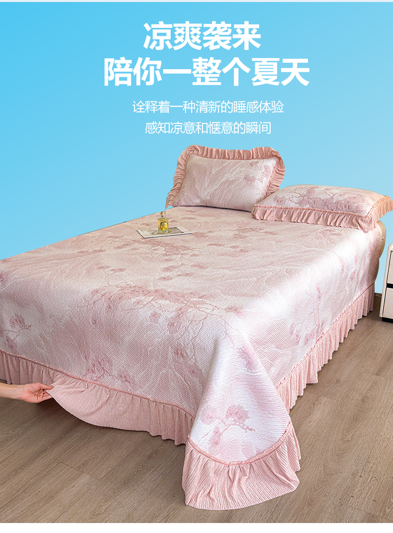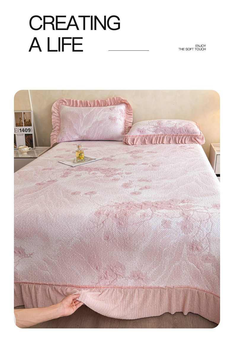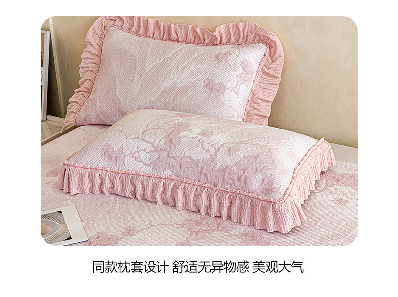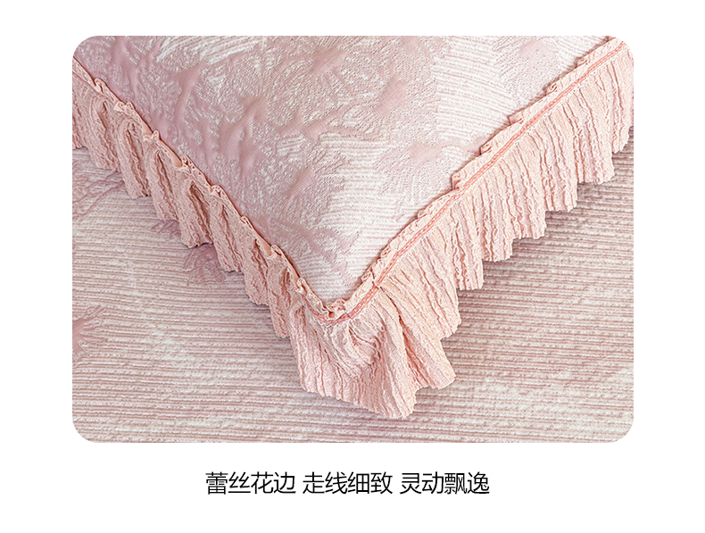 商品名称:慕木家纺 2026新款A类乙纶双面提花560克冰豆豆花边床盖款床裙迎客松系列(提供买家秀) 迎客松-粉