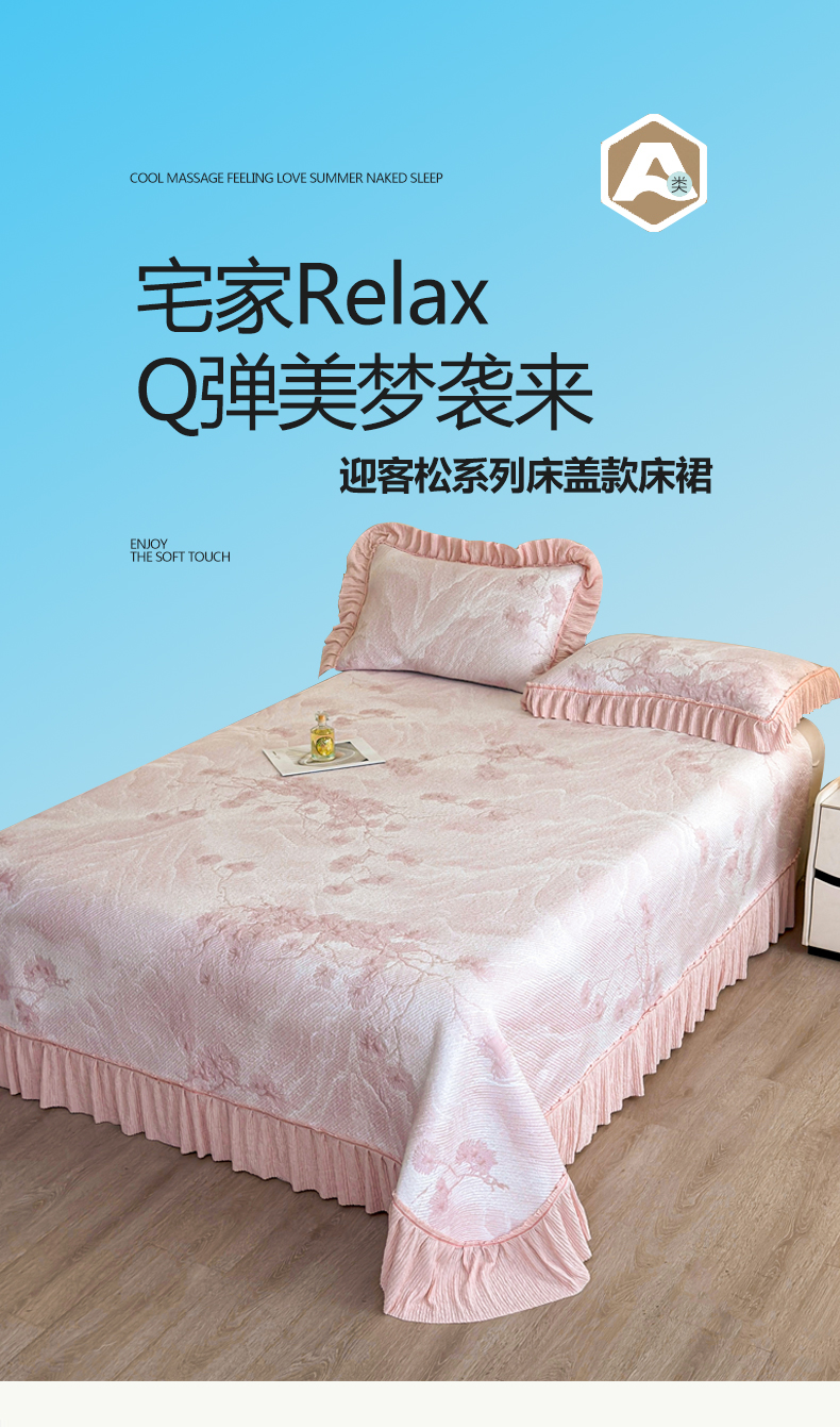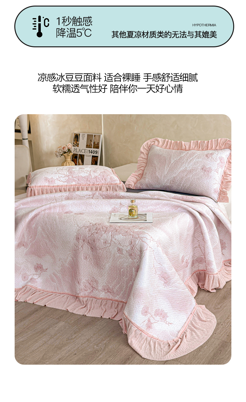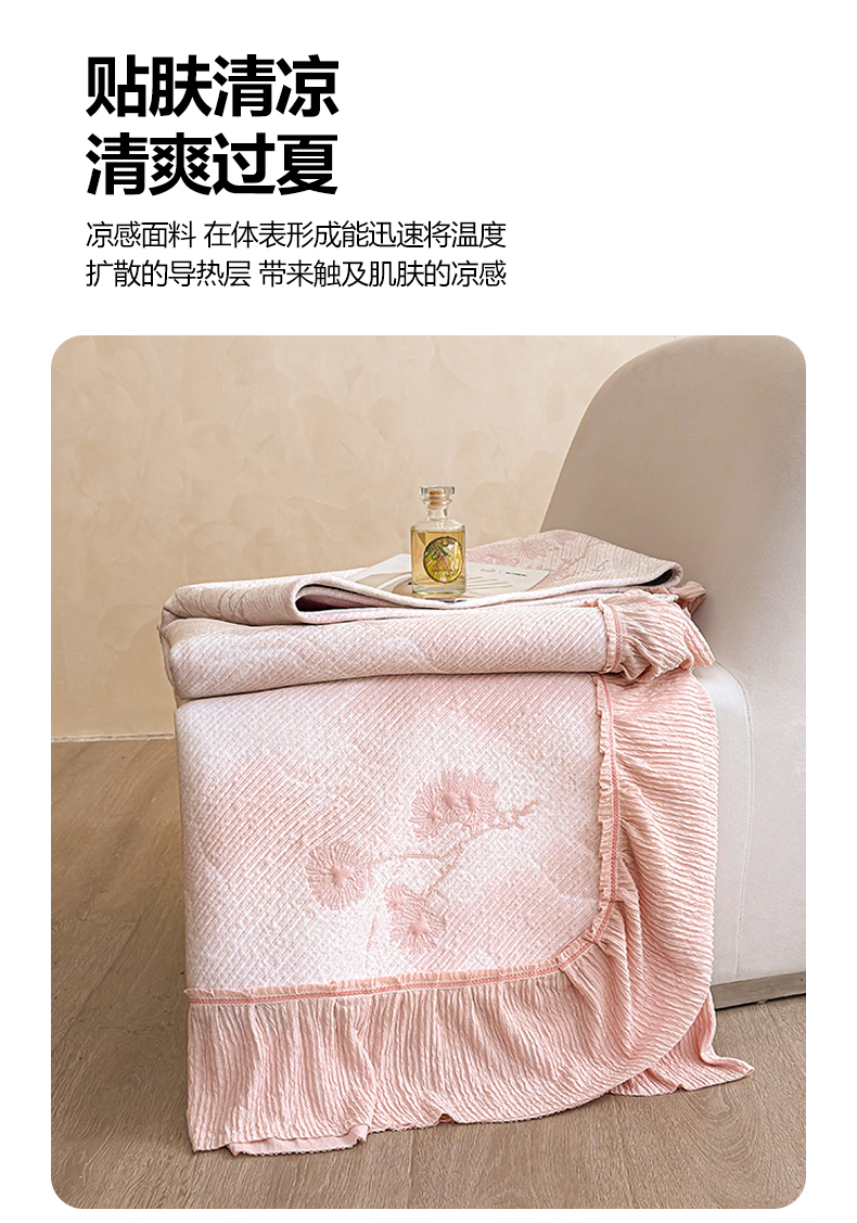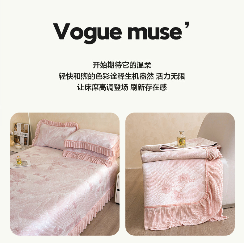 商品名称:慕木家纺 2026新款A类乙纶双面提花560克冰豆豆花边床盖款床裙迎客松系列(提供买家秀) 迎客松-粉