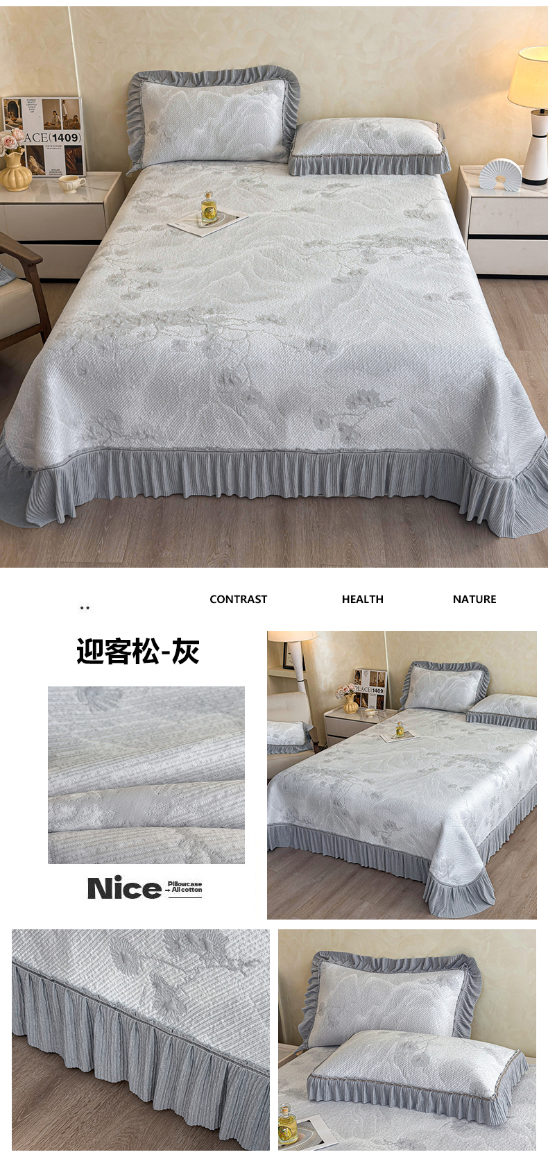 (总)慕木家纺 2026新款A类乙纶双面提花560克冰豆豆花边床盖款床裙迎客松系列(提供买家秀),迎客松-蓝,迎客松-绿,迎客松-粉,迎客松-灰