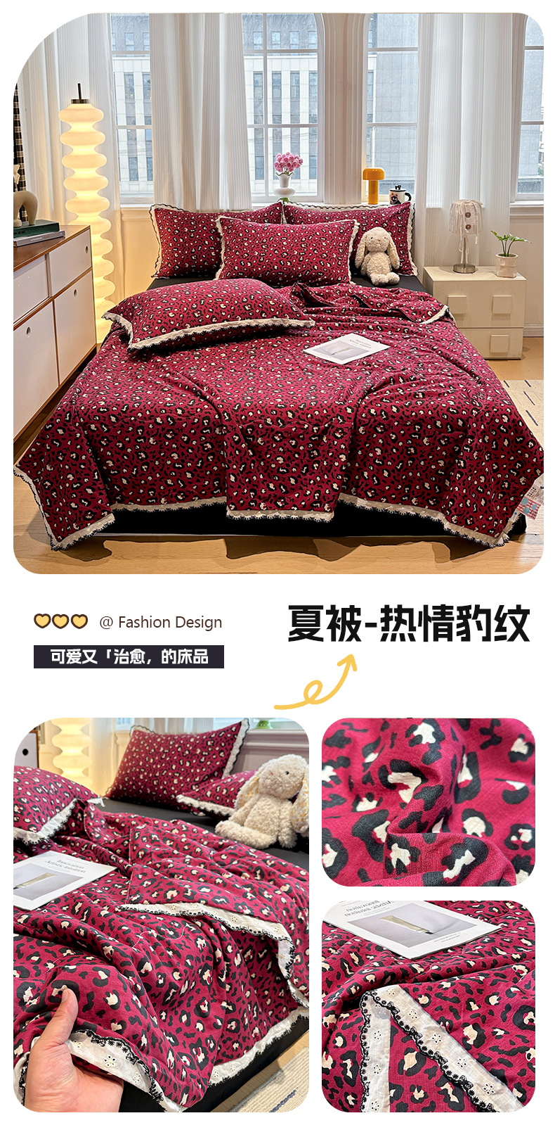 • 91家纺网 家纺一手货源 找家纺 花伞家居 2026新款蕾丝花边皱皱双层纱夏被四件套含买家秀 夏被-豹纹灰