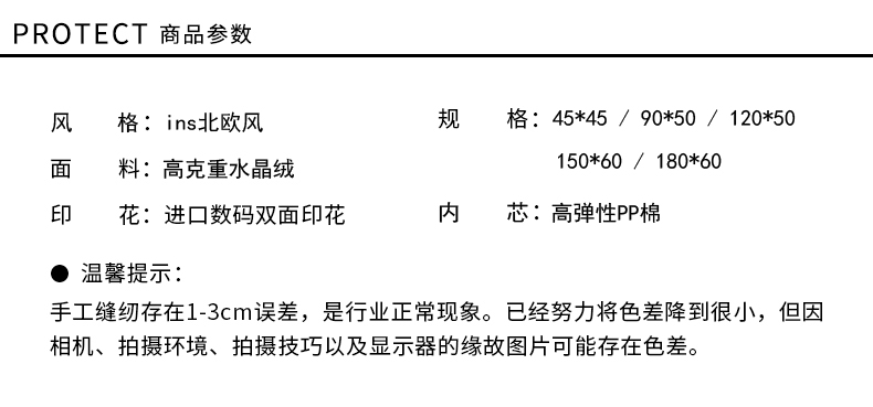 [{"sp_id":11,"sp_name":"\u989c\u8272\u5206\u7c7b","sp_format":2,"sp_list":[{"sp_value_id":651,"sp_value_name":"\u7c89\u767d\u62fc\u63a5","sp_value_image":{"id":999,"path":"https:\/\/img3.91jf.com\/qcloud\/goods\/6346\/20180929015423783.jpg_30_30.jpg"},"sp_value_video":{"id":0,"img":"","path":"","time":0,"download_num":0,"play_num":0},"price":"26.00","storage":497,"weight":"0.600","is_check_weight":0,"plus_price":"","sp_sort":21364546}]},{"sp_id":21,"sp_name":"\u5c3a\u5bf8","sp_format":1,"sp_list":[{"sp_value_id":165,"sp_value_name":"45x45cm","sp_value_image":{"id":0,"path":""},"sp_value_video":{"id":0,"img":"","path":"","time":0,"download_num":0,"play_num":0},"price":"26.00","storage":98,"weight":"0.600","is_check_weight":0,"plus_price":"","sp_sort":21364546},{"sp_value_id":168,"sp_value_name":"150X60cm","sp_value_image":{"id":0,"path":""},"sp_value_video":{"id":0,"img":"","path":"","time":0,"download_num":0,"play_num":0},"price":"70.00","storage":100,"weight":"2.600","is_check_weight":0,"plus_price":"","sp_sort":21364548},{"sp_value_id":169,"sp_value_name":"180x60cm","sp_value_image":{"id":0,"path":""},"sp_value_video":{"id":0,"img":"","path":"","time":0,"download_num":0,"play_num":0},"price":"80.00","storage":100,"weight":"4.200","is_check_weight":0,"plus_price":"","sp_sort":21364549},{"sp_value_id":167,"sp_value_name":"120X50cm","sp_value_image":{"id":0,"path":""},"sp_value_video":{"id":0,"img":"","path":"","time":0,"download_num":0,"play_num":0},"price":"60.00","storage":99,"weight":"2.000","is_check_weight":0,"plus_price":"","sp_sort":21364550},{"sp_value_id":166,"sp_value_name":"90X50cm","sp_value_image":{"id":0,"path":""},"sp_value_video":{"id":0,"img":"","path":"","time":0,"download_num":0,"play_num":0},"price":"50.00","storage":100,"weight":"1.500","is_check_weight":0,"plus_price":"","sp_sort":21364551}]}]