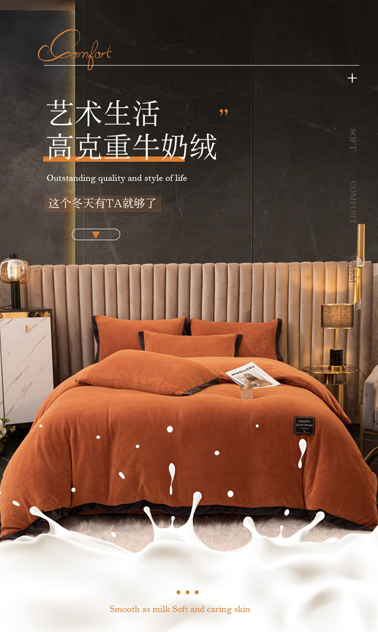 商品名称:大米家居 新款高克重宽边牛奶宝宝绒法莱亲肤绒四件套荣耀爱马橙