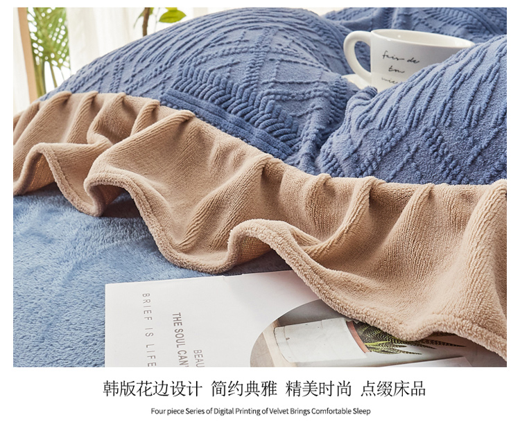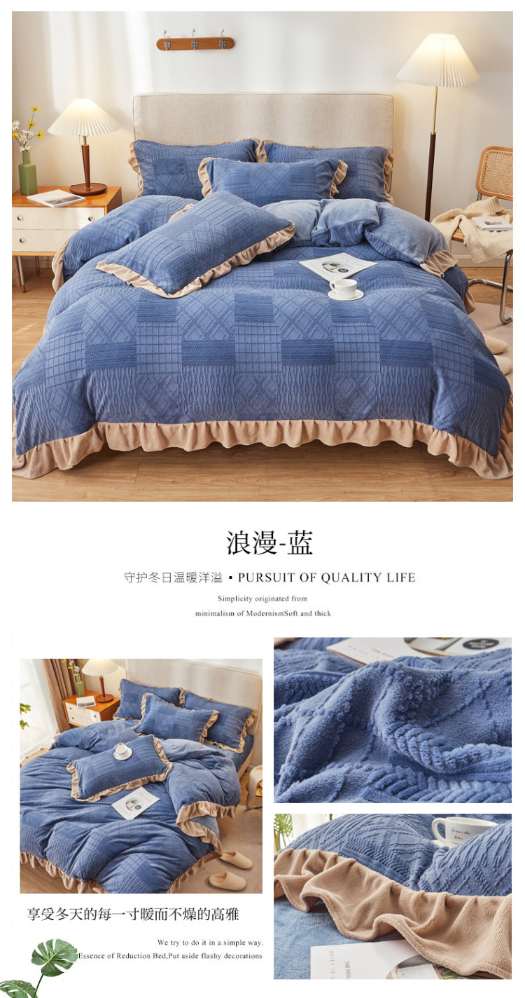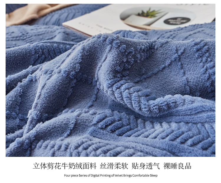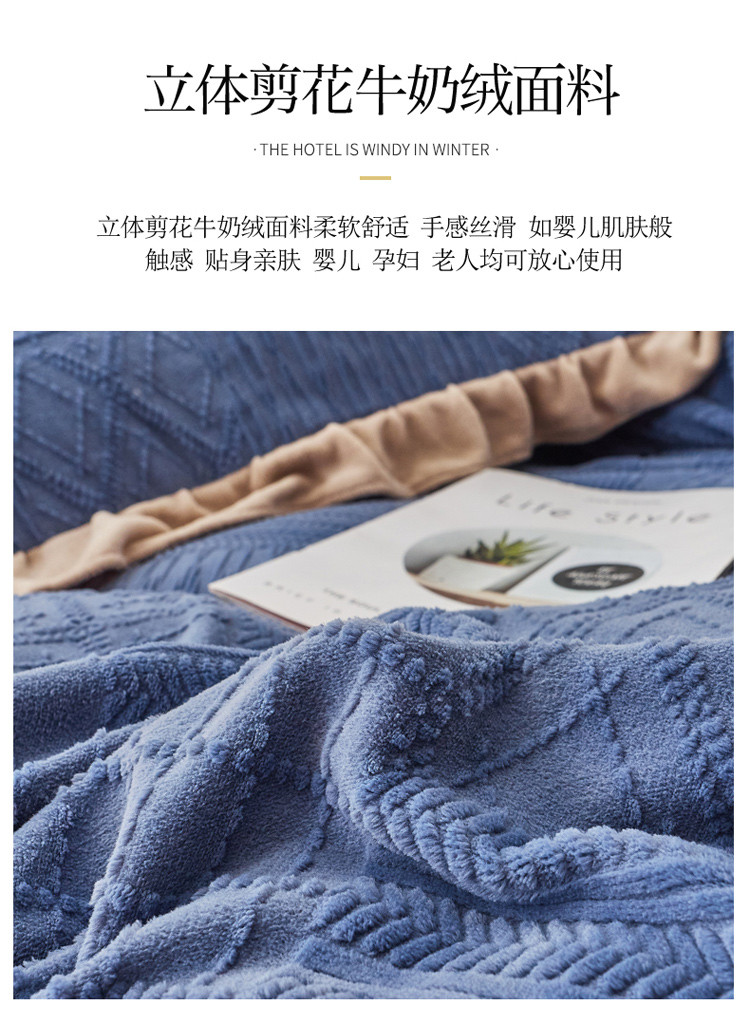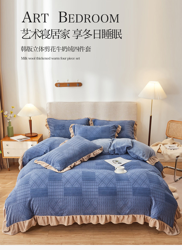 当前位置: 91家纺网 > 商品网购 > 床品套件 > 四件套 > 牛奶绒四件套 > 寐居2021新款韩版立体剪花牛奶绒四件套 浪漫-蓝