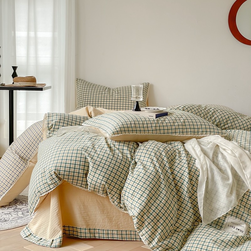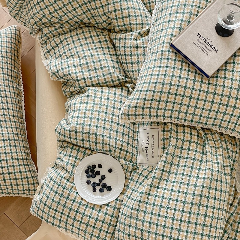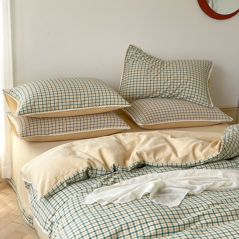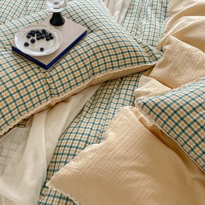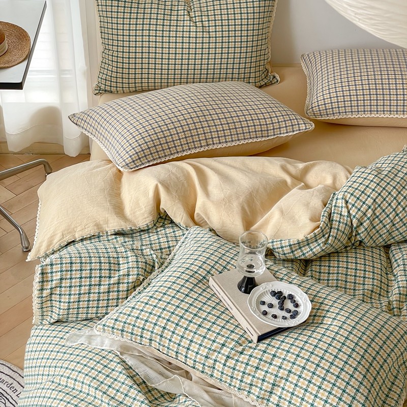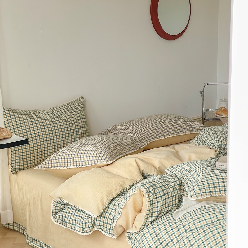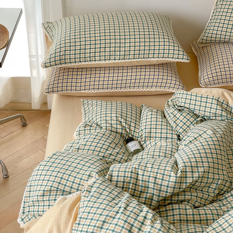 商品名称:圆岛 2022新款色织小提花花边款全棉水洗棉四件套 豆绿拼黄