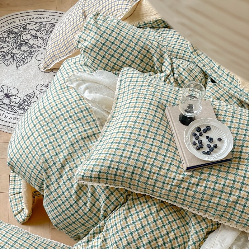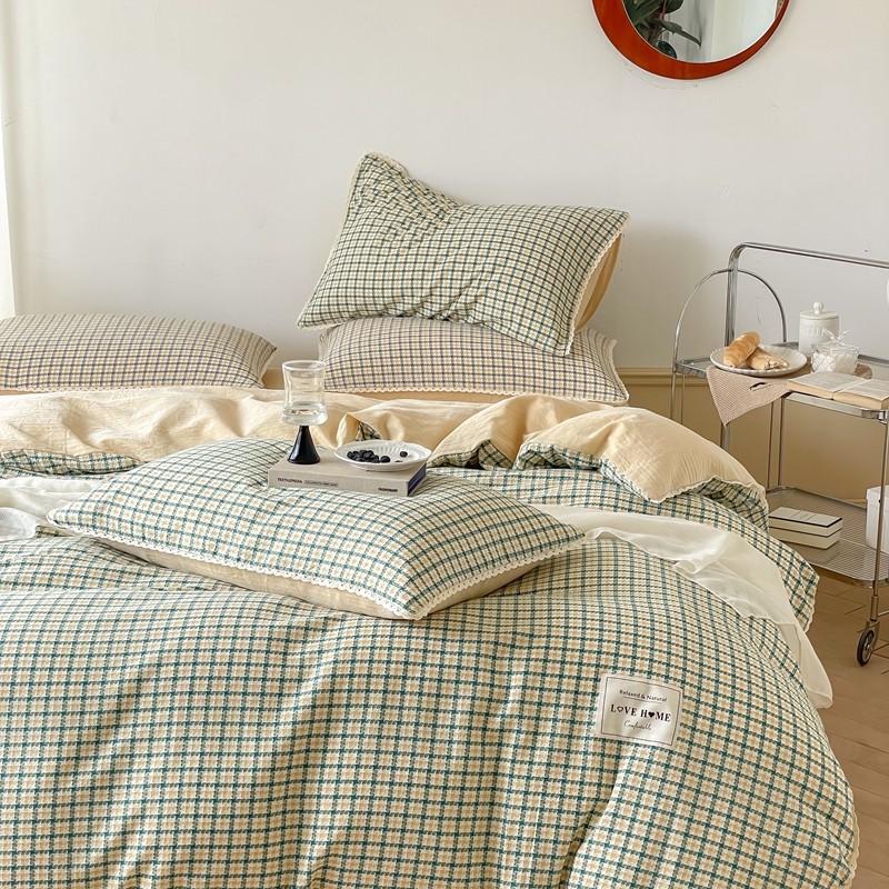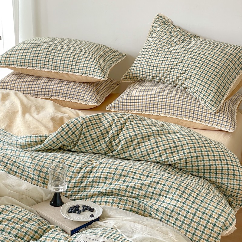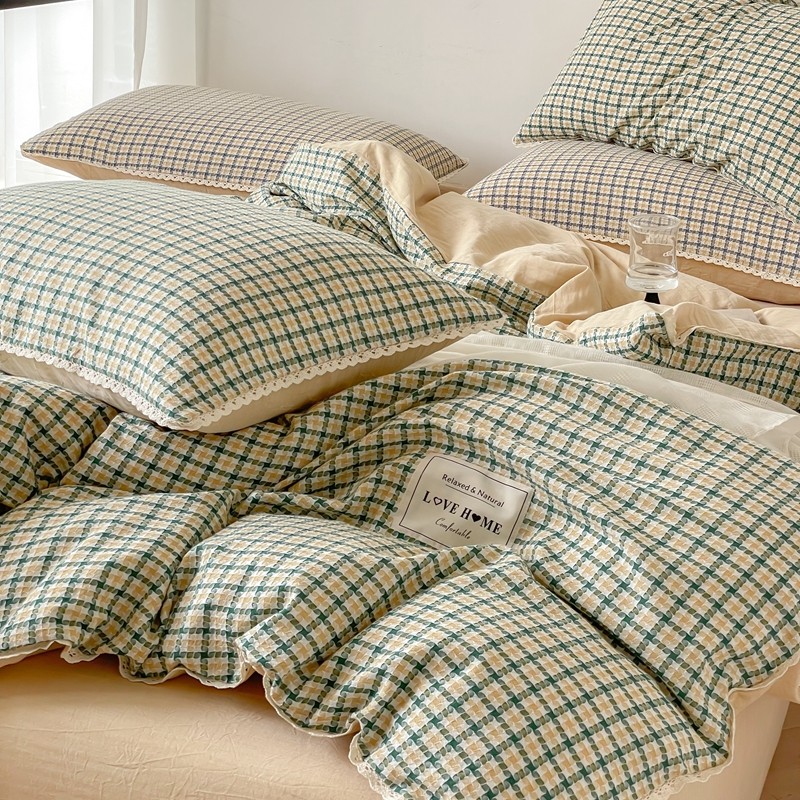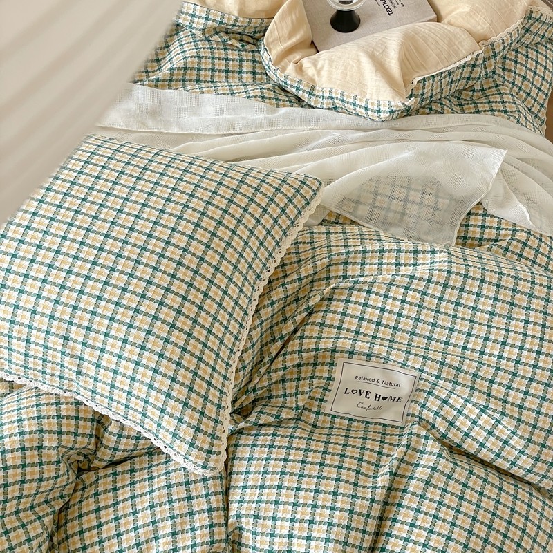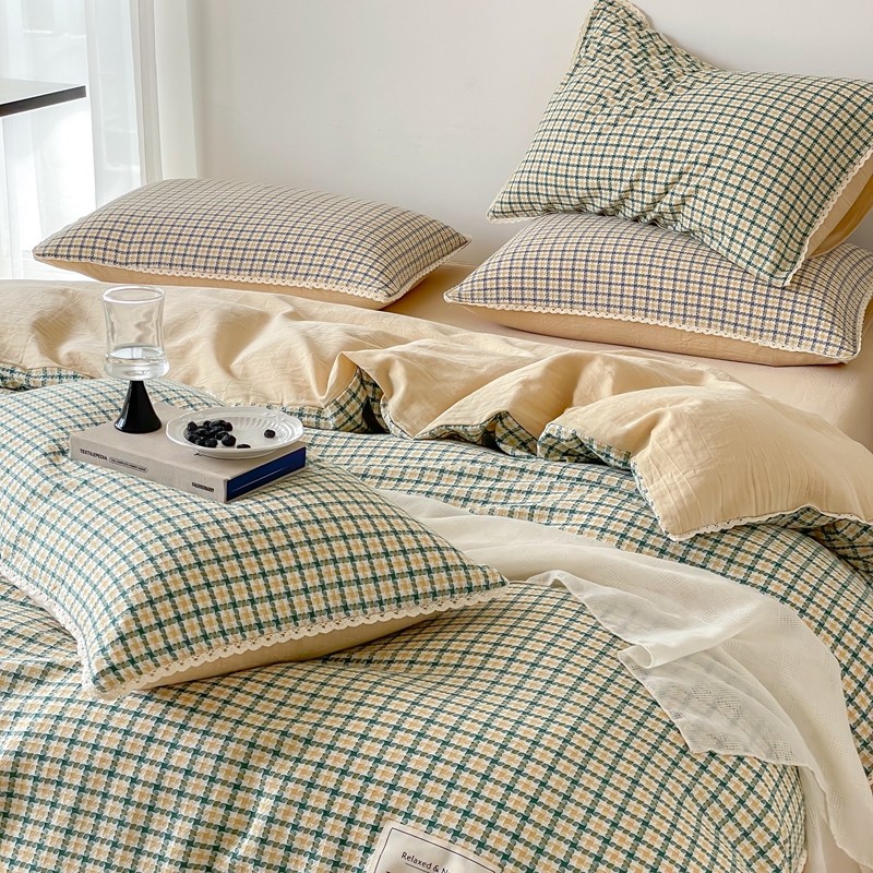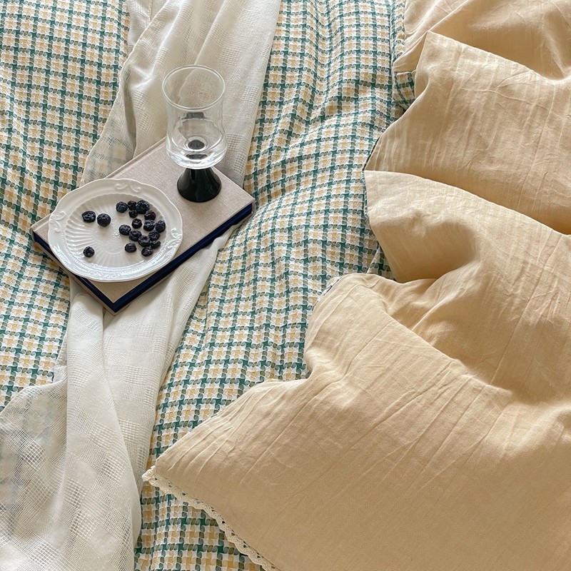 商品名称:圆岛 2022新款色织小提花花边款全棉水洗棉四件套 豆绿拼黄