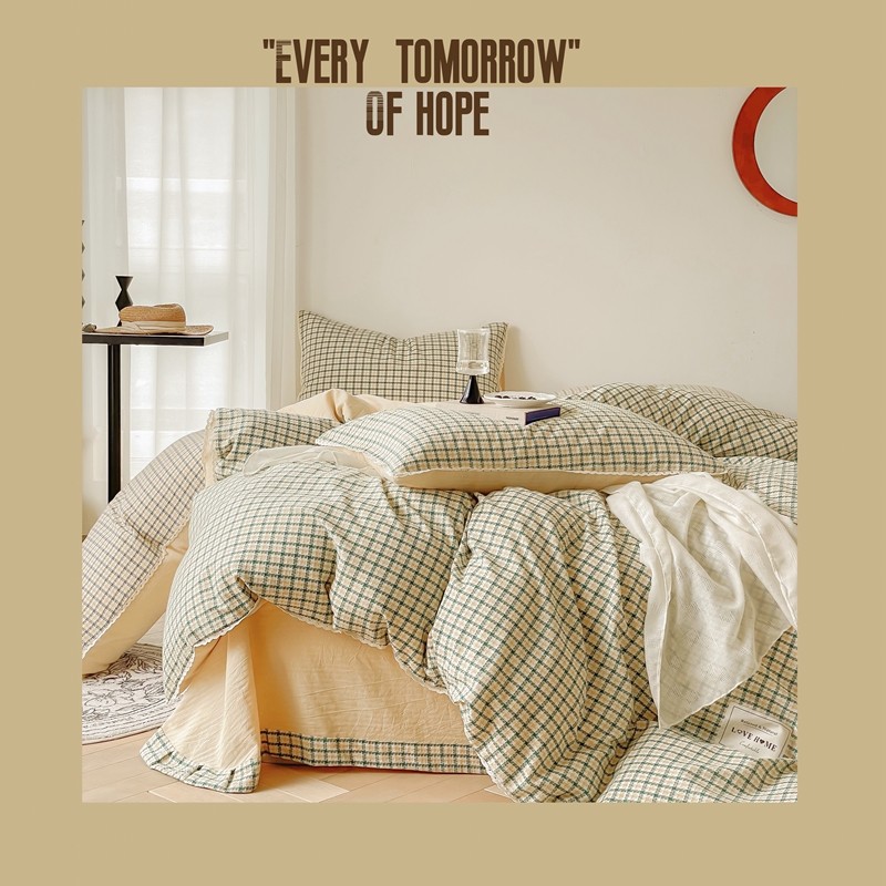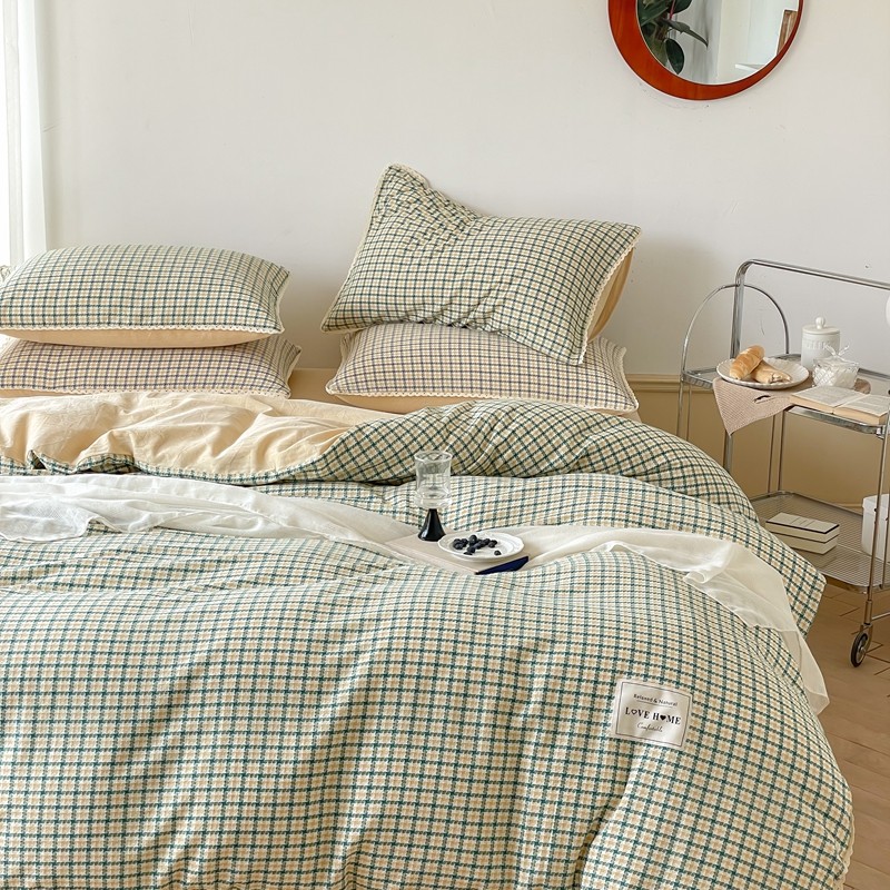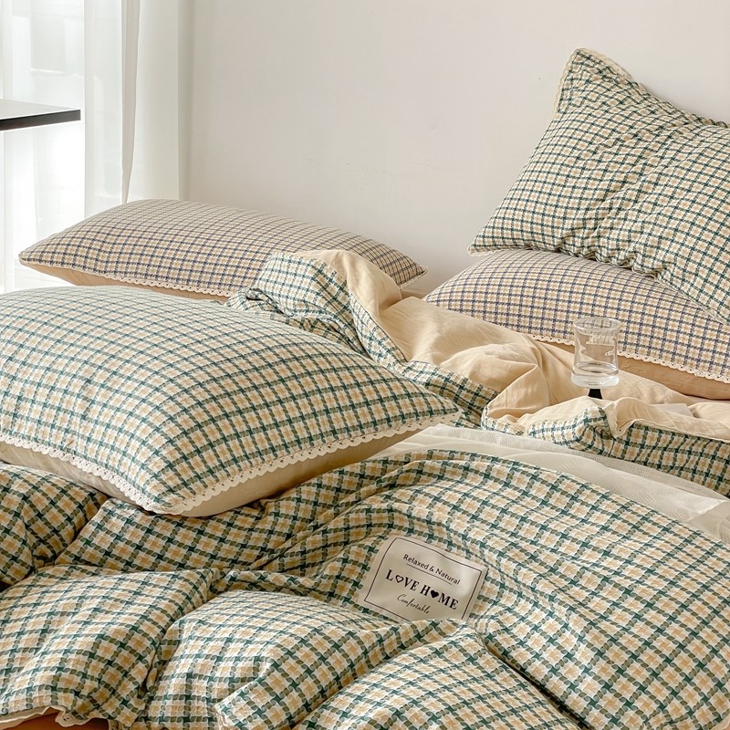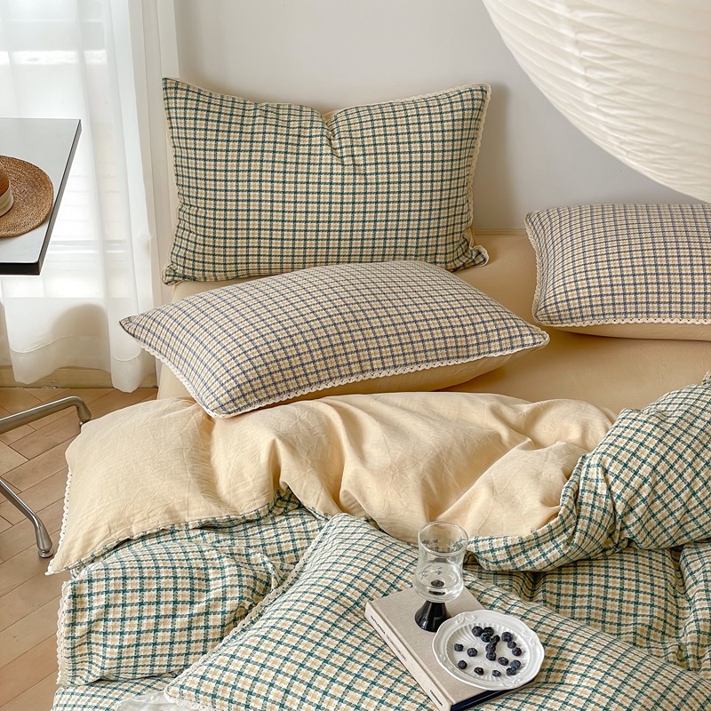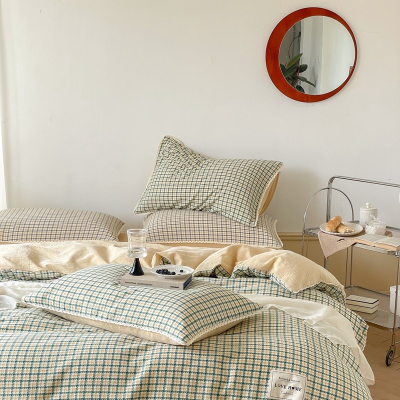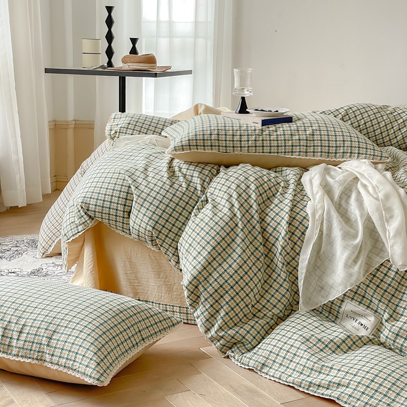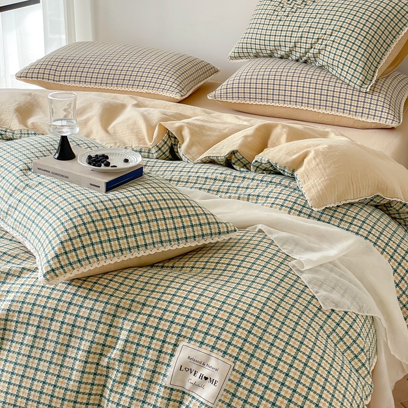 商品名称:圆岛 2022新款色织小提花花边款全棉水洗棉四件套 豆绿拼黄