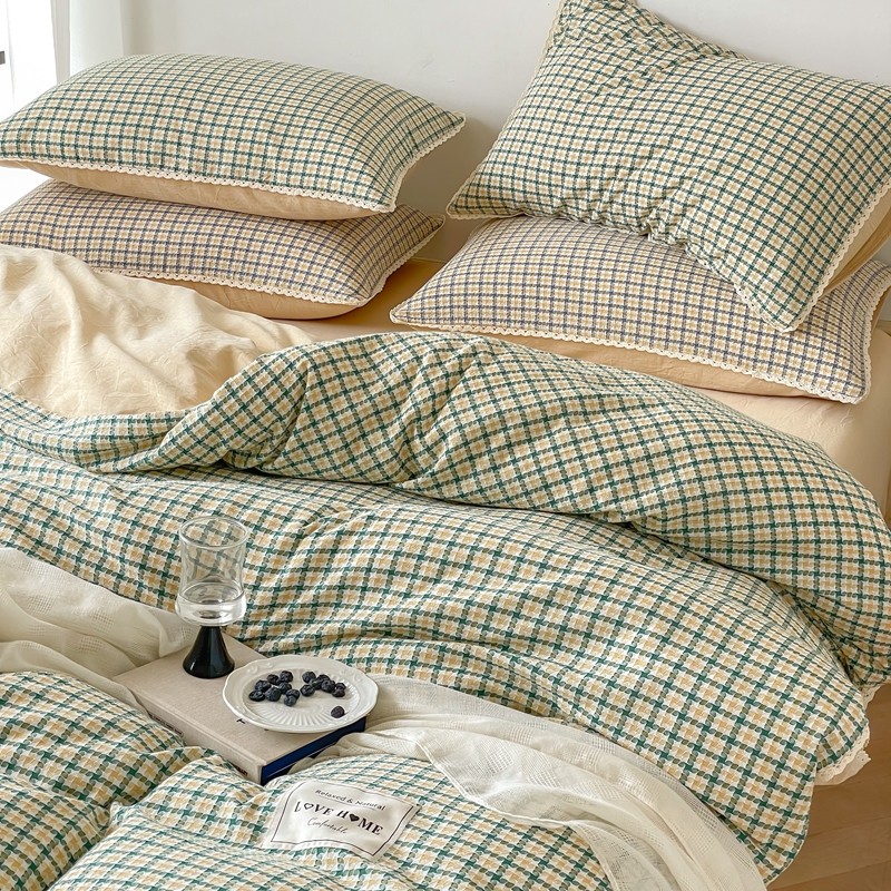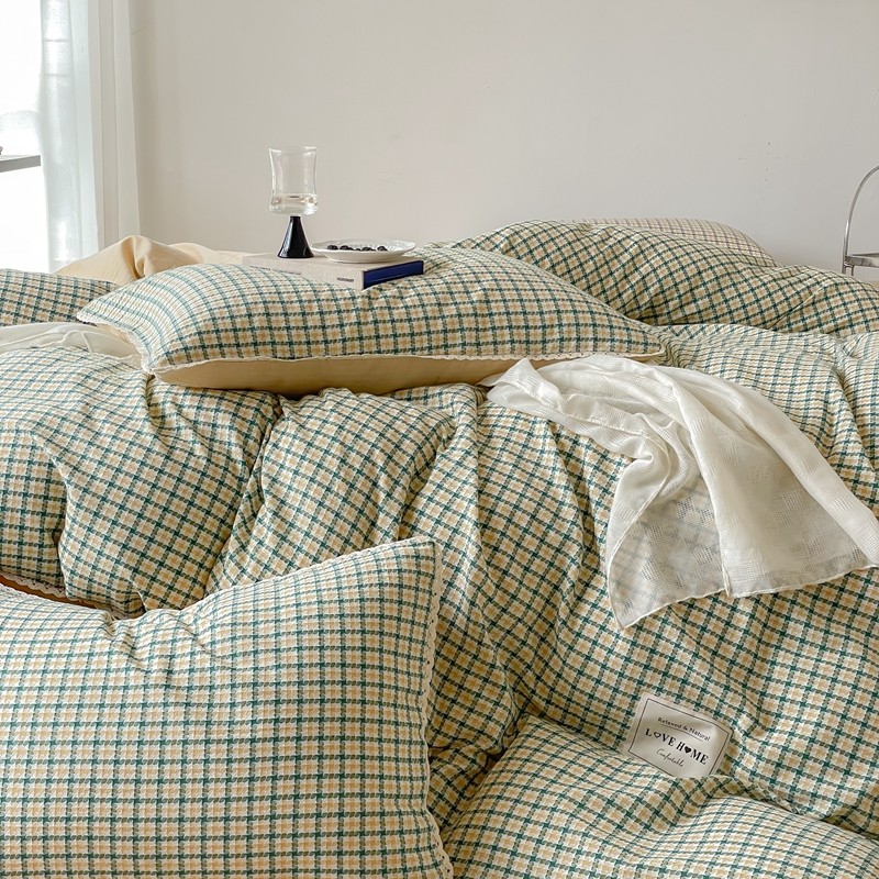 圆岛 2022新款色织小提花花边款全棉水洗棉四件套 豆绿拼黄