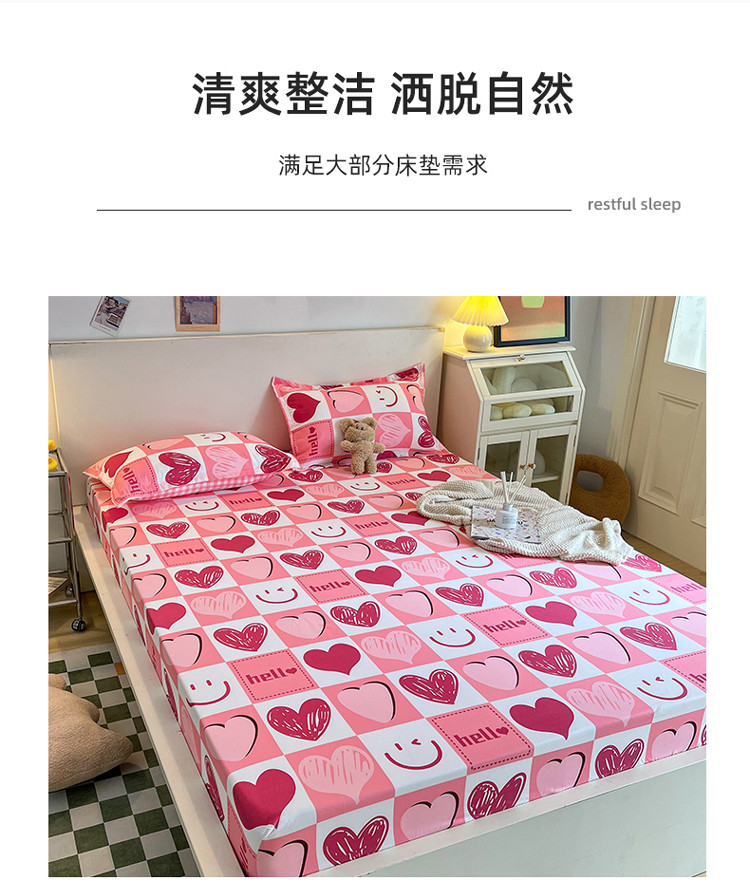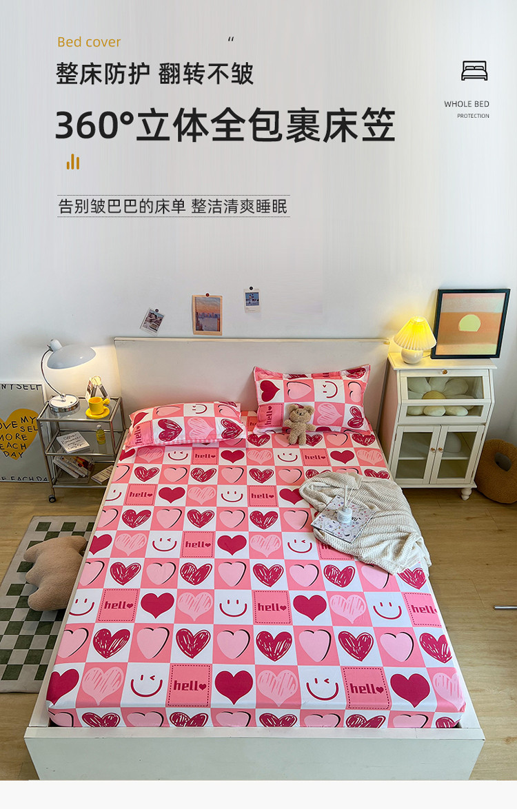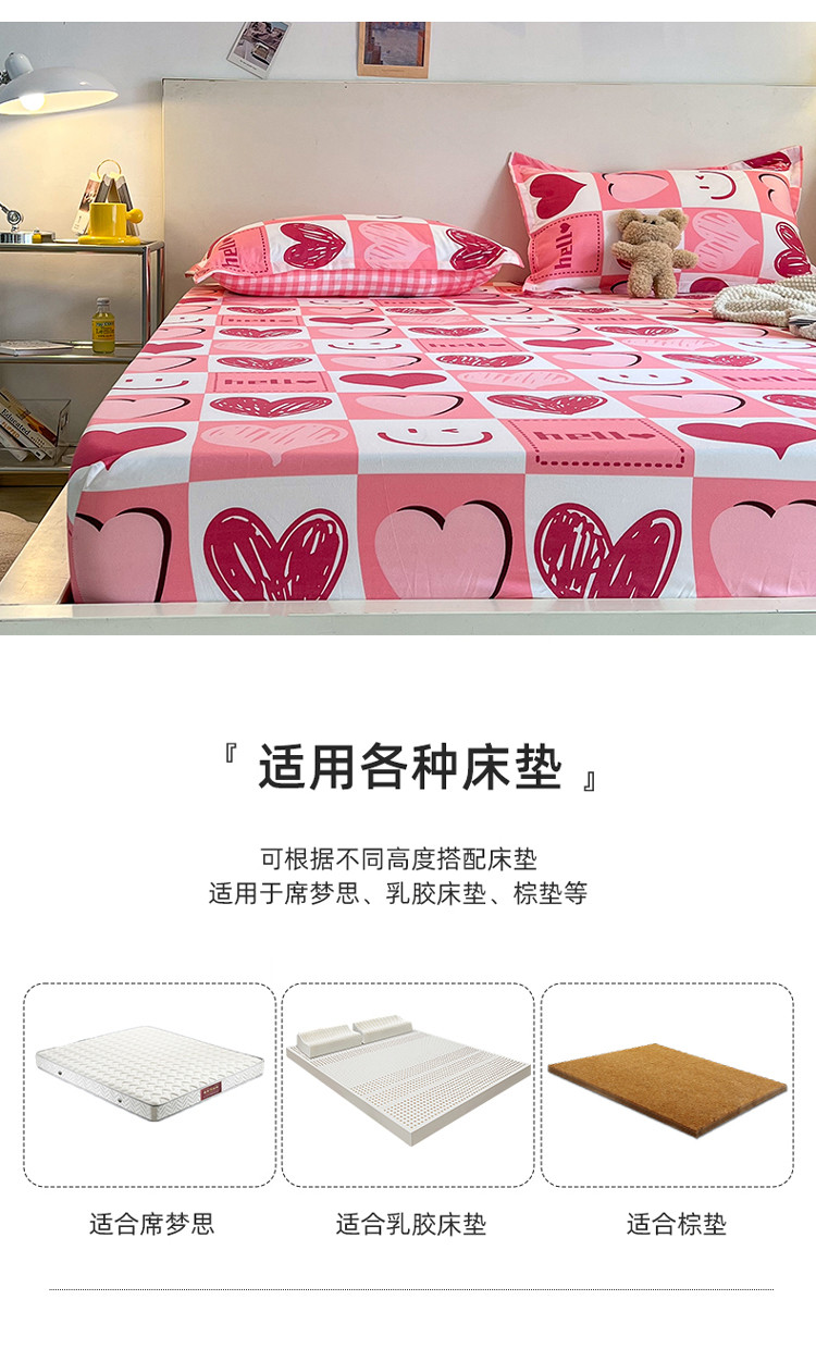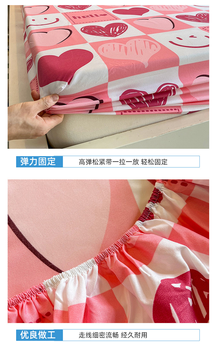宏源家纺 2022新款亲肤棉芦荟棉单床笠 粉格爱心
