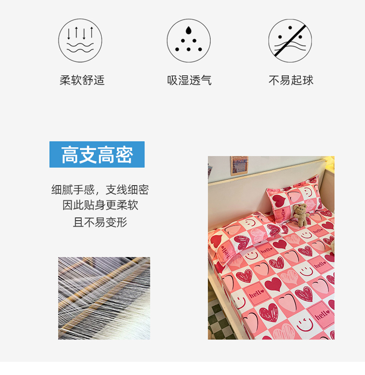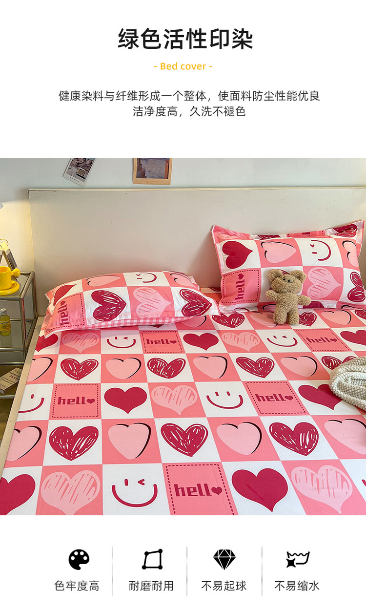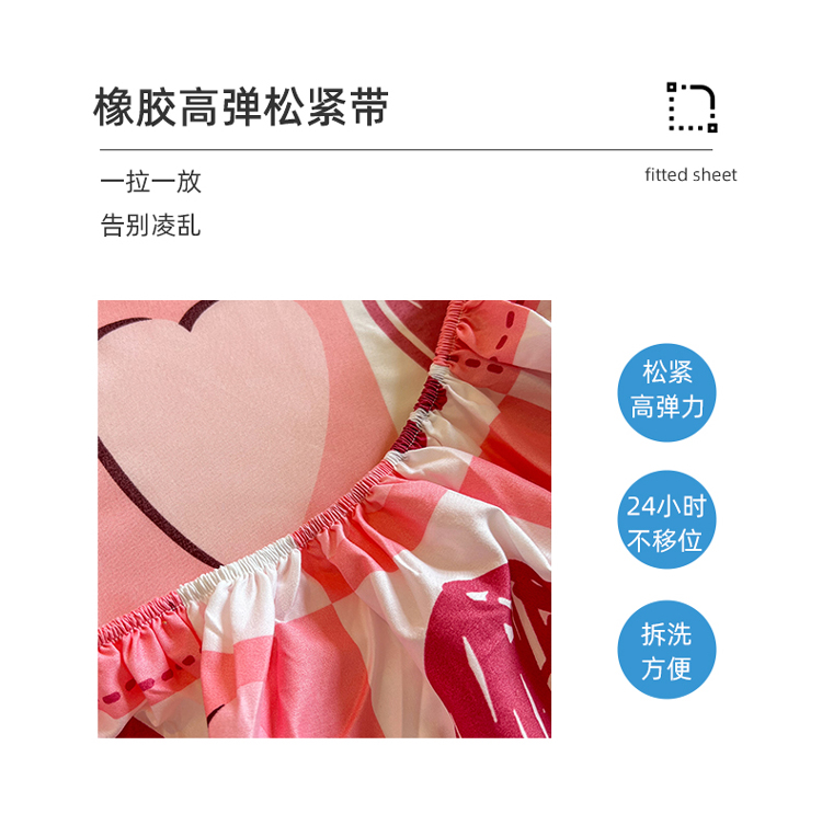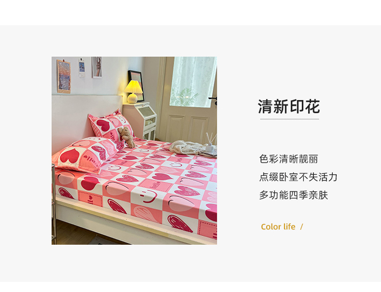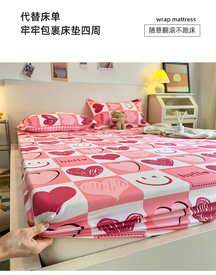 宏源家纺 2022新款亲肤棉芦荟棉单床笠 粉格爱心