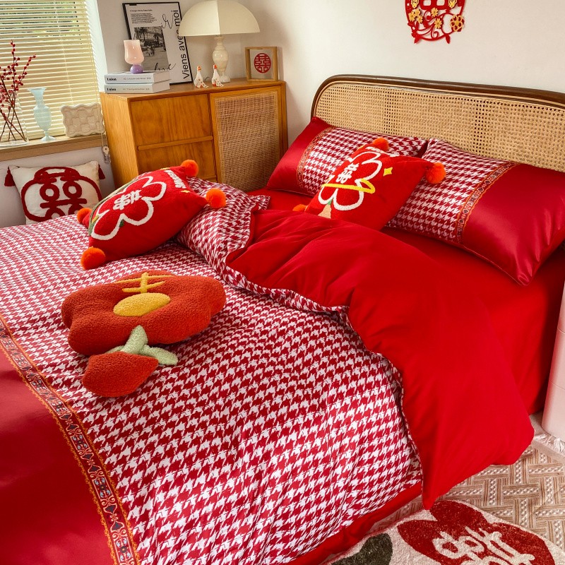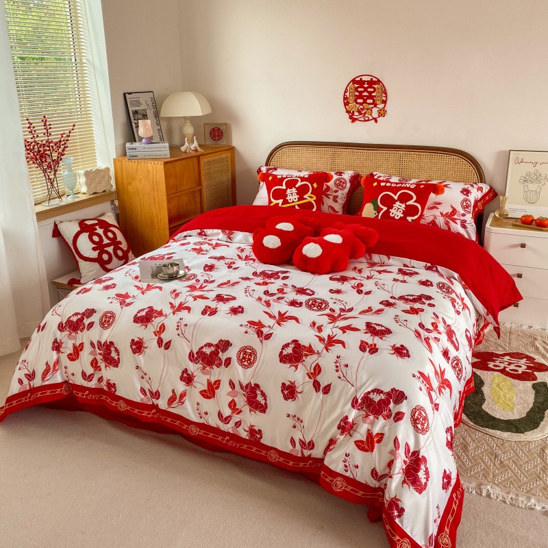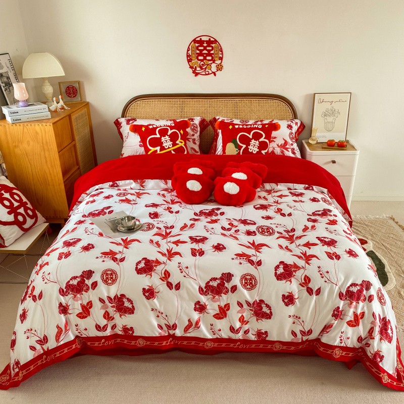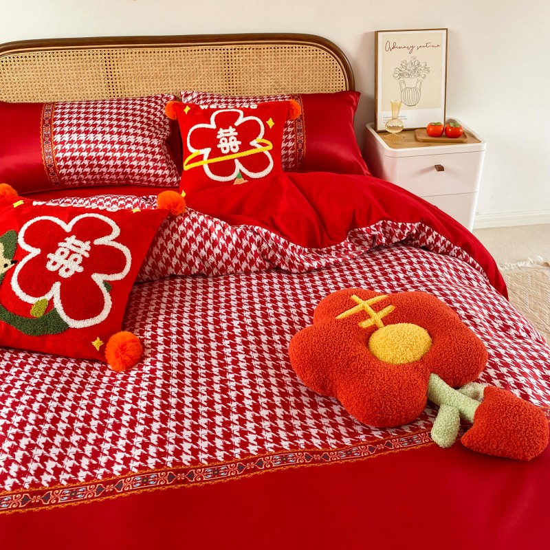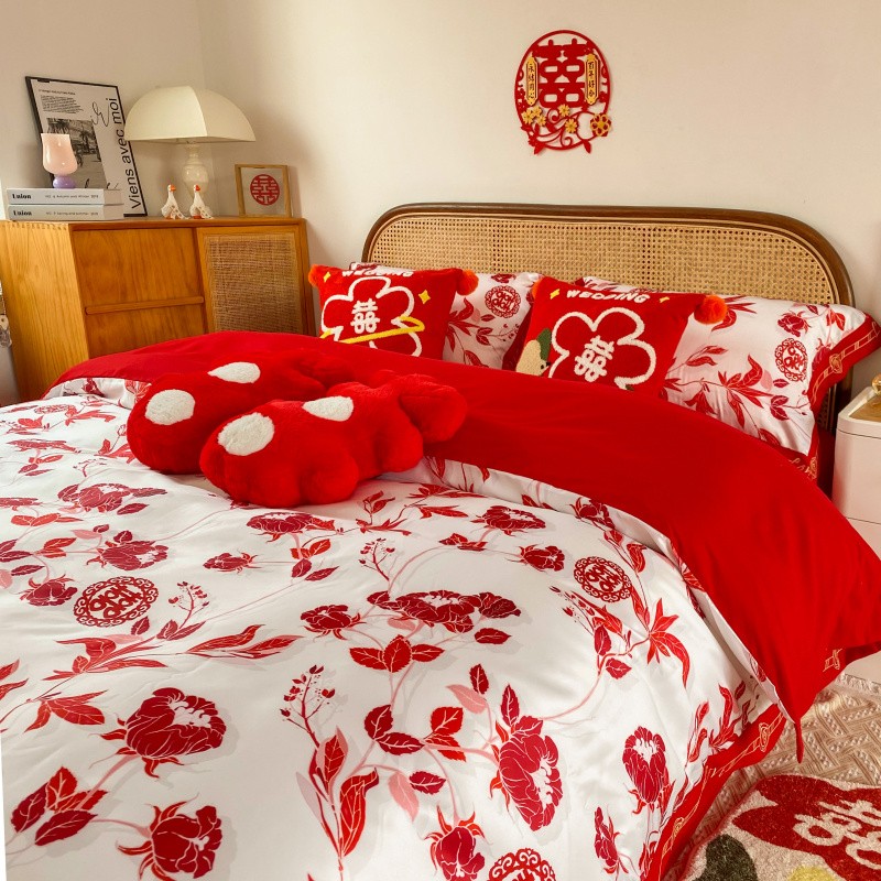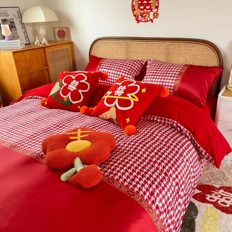 (总)用心 2025年新款牛奶绒宝宝绒花边贴布婚庆四件套多件套,大喜,喜结良缘,喜樂,永结同心