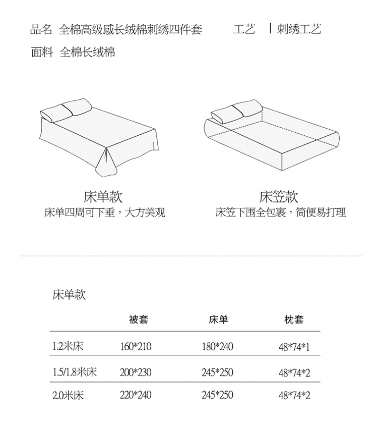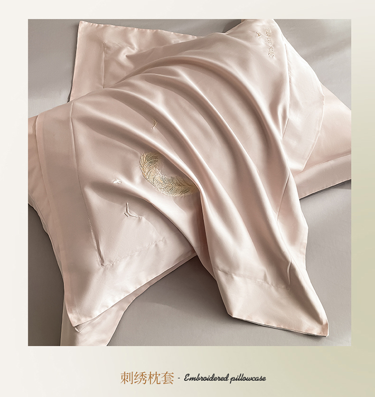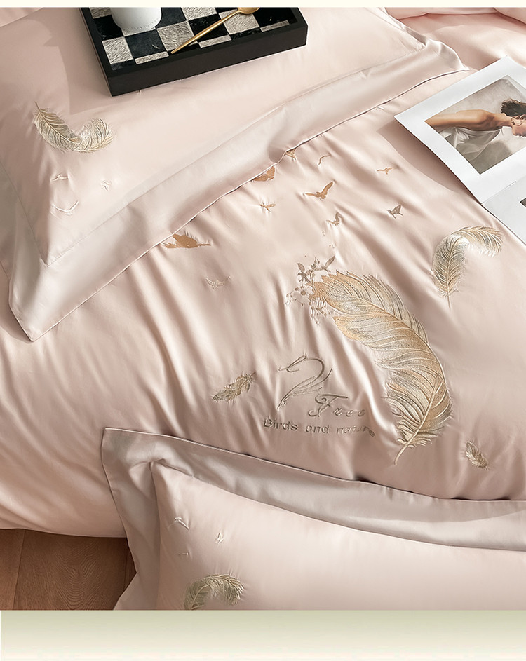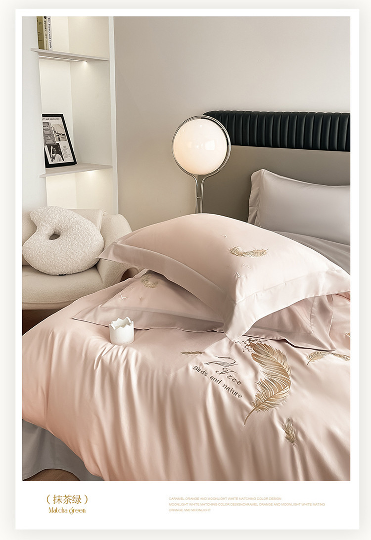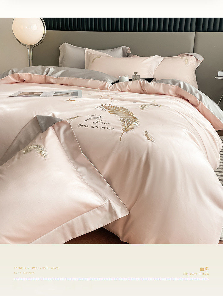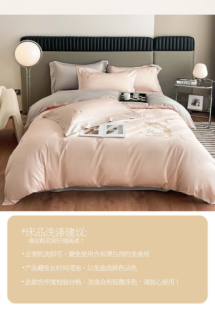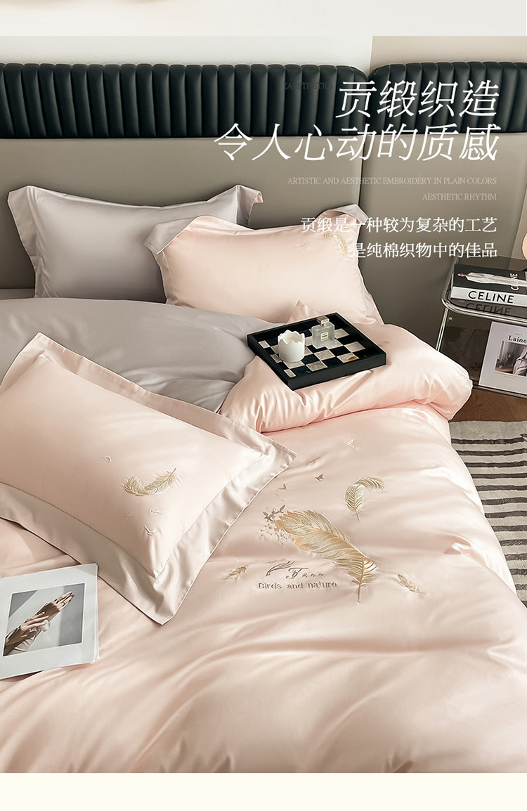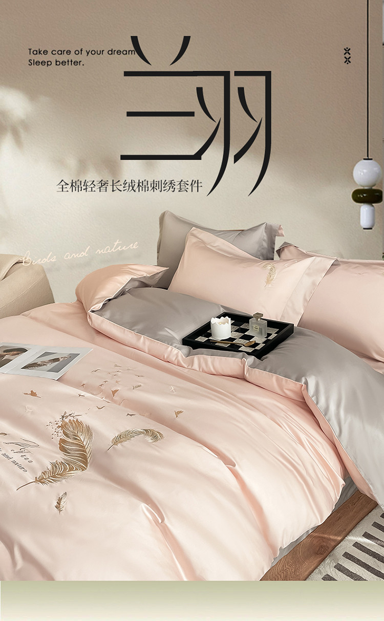 商品名称:蓝米卡夫2024新全棉高级感长绒棉刺绣四件套兰羽系列 兰羽-粉芋山灰