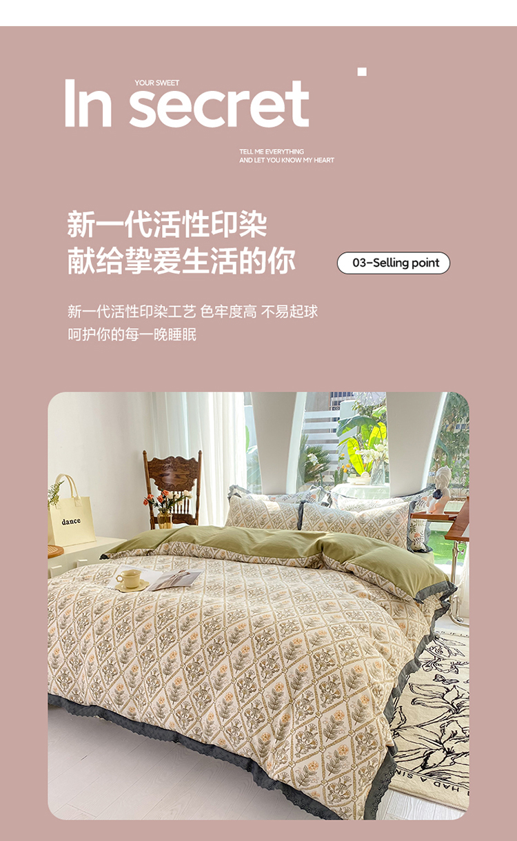 艾米家居 2025新款韩版双层花边轻奢浮雕系列水洗冰丝四件套 豆沙花边,豆沙花边
