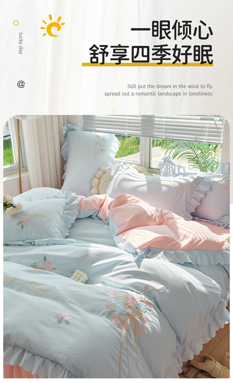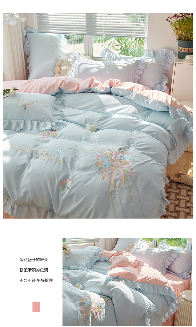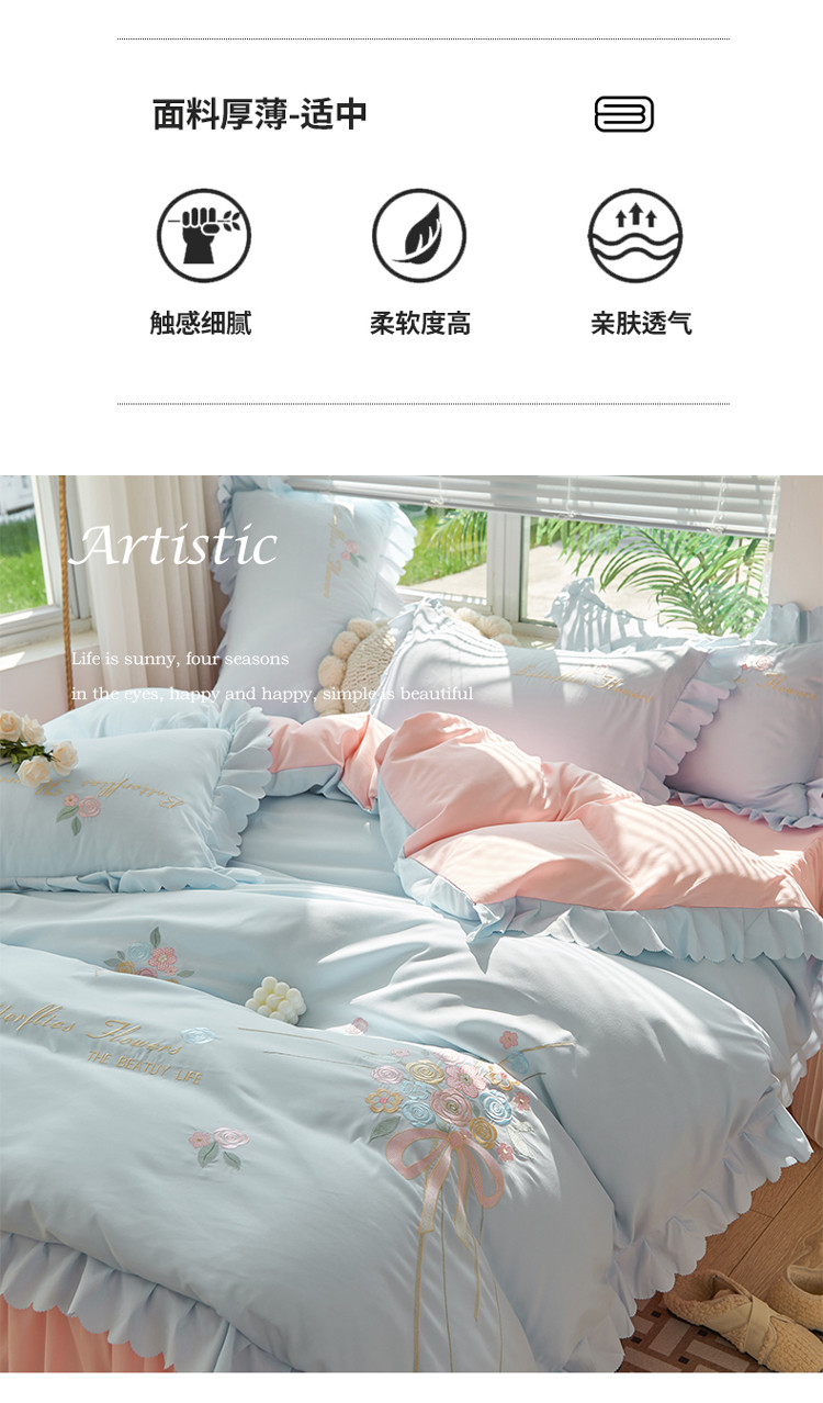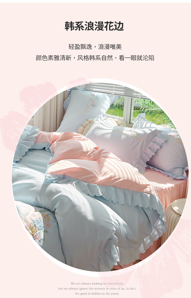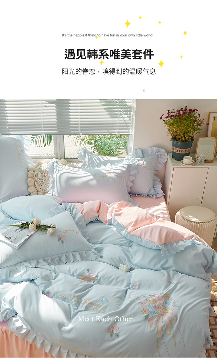 当前位置: 91家纺网 > 商品网购 > 床品套件 > 四件套 > 磨毛活性四件套 > 包小包2024春夏直播新款韩版花熙系列臻丝棉四件套花熙天空蓝提供买家秀