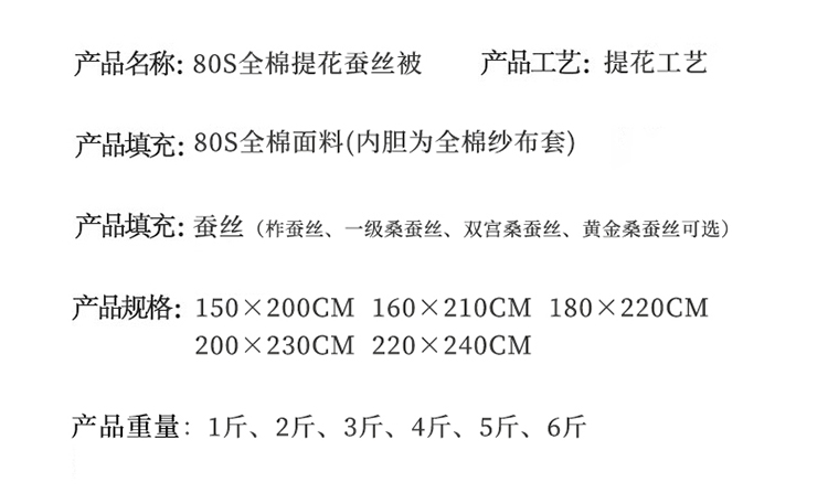 夏被建议选蚕丝净重1斤,春秋被建议选2-3斤,冬被选4斤-6斤